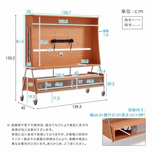 【カラー】 ナチュラル 【サイズ】 W139.3×D42×H135.2cm 【重量】 47.7kg 【素材】 メラミンボード ステンレススチール アルミニウム合金 強化ガラス 取っ手:PVC 【梱包】2梱包でお届けします。 2-1 サイズ:W148.5×D60×H16.5cm 2-2 サイズ:W139×D42×H19cm 合計重量:53kg 【その他】 テレビサイズをご確認の上ご購入いただきますようお願い致します。 テレビを取り付け、取り外しの際は必ず2~3人で行ってください。 【組み立て品】 お客様による組み立てが必要です。 【ご注意】 ・サイズ、重量は概算です。 ・商品カラーはご使用のモニターによって実際の明るさや色と異なって見える場合がございます。 |