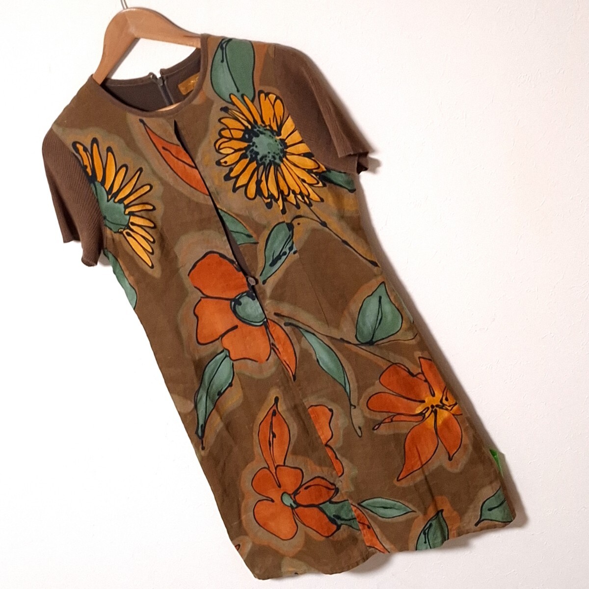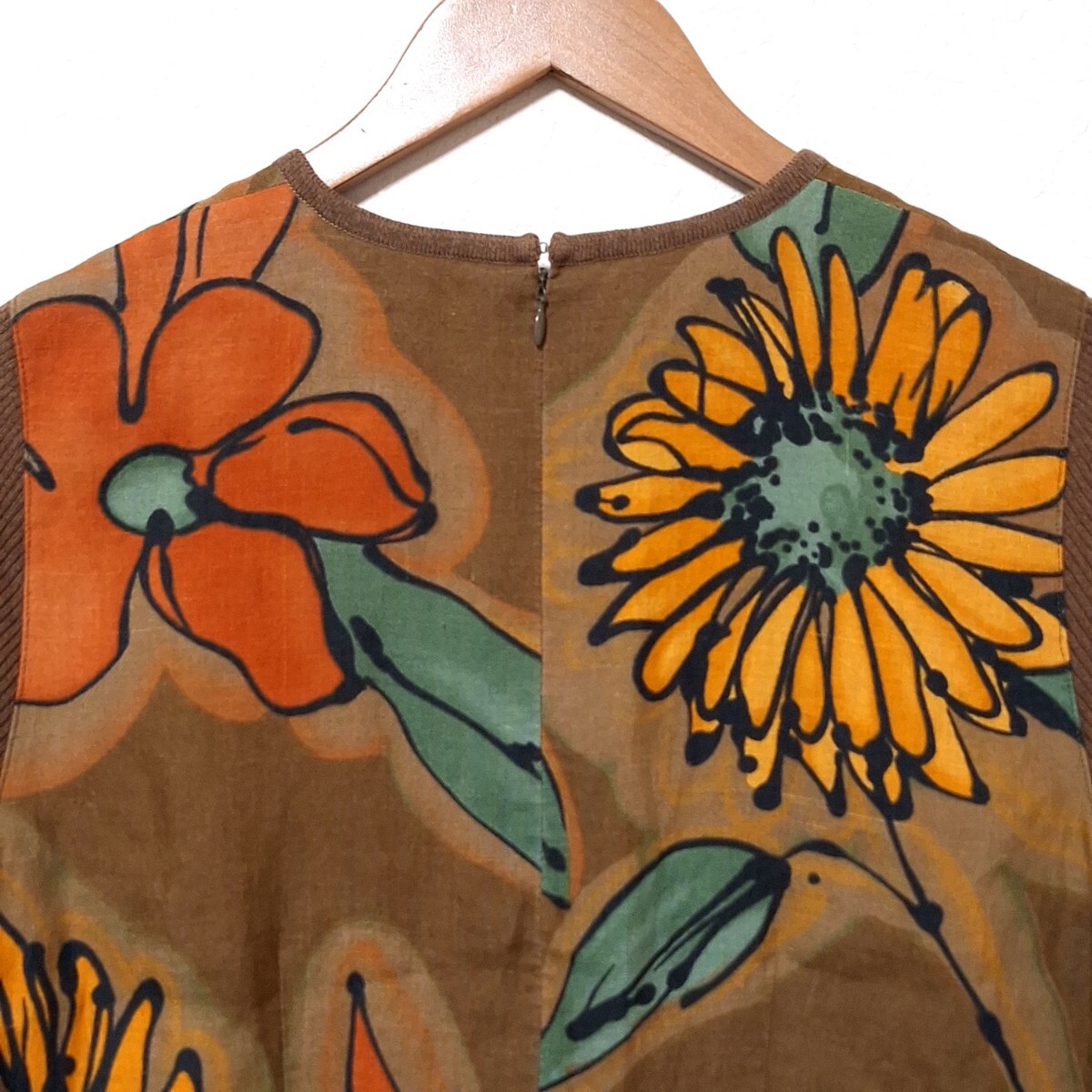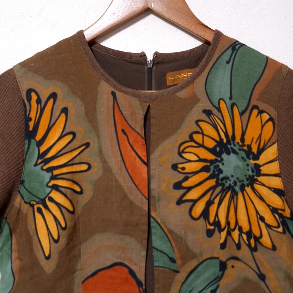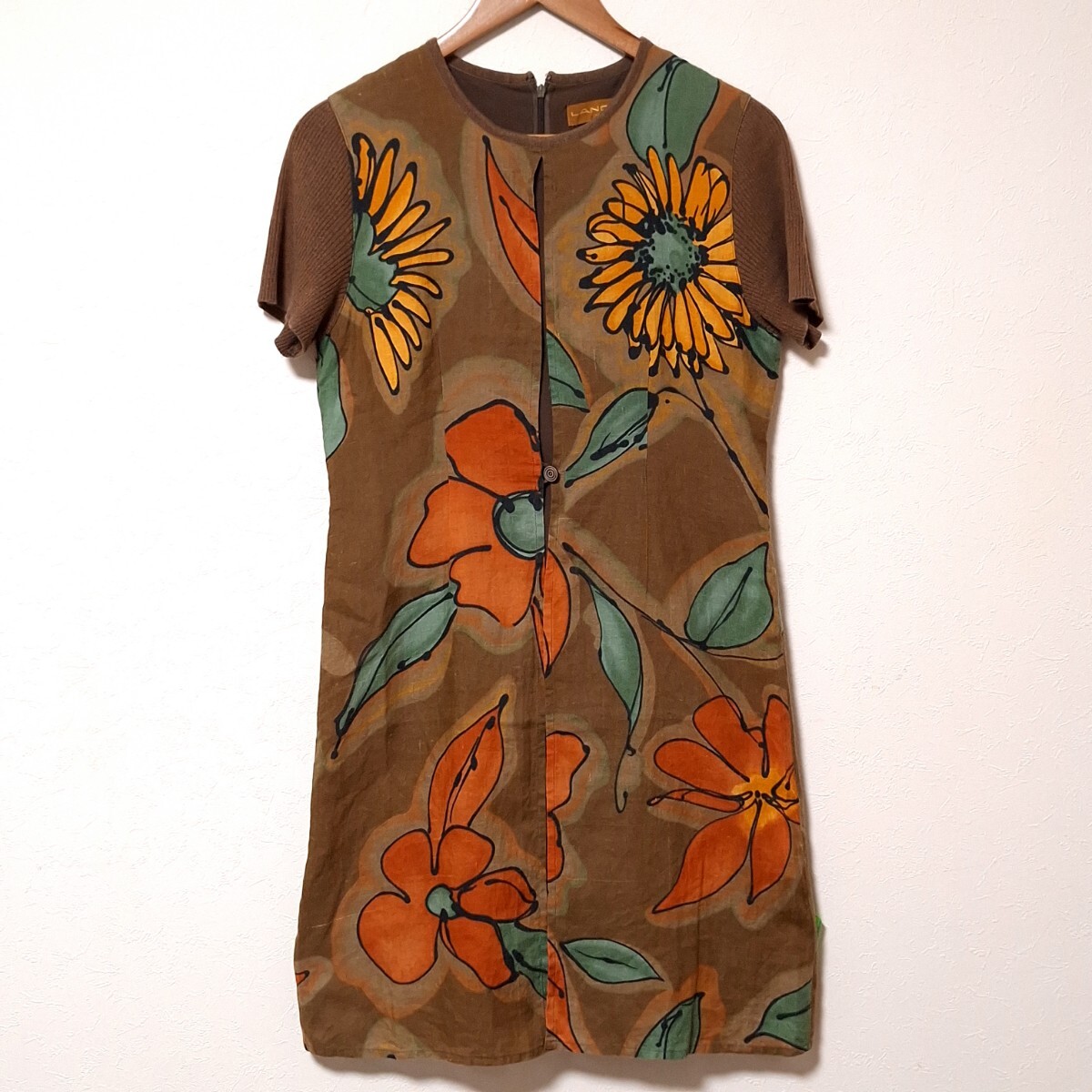 W653【 LANCEL】ランセル ワンピース 半袖 花柄 ブラウン系 レトロ リゾート ニットスリーブ 麻100% レディース サイズ9(M相当)/QQ