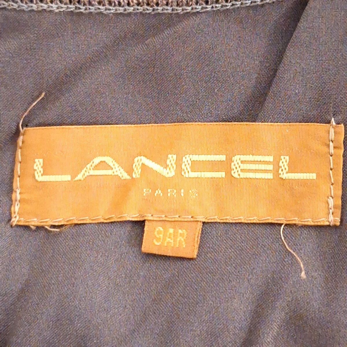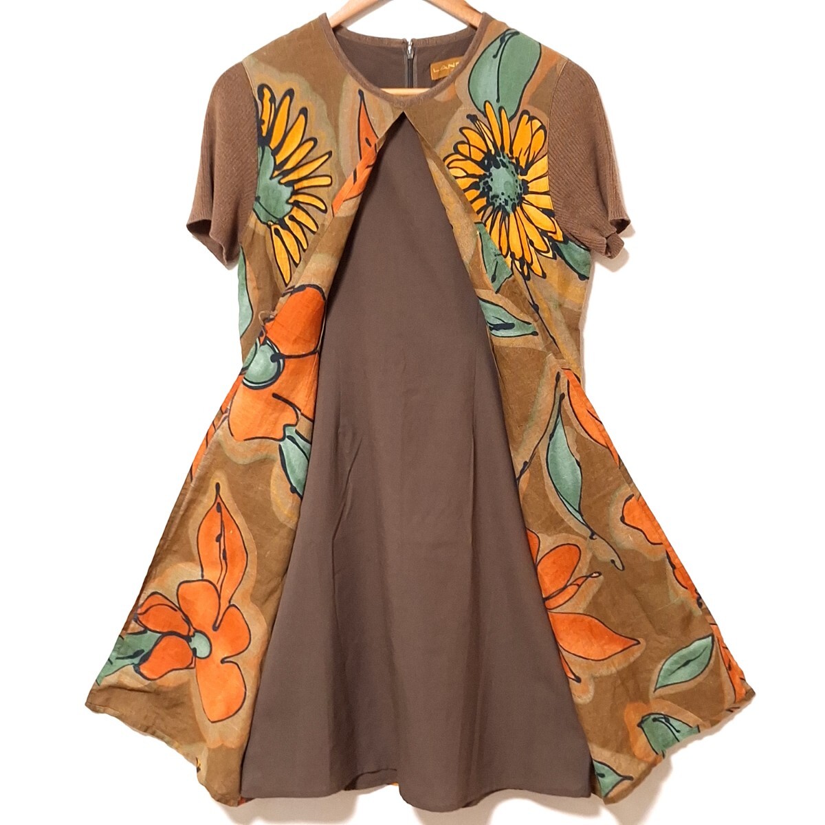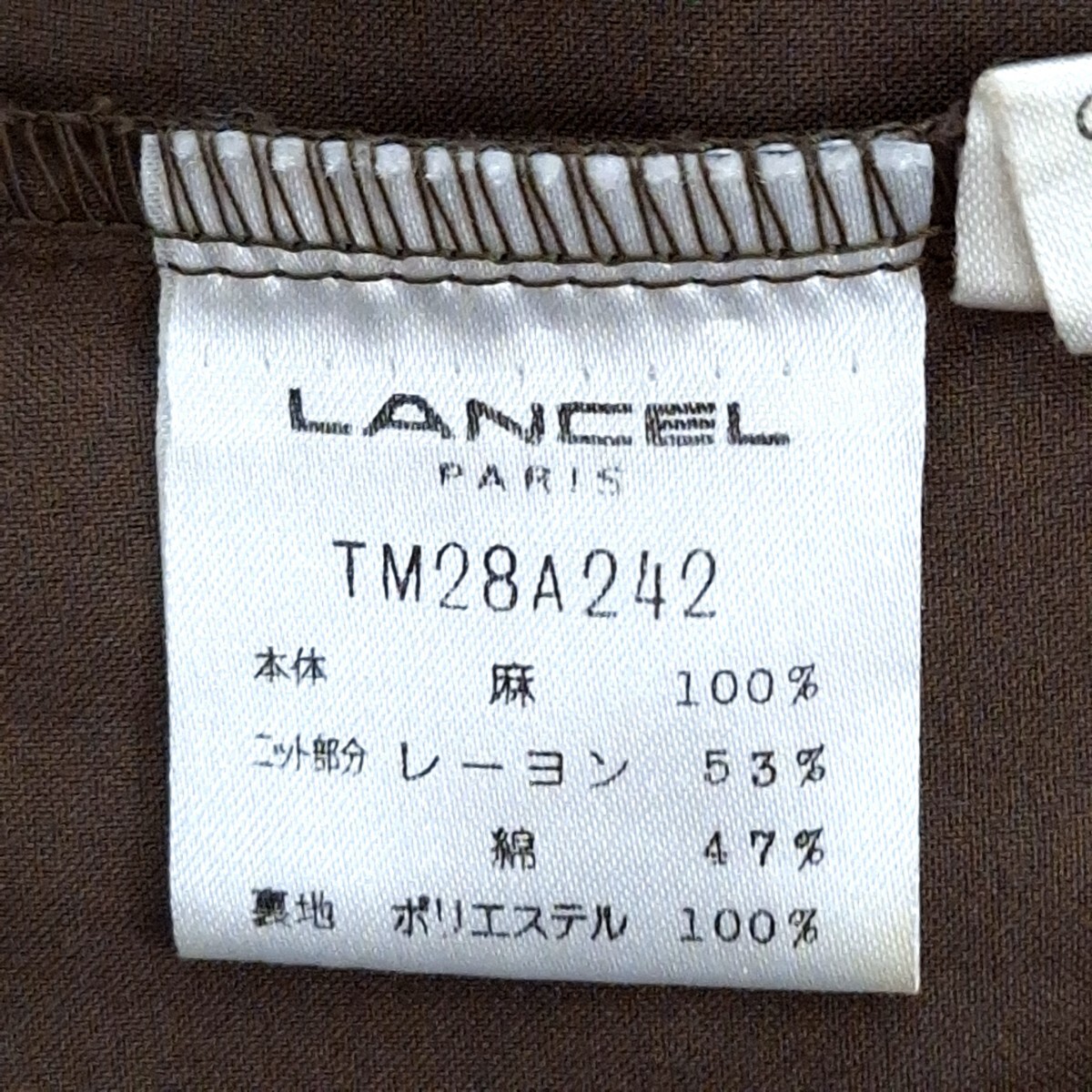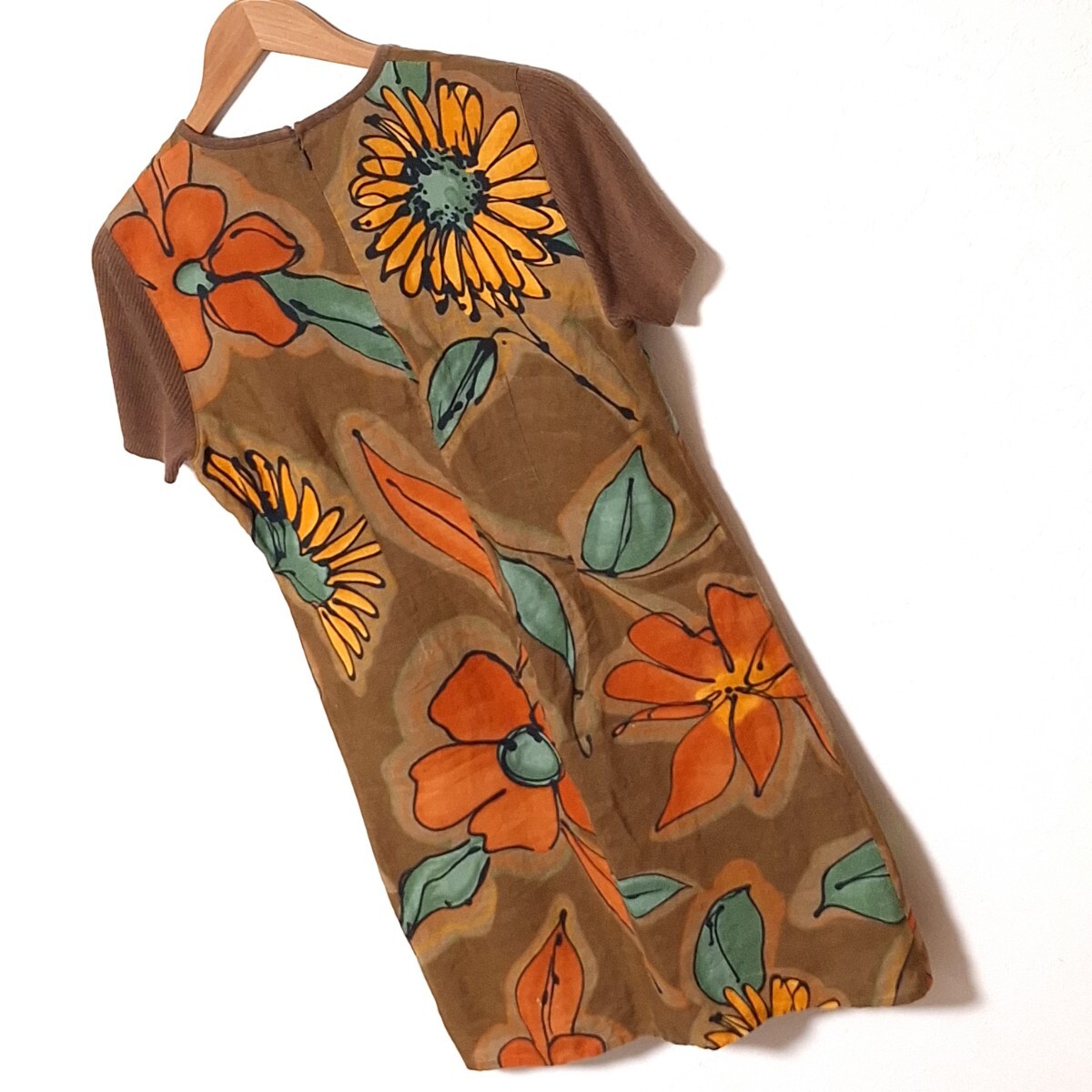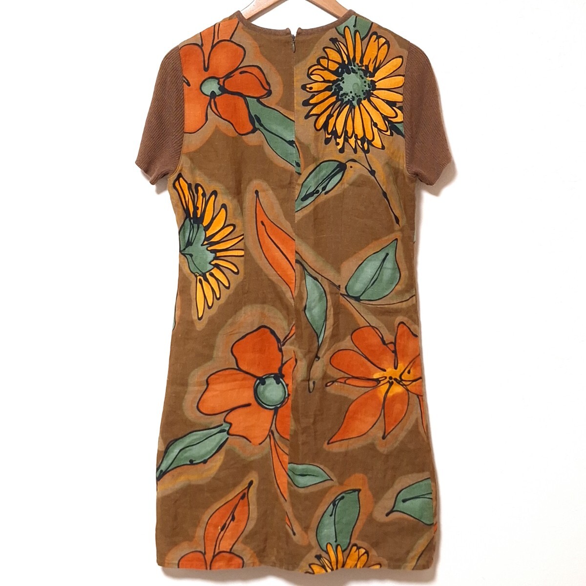 W653【 LANCEL】ランセル ワンピース 半袖 花柄 ブラウン系 レトロ リゾート ニットスリーブ 麻100% レディース サイズ9(M相当)/QQ
