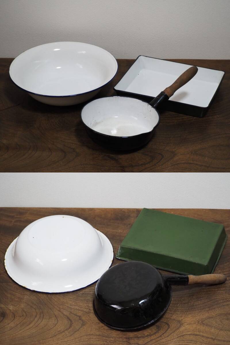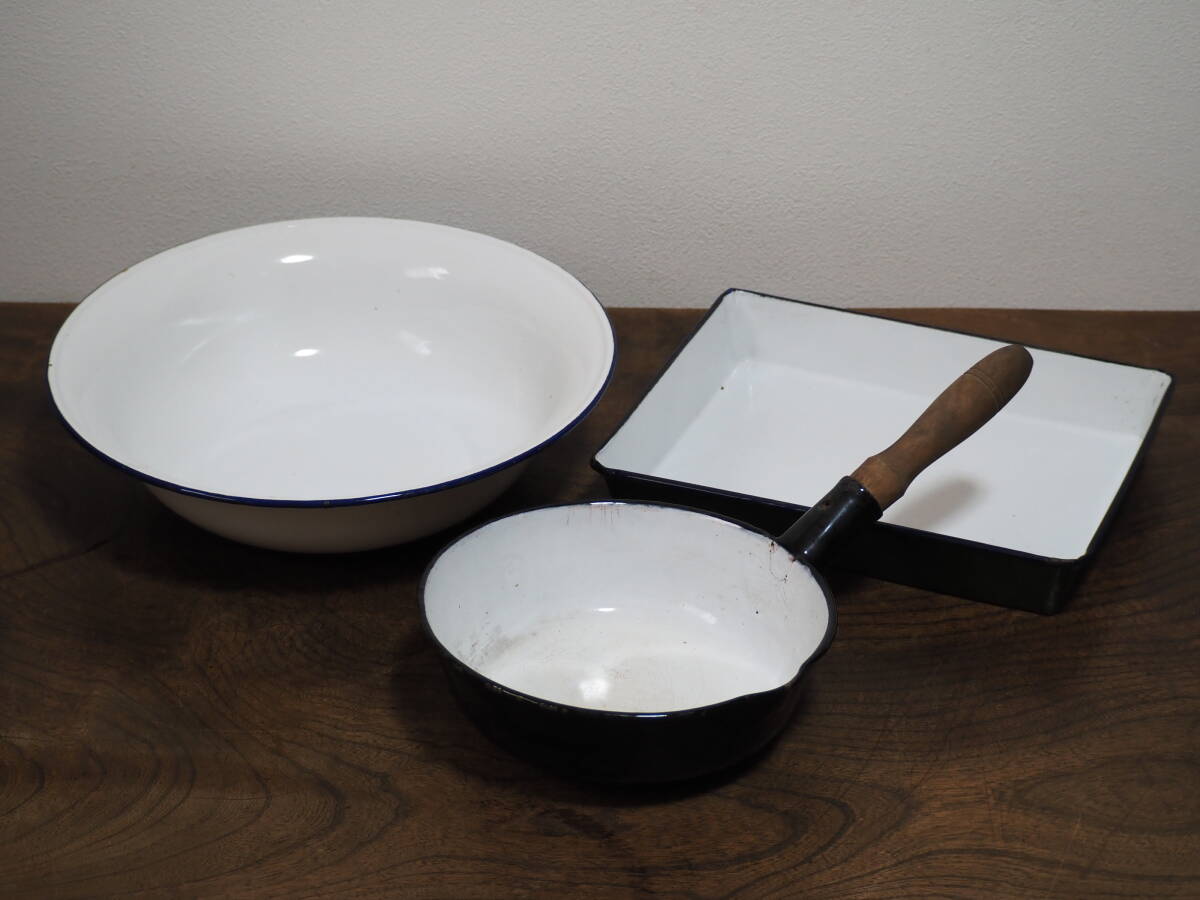 アンティーク 琺瑯雑貨 キッチン ホーローバット/ホーローボウル 洗面器/フライパン 調理器具 3点まとめて◆昭和レトロ 琺瑯ボール 鍋