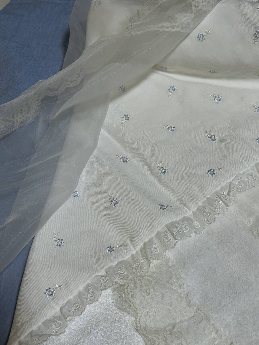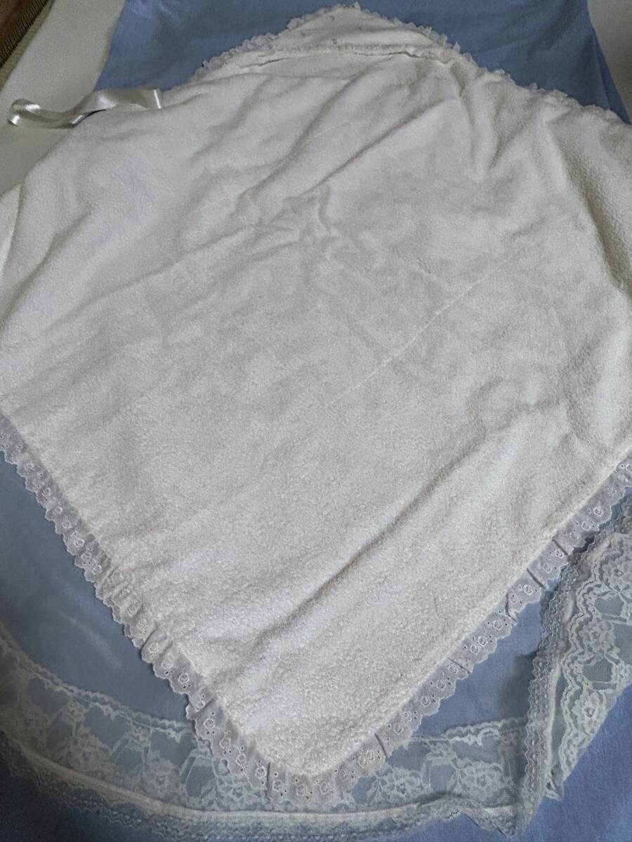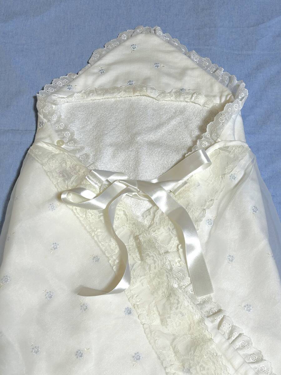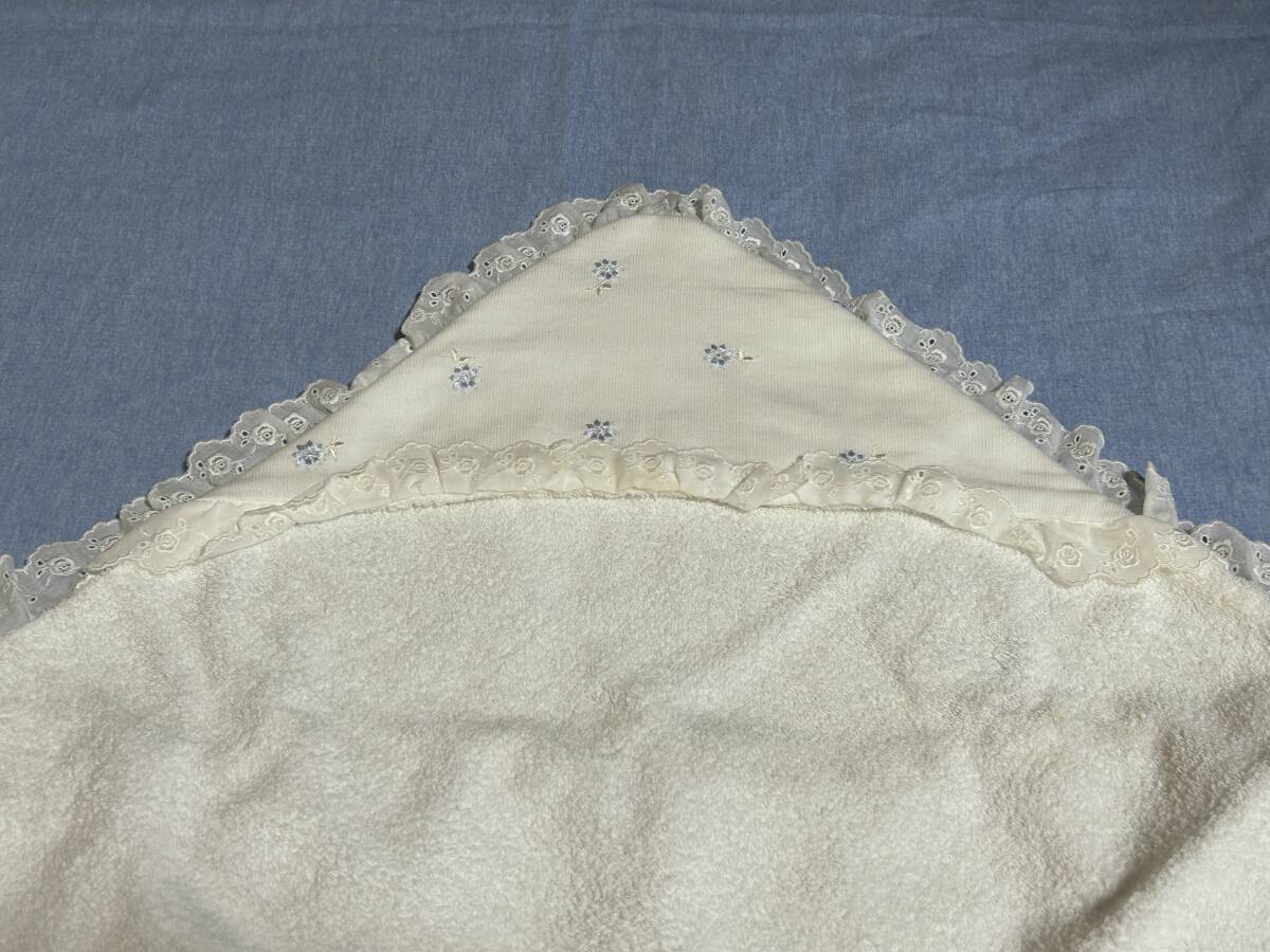 青い小花柄の日本製アフガンケープ(おくるみ)です。 数回使用しました。 レースは取り外し可能なので、普段使いにもできます。 使用していたものである事をご理解いただき、詳しいことは分かりませんのでわかる方のみご入札をお願いします。 | |||