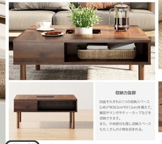 四面それぞれに1つの収納スペース(L48.5*W28.5cm*H11.5cm)を備えて、雑誌やマンガやティーカップなどを収納できます。また、中央部分も隠し収納スペースもたくさんの小物を収納できます。