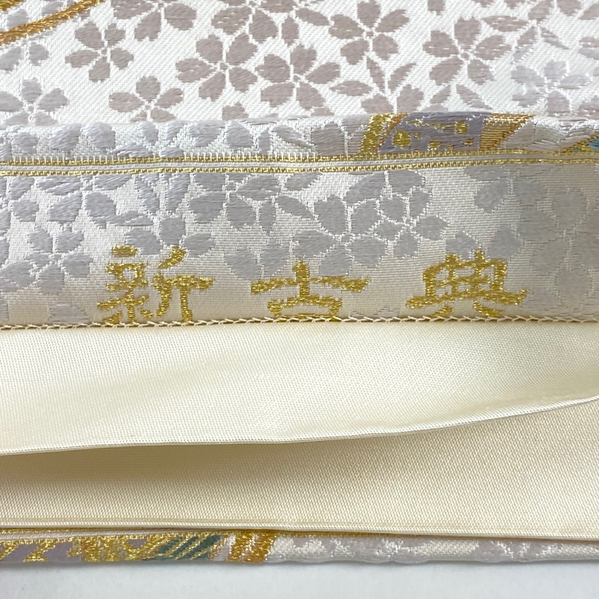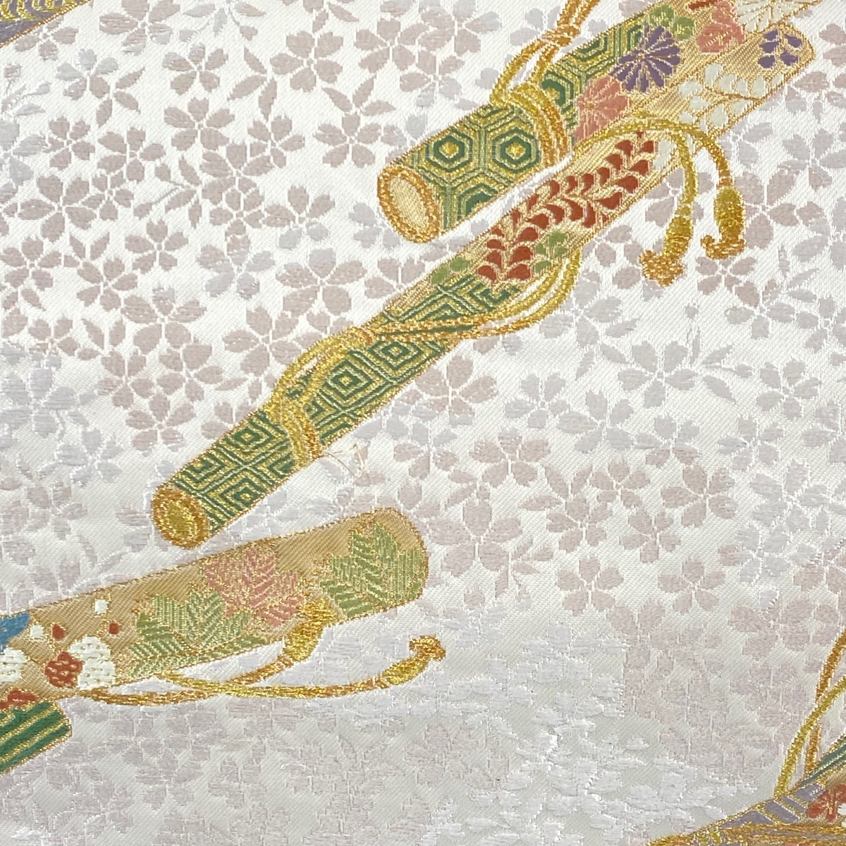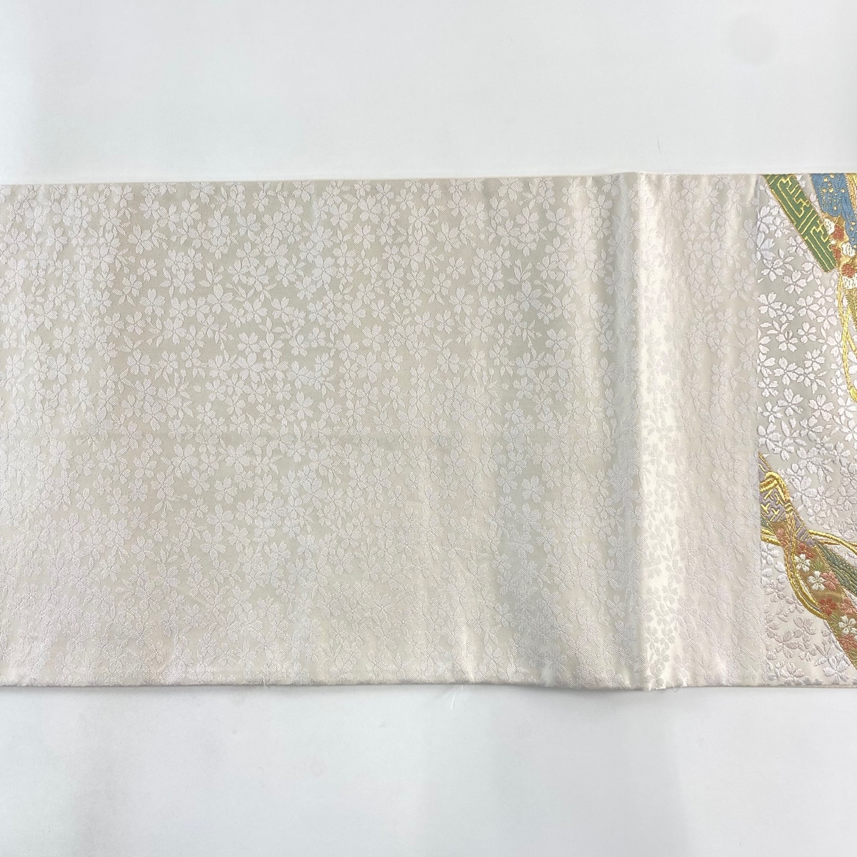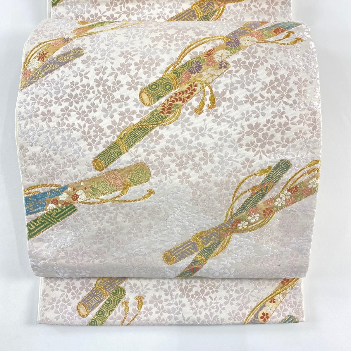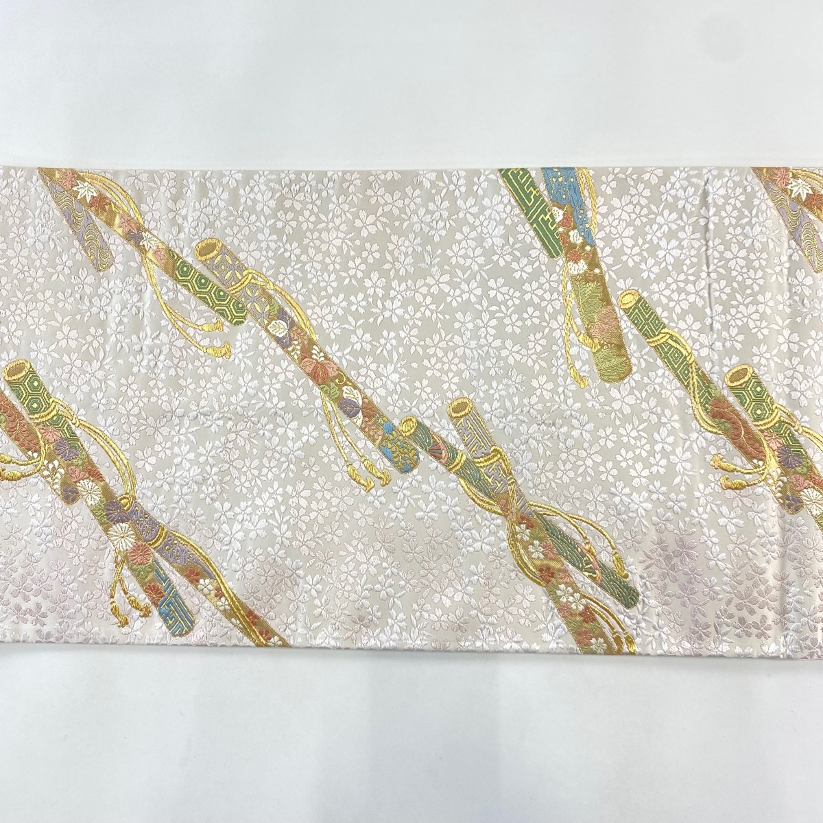 | 袋帯 名品 巻物 桜 金糸 箔 ピンクベージュ 六通 正絹 【中古】 |