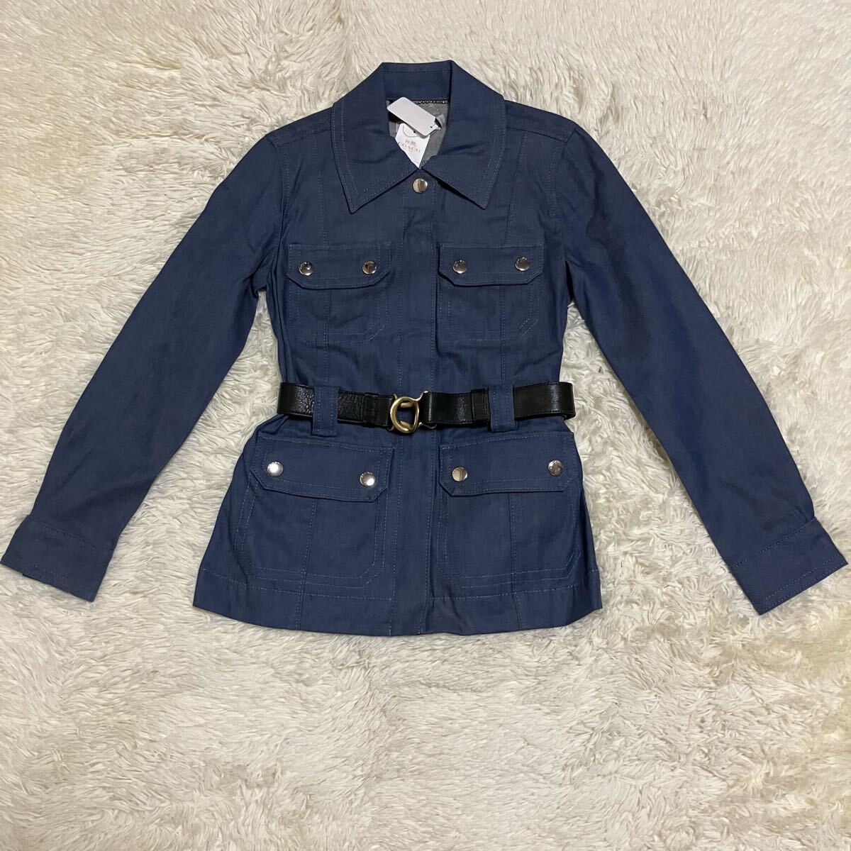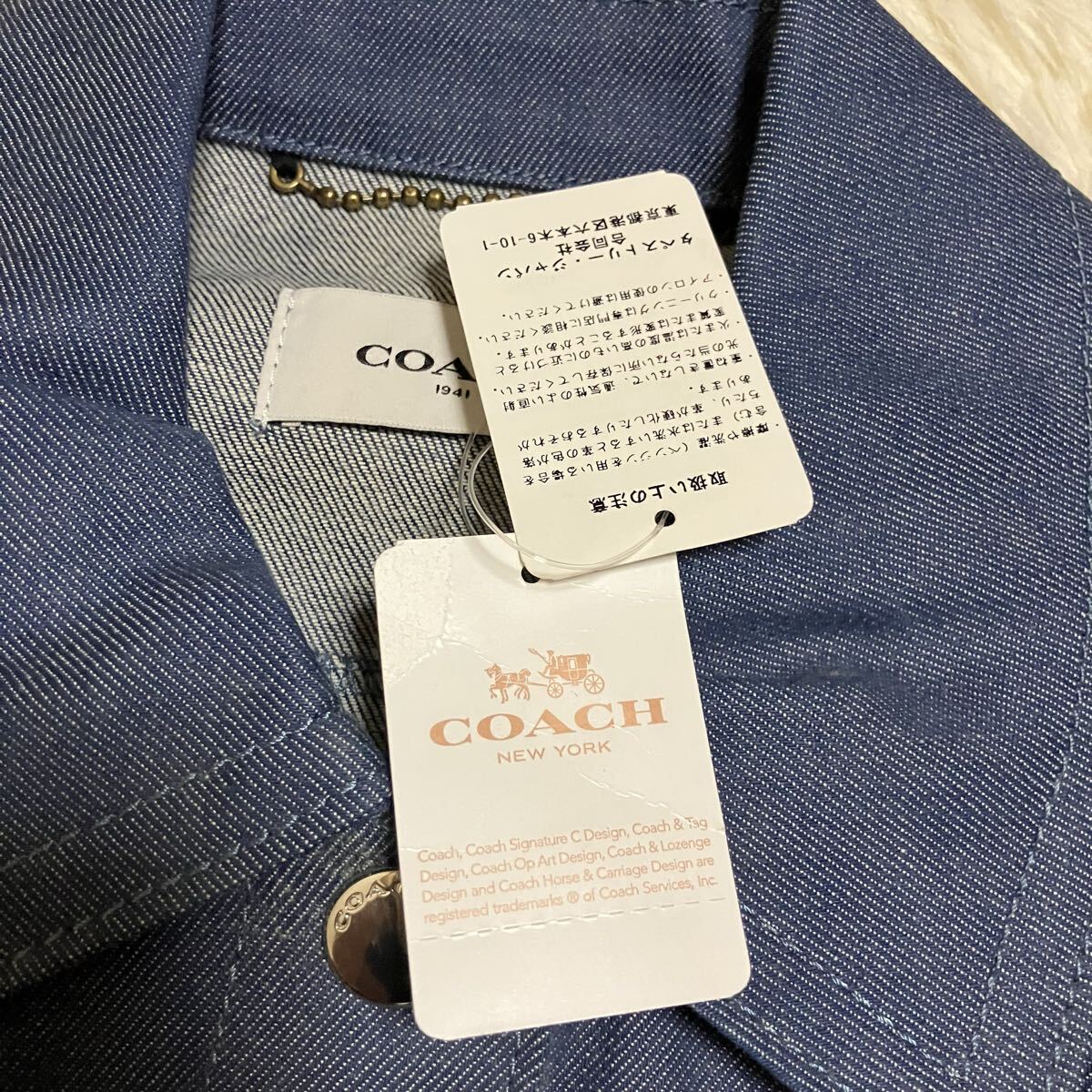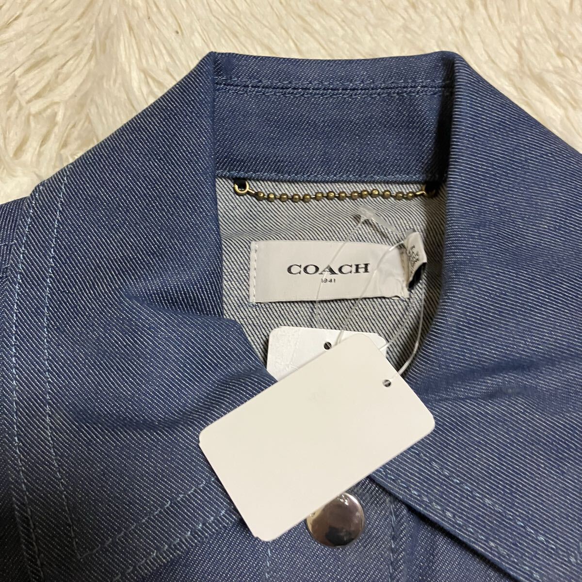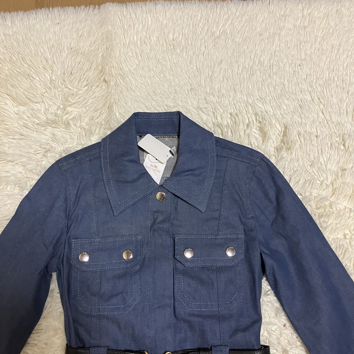 コーチのデニムヘリテージジャケットです。シルエットが綺麗で高級感があります。ベルトも素敵です。保管時の匂いが多少ございますのでご了承下さい。未使用タグ付き品です。