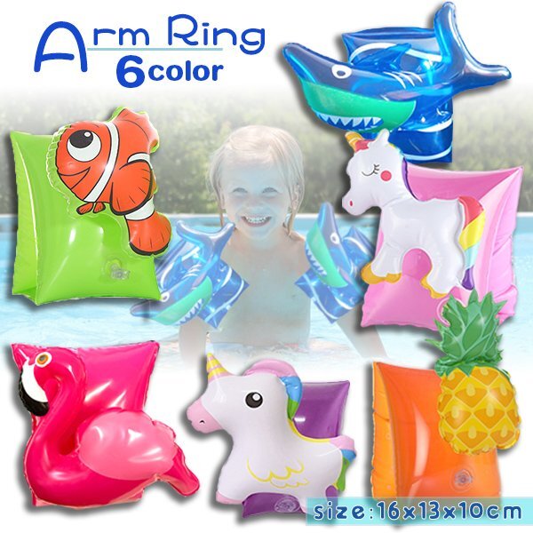 ☆アームリング トロピカル ※ご購入しましたらオーダーフォームにてご希望のタイプをお知らせください。 ・以下、在庫あります。 ◆ピンクフラミンゴ ◆ベビーユニコーン ◆かくれクマノミ 【商品名】 アームリング トロピカル 【カラー】 ◆トロピカルパイン:在庫切れ ◆ピンクフラミンゴ ◆ベビーユニコーン ◆キングジョーズ:在庫切れ ◆かくれクマノミ ◆NEWユニコーン:在庫切れ 【対象年齢】 2~6歳 【素材】 塩化ビニール 【サイズ】 約16x13cm 幅10cm 【オススメポイント♪】 両腕に装着するタイプのドーナツ状の浮き輪です♪ 体がリングから抜けにくく溺れにくくて安定感があり安心設計です! また普通の浮き輪と違って、つかまって支えることがないのでお子様も疲れづらい親切設計です。 たとえぶつかったり接触してもしっかりサポートしているので落ちてしまうこともないので安心して泳ぎに連れていけます! | ||||