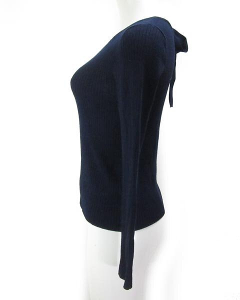 後ろリボンのフェミニンなニット。甘目スカート、キレイ目パンツなど幅広くコーディネートして頂けます。紺なので、ボトムスのお色を選ばずあわせて頂けます。 |