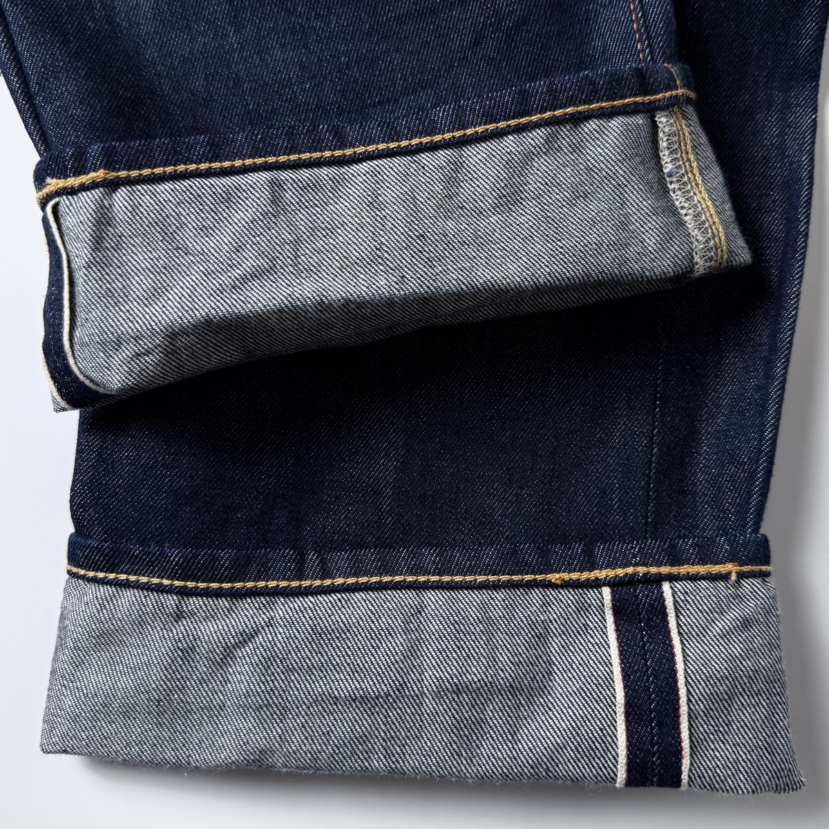 シンチバック(尾錠)、ギャラ入り革パッチ、赤タブ片面BIG E、一本針アーキュエイト。