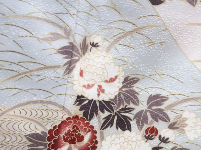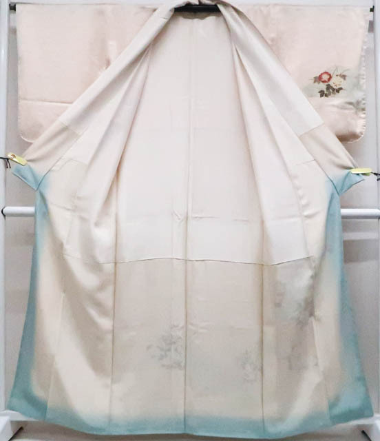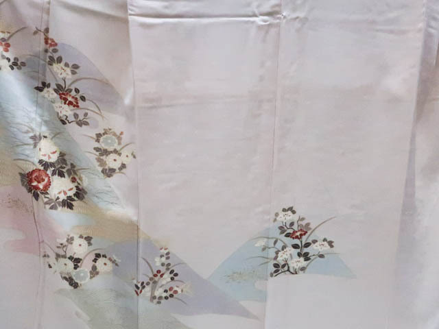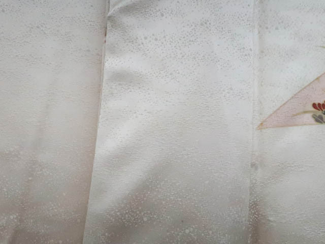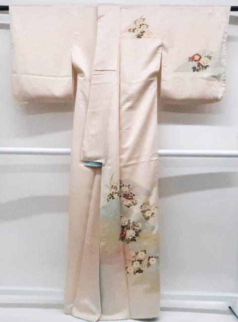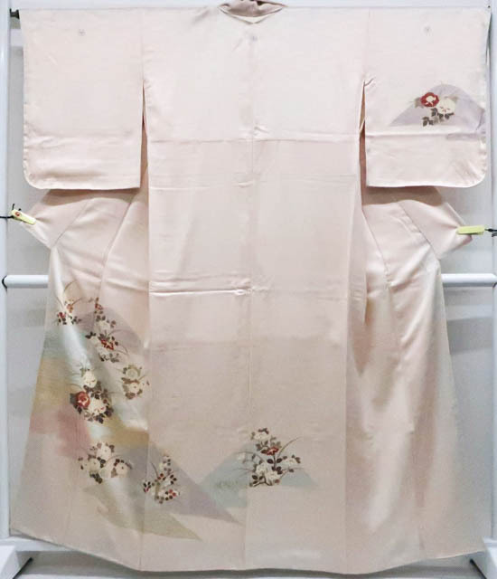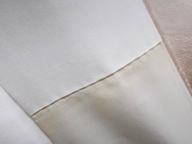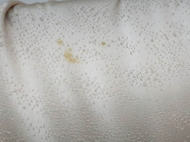 リサイクル商品のため、身頃・袖など全体の所々にシミ、衿汚れがございますがご着用いただけると存じます。 地色は薄ピンクです。 1枚目の画像が近いお色かと思われます。 素材は正絹です。 |