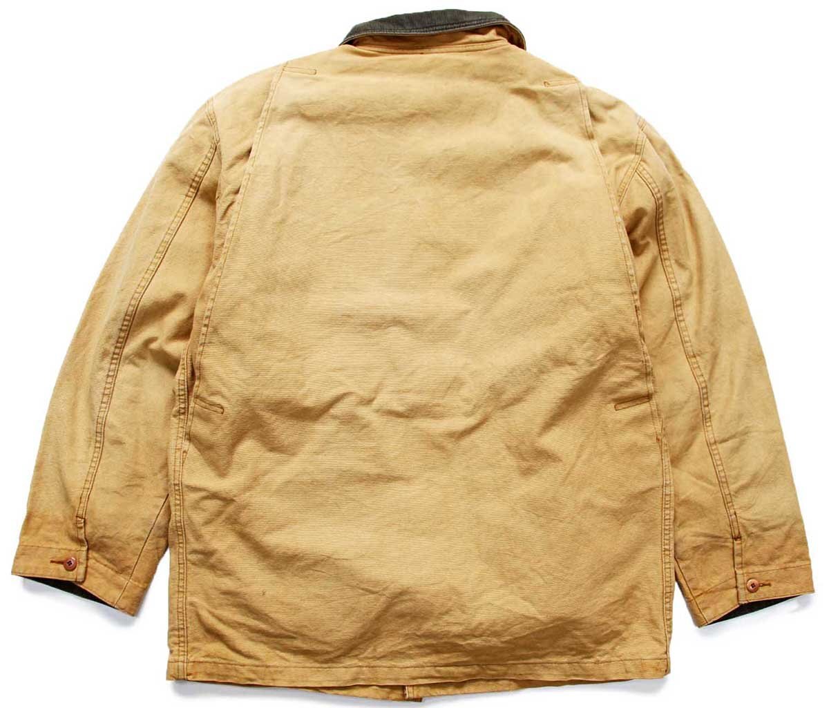 コンディション:着用感があり、所々に多少の色落ちや若干の薄汚れ、背中左のアクションプリーツに僅かなステッチ飛び、左袖先に1つの細かい小キズがあります。目立つダメージや酷い汚れはなく、生地もしっかりしていて、古着慣れされている方なら問題なく着用いただける程度です。