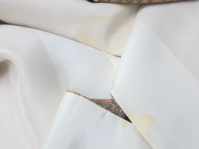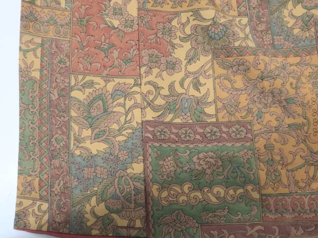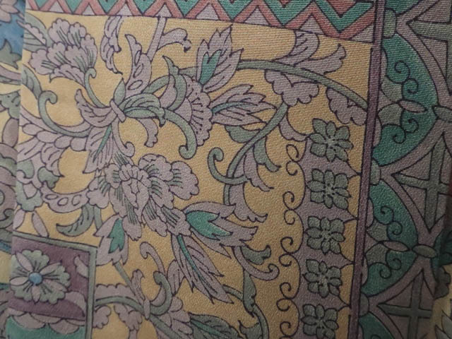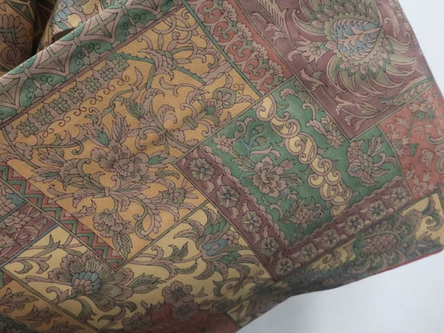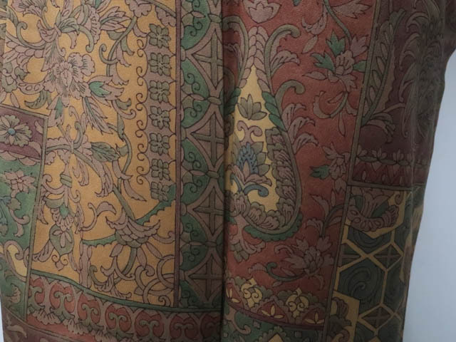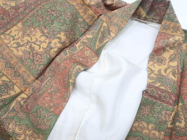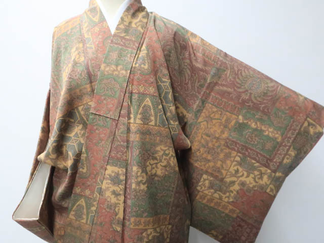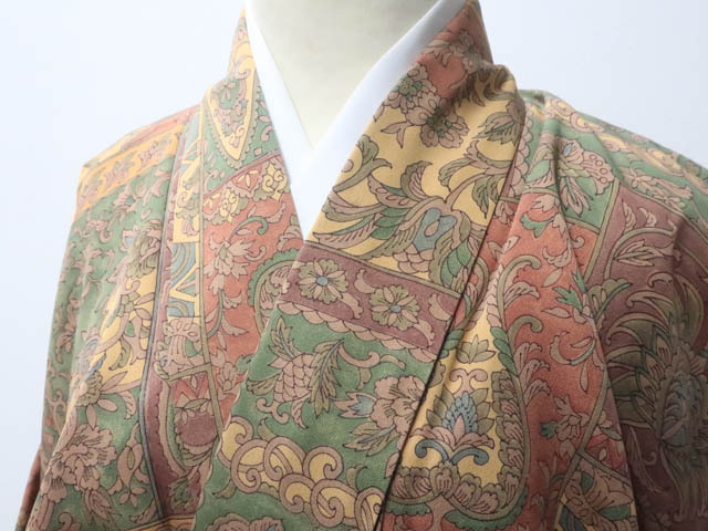 リサイクル商品のため、羽田掛けに小さなしみと胴裏にしみがございますがご着用いただけると存じます。 バチ衿でございます。 地色は 緑・薄黄土・灰紫・赤茶です。 1枚目の画像が近いお色かと思われます。 素材は正絹です。 |