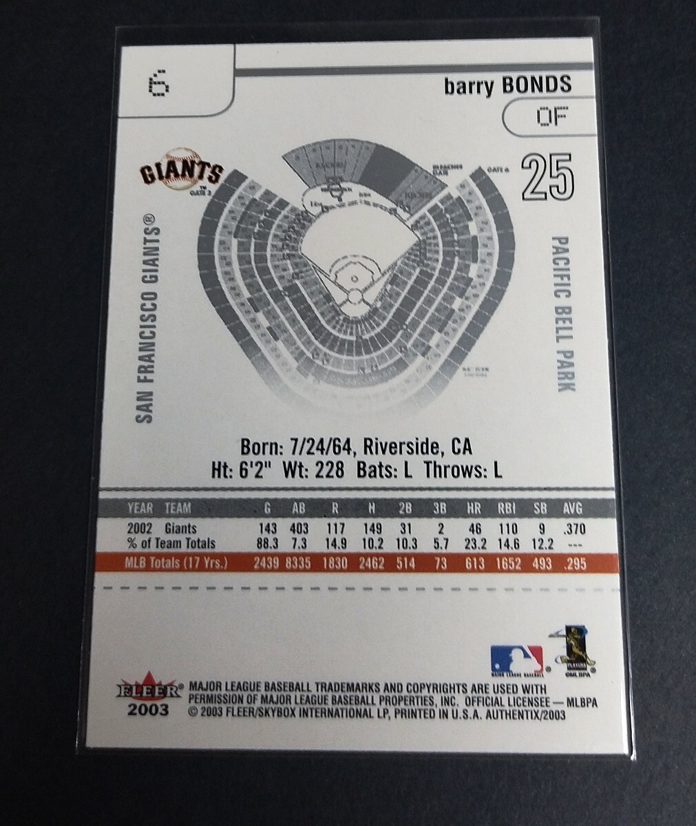MLB 2003年FLEER Authentix バリー・ボンズ(ジャイアンツ) No,6。Giants BARRY BONDS