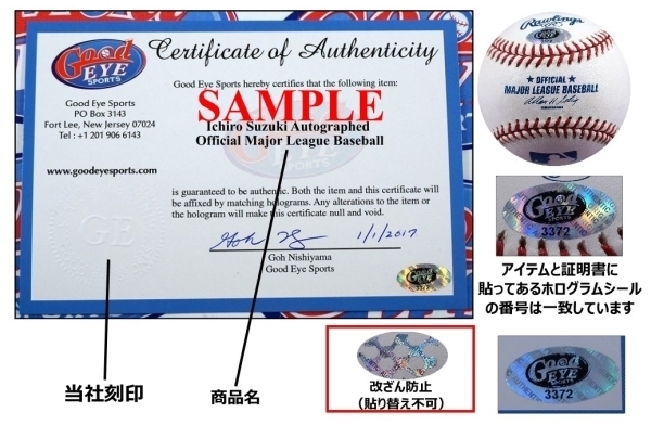 このボールのサインを本物と証明する当社Good Eye Sports社【www.goodeyesports.com】の「ホログラム+証明書」をお付けします。