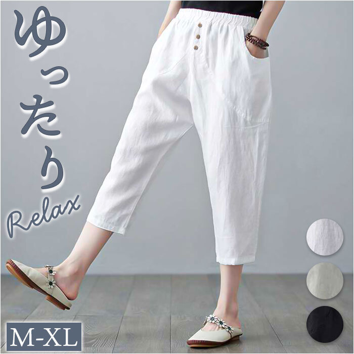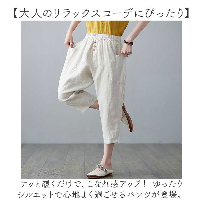 | 商品説明 | ・・【大人のリラックスコーデにぴったり】 ・サッと履くだけで、こなれ感アップ! ゆったりシルエットで心地よく過ごせるパンツが登場。 ・【ふんわり可愛い、ゆるシルエット♪】 ・程よいゆるさが魅力。気になる太ももまわりも優しくカバー。 ・【ストレスフリーな履き心地】 ・ウエストは柔らかいゴム仕様で締め付け感なし。着脱もスムーズで、長時間座っていてもラクちん ・【春夏にうれしいサラッと素材】 ・軽やかで通気性のいいコットン素材を使用。薄手なので汗ばむ季節でもムレにくく、快適。 ・【動きやすく、アクティブシーンにも】 ・股上が深めの七分丈サルエルタイプ。動きを妨げず、アウトドアやお出かけにもぴったり。 ・【小物が入る便利なポケット】 ・サイドにポケットがあり、スマホやハンカチなどちょっとした小物が入れられる☆ ・【シンプルなデザイン】 ・フロントのボタンがアクセント。ナチュラルな風合いで、どんなトップスとも相性バツグン! |