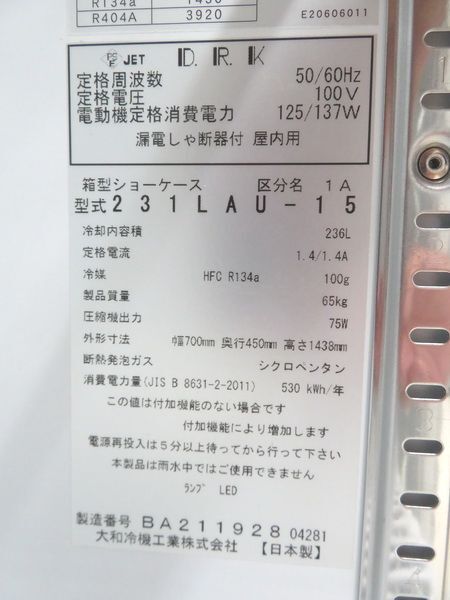 ◆ダイワ 2021年◆冷蔵ショーケース 231LAU-15 100V 700×450×1105 サイズ:W700×D450×H1105mm 電 源:100V 有効内容積:236L 冷却性能:2~10℃ 製品質量:65kg 定 価:311,300円 出品にあたり動作確認・クリーニング済みです。 多少の傷・使用感等がありますので、予めご了承ください。 中古品ですので、画像をよくご確認の上、ご理解頂ける方のご入札をお願いいたします。 神経質な方はご入札をご遠慮ください。 気持ちの良いお取り引きにしたいと思いますので、ご不明な点等ございましたらお気軽にご質問ください。 | |