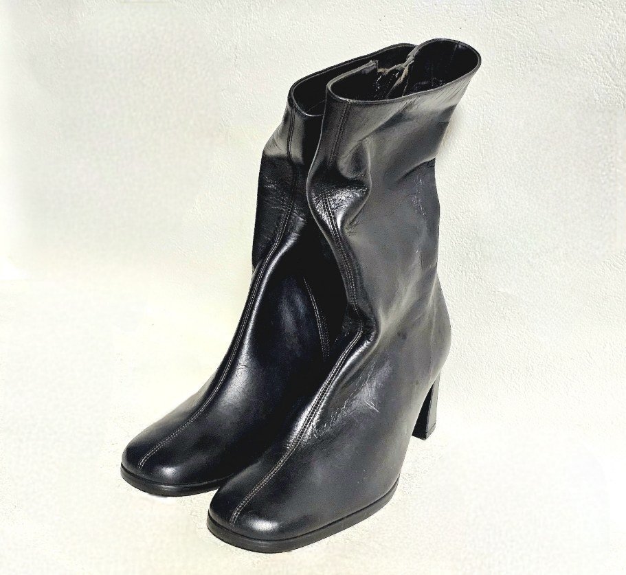 商品説明 足袋風スクエアトゥ型のショートブーツです。 サイドファスナー付きで脱ぎ履きが楽に出来ます。 詳細 ●サイズ:奥行24.5cm、足裏幅9cm、高さ29cm、ヒールの高さ7cm ●ランク:Bランク ●コンディション:未使用品ですが、長期保管による傷・汚れ・シワがヒールや側面にあります。 |