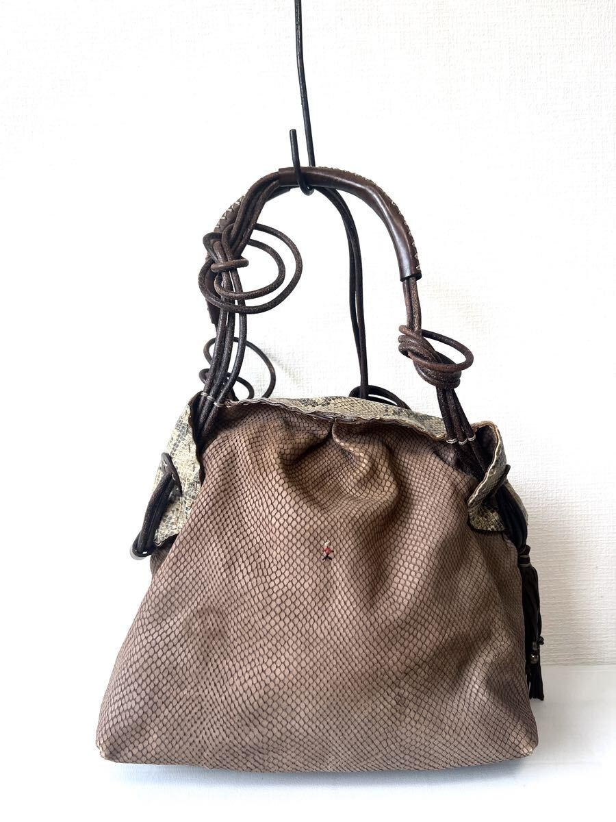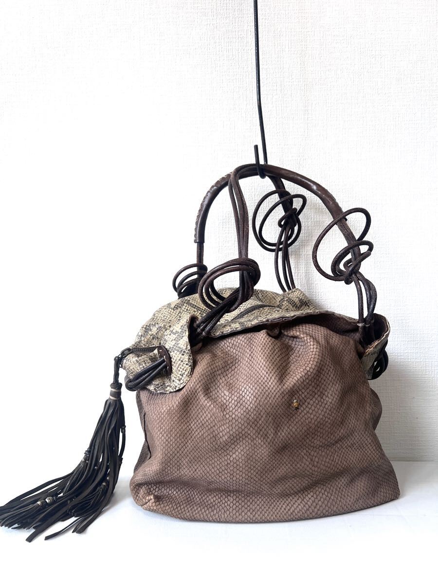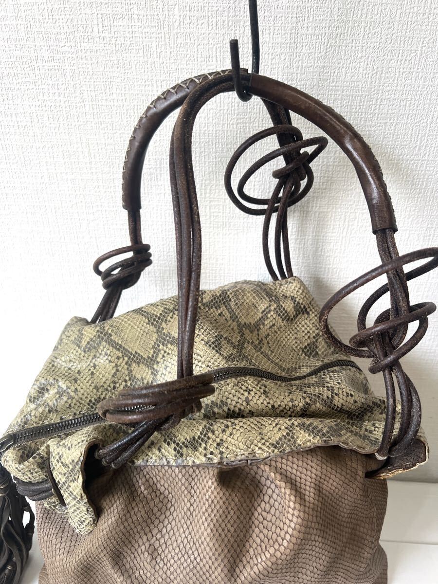いくつものレザーコードが絡み合うように結ばれた独創的なハンドル。