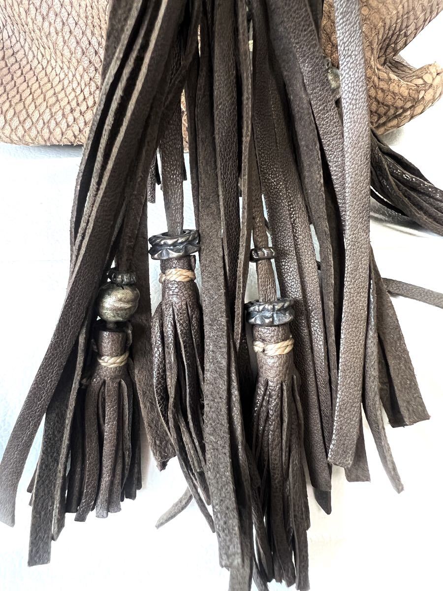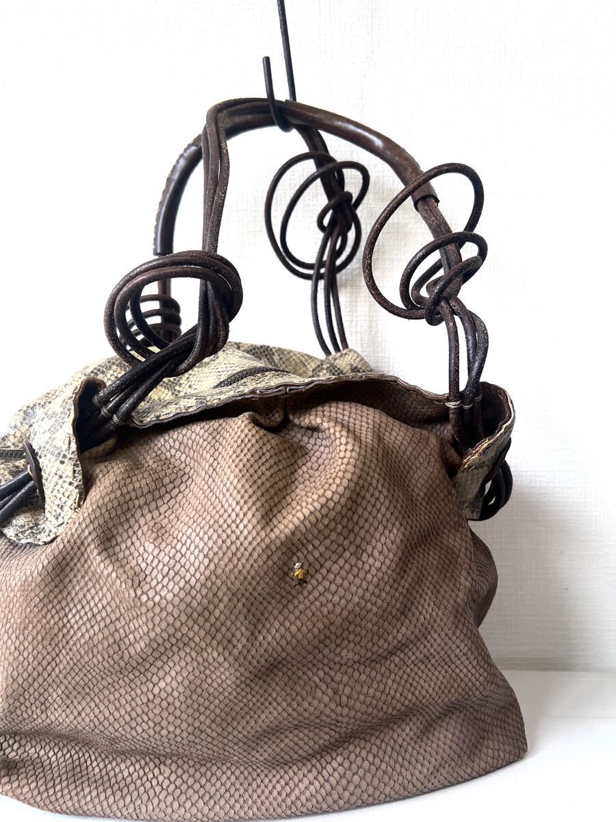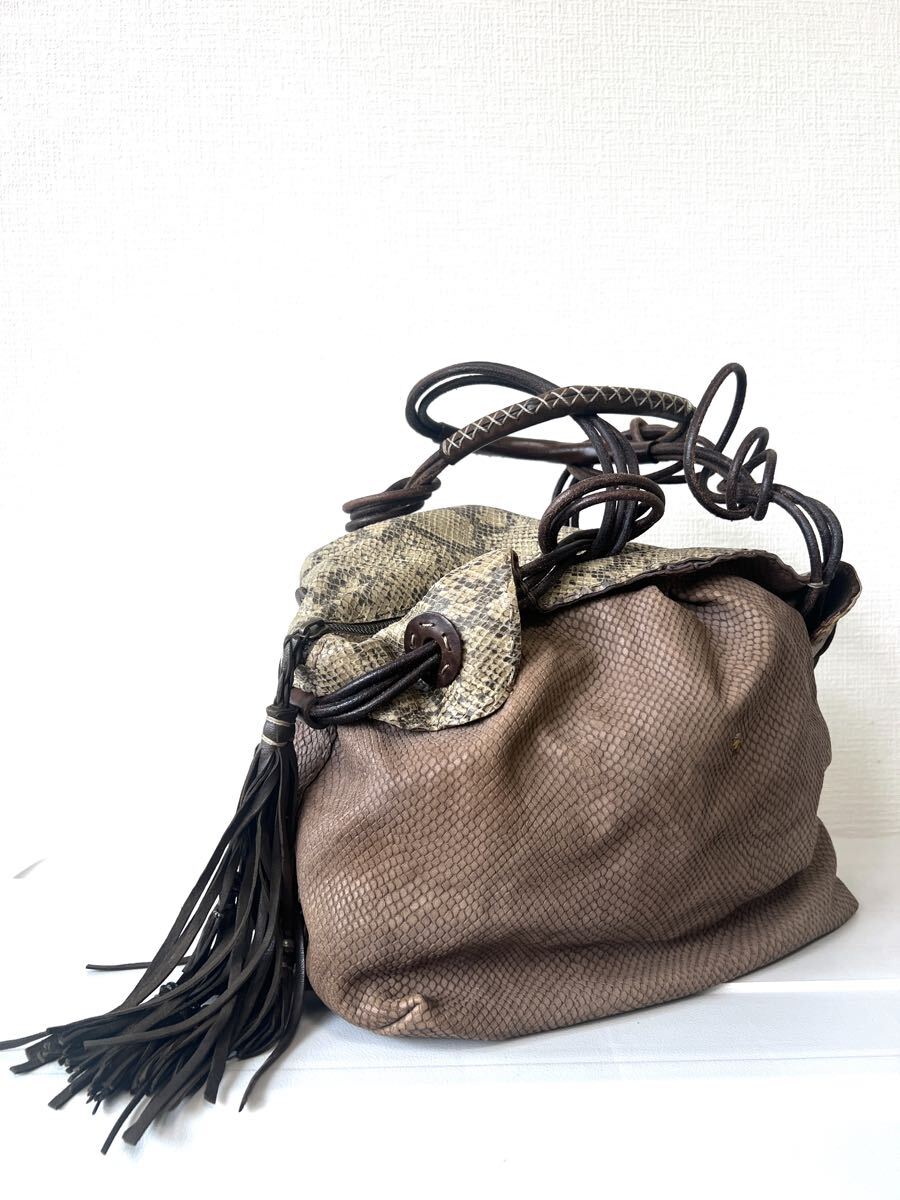 いくつものレザーコードが絡み合うように結ばれた独創的なハンドル。