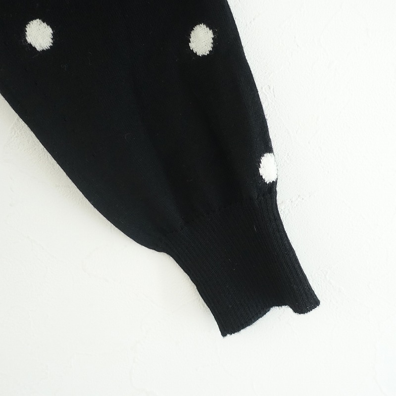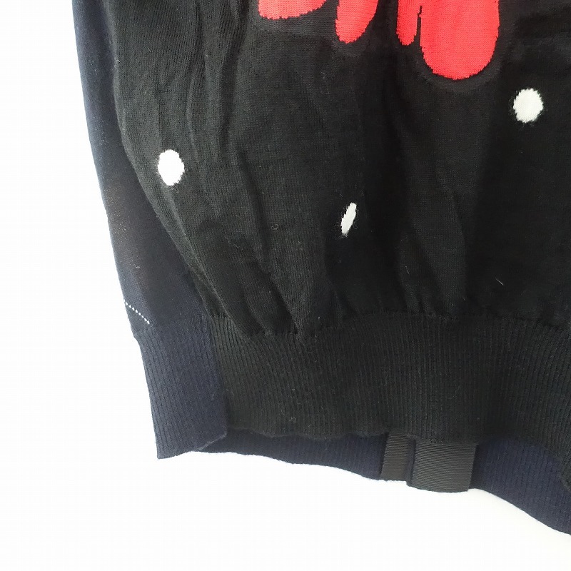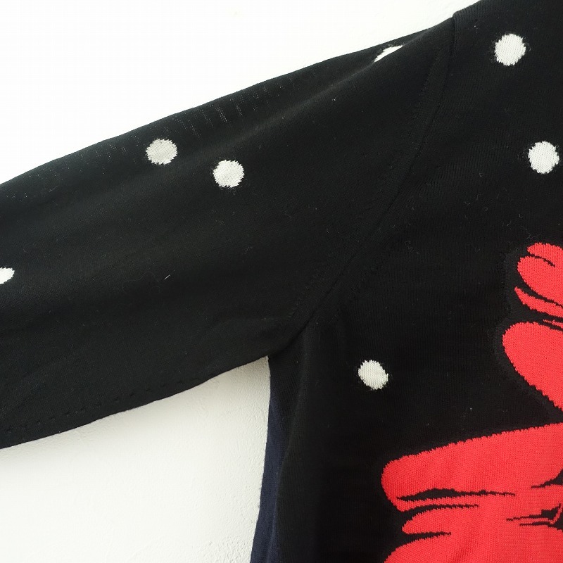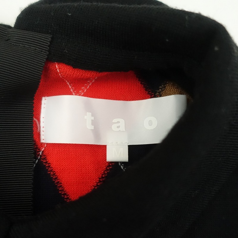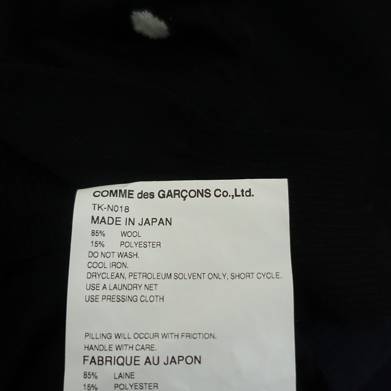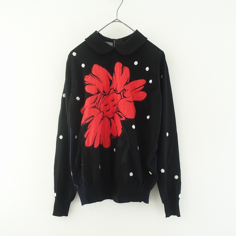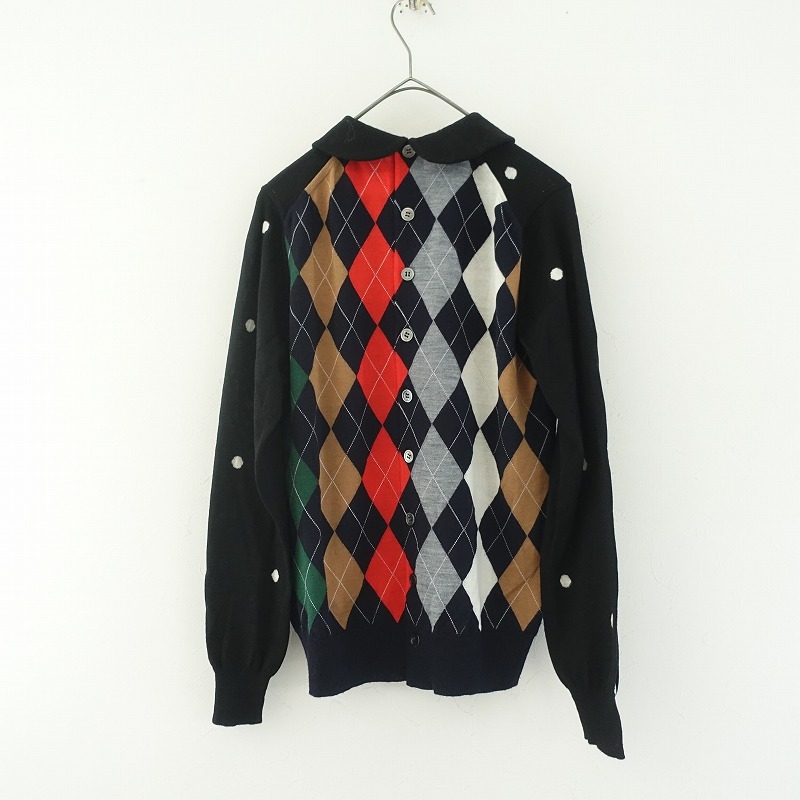 TAO COMME des GARCONSのウール混丸襟背開きニットです。前身頃&袖のカラーはブラックにレッド・ホワイトの花柄&ドット柄で、後ろ身頃のカラーはダークネイビーにグリーン・ベージュ・グレーなどのアーガイル柄です。薄手のニット地で、後ろボタンで着脱でき、袖口・裾はリブ編みです。 |