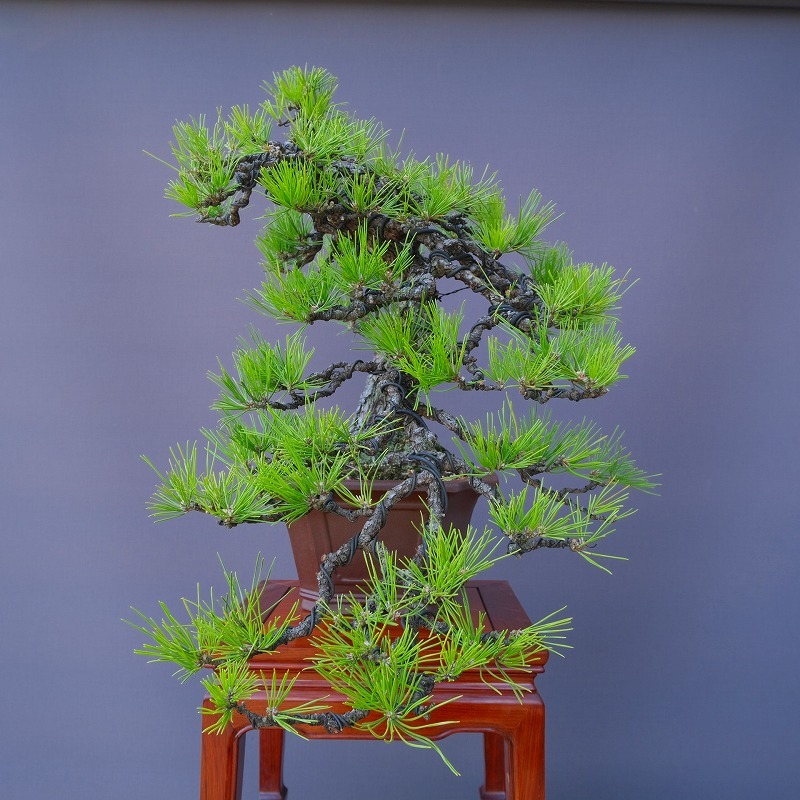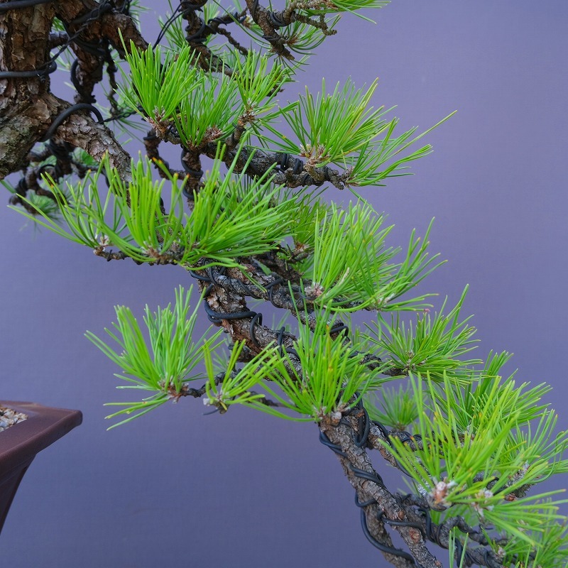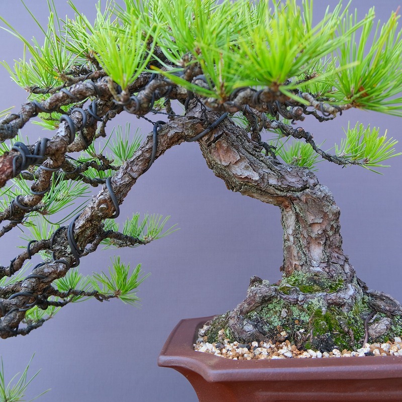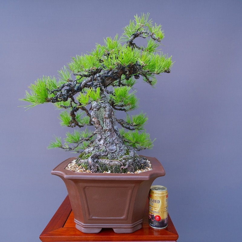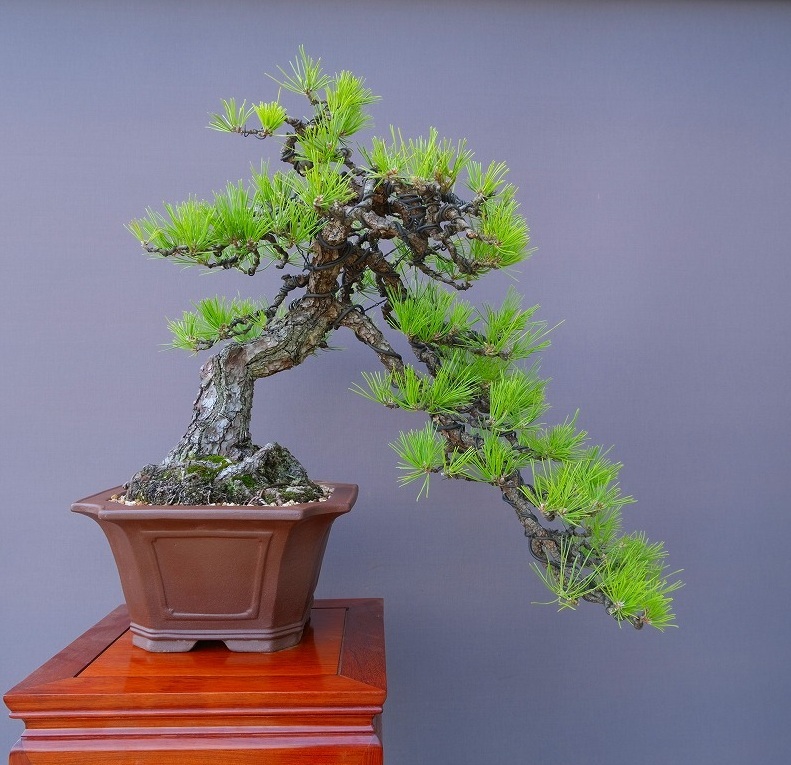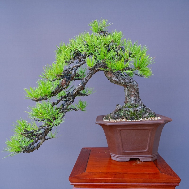 説 明 | 幹に傷はなく、古色感のある木肌です。弾みのある枝を長く効かせた懸崖松であります。 |