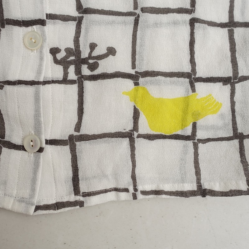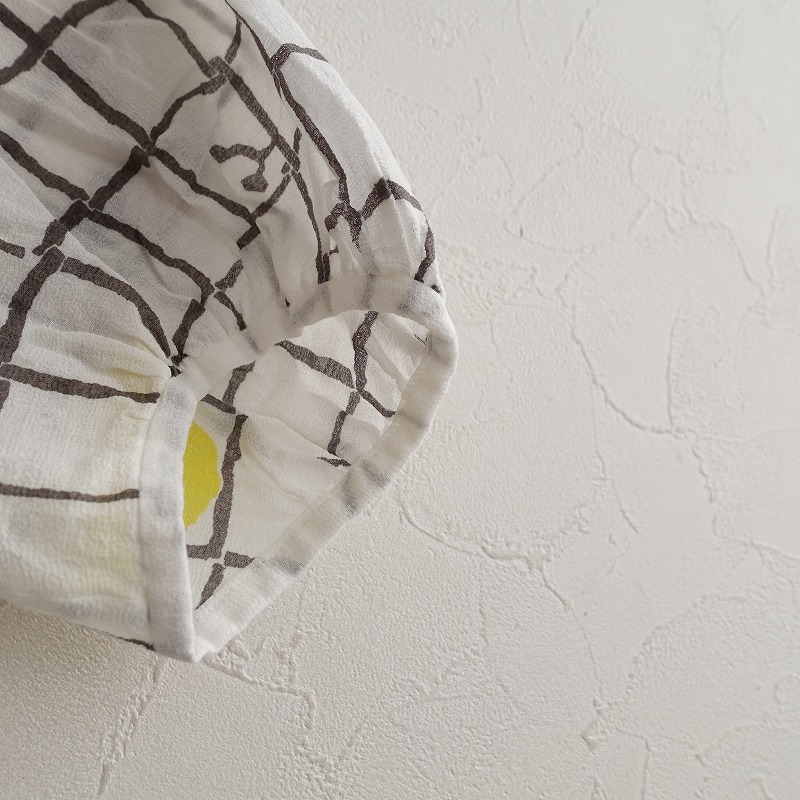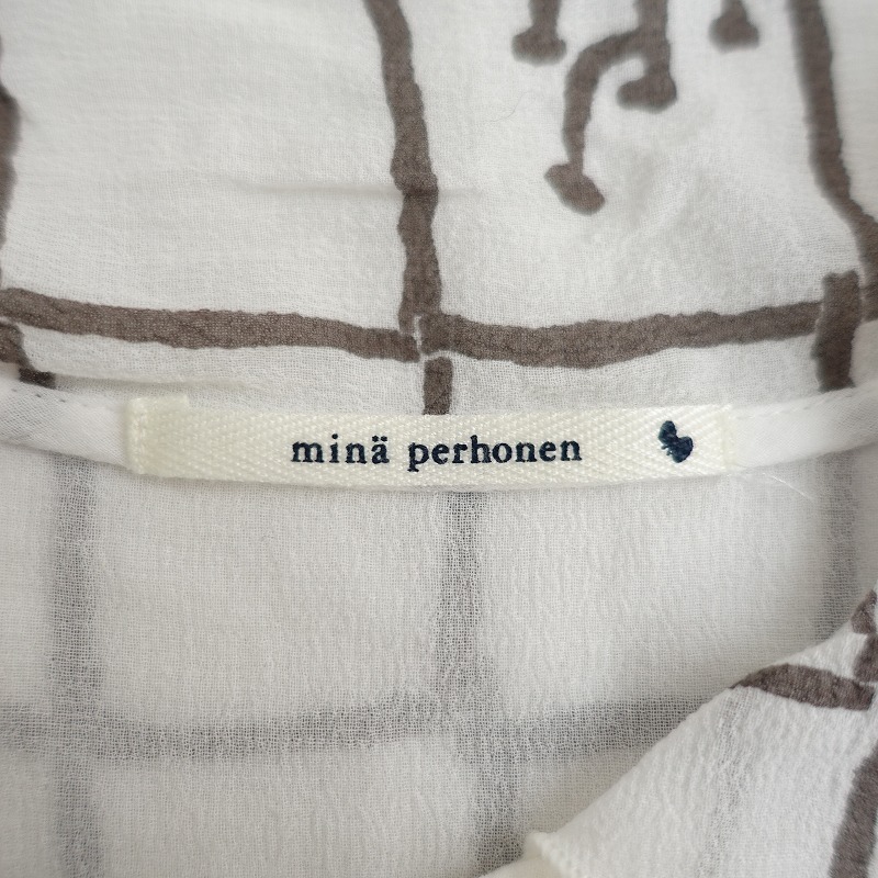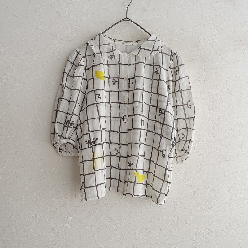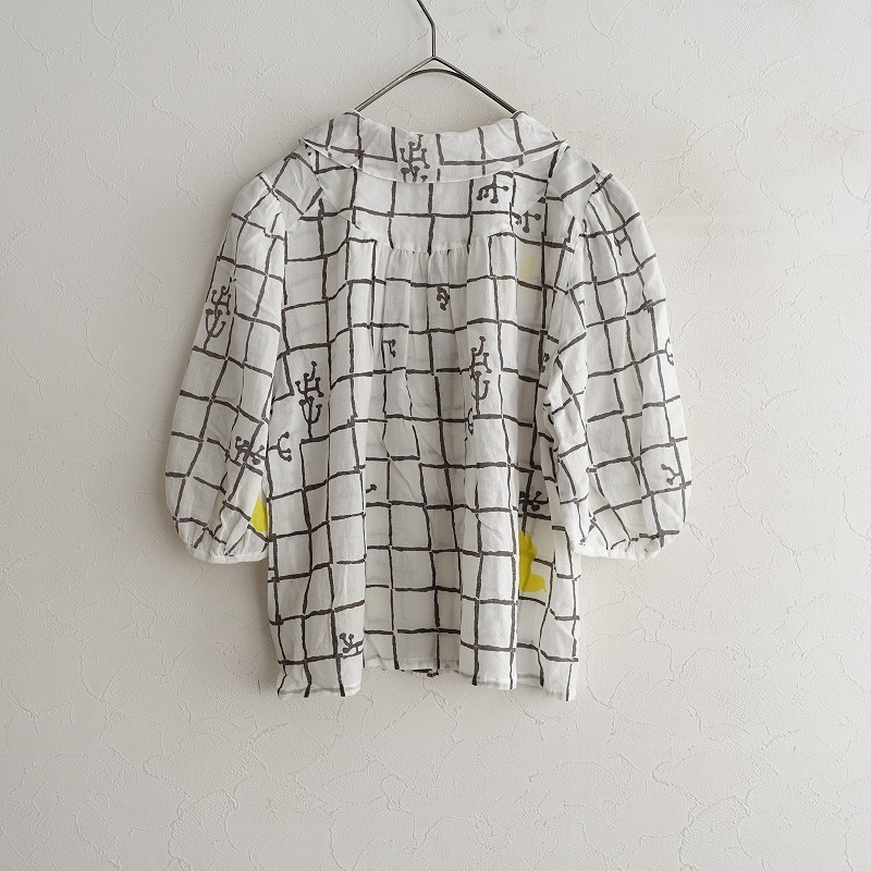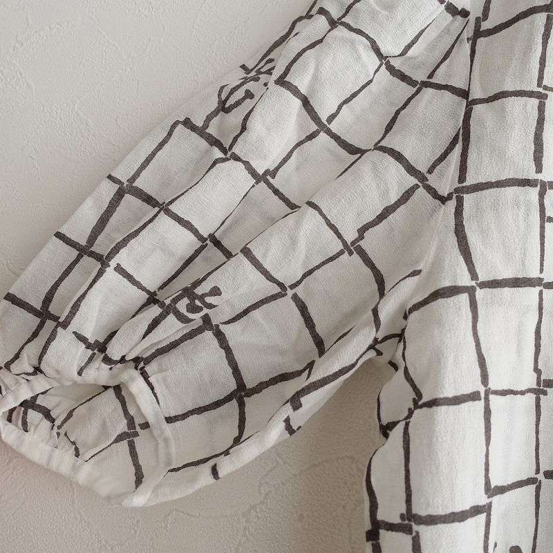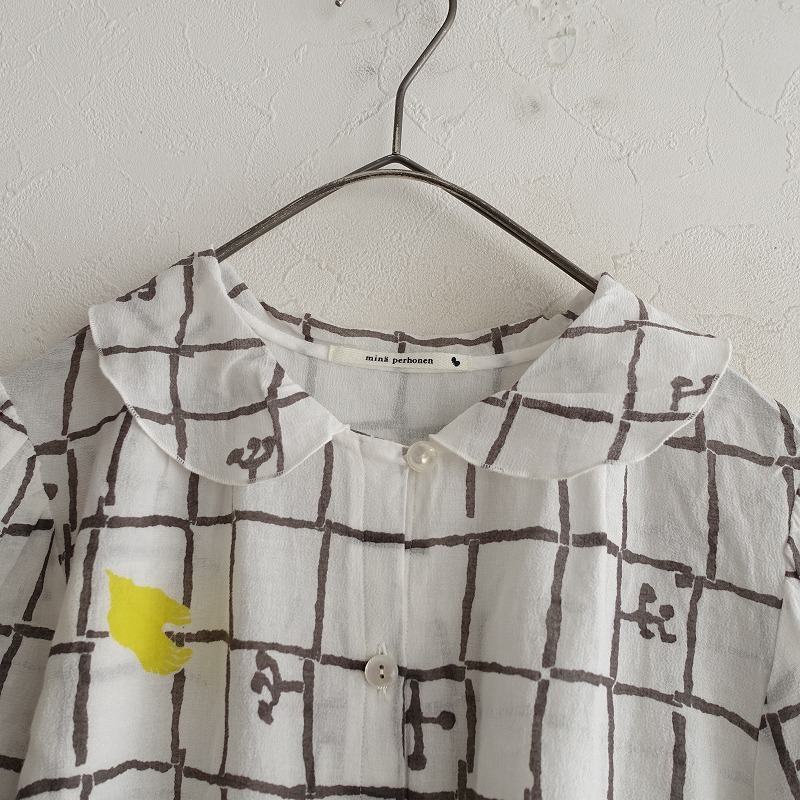 mina perhonenのframe コットン薄手ブラウスです。カラーはホワイト、チャコール、イエローなどで、frame のテキスタイルプリントの施された透け感のある薄手ジョーゼット素材で仕立てられています。ボタン開閉で、袖は少しギャザー入りのパフスリーブデザインです。 |