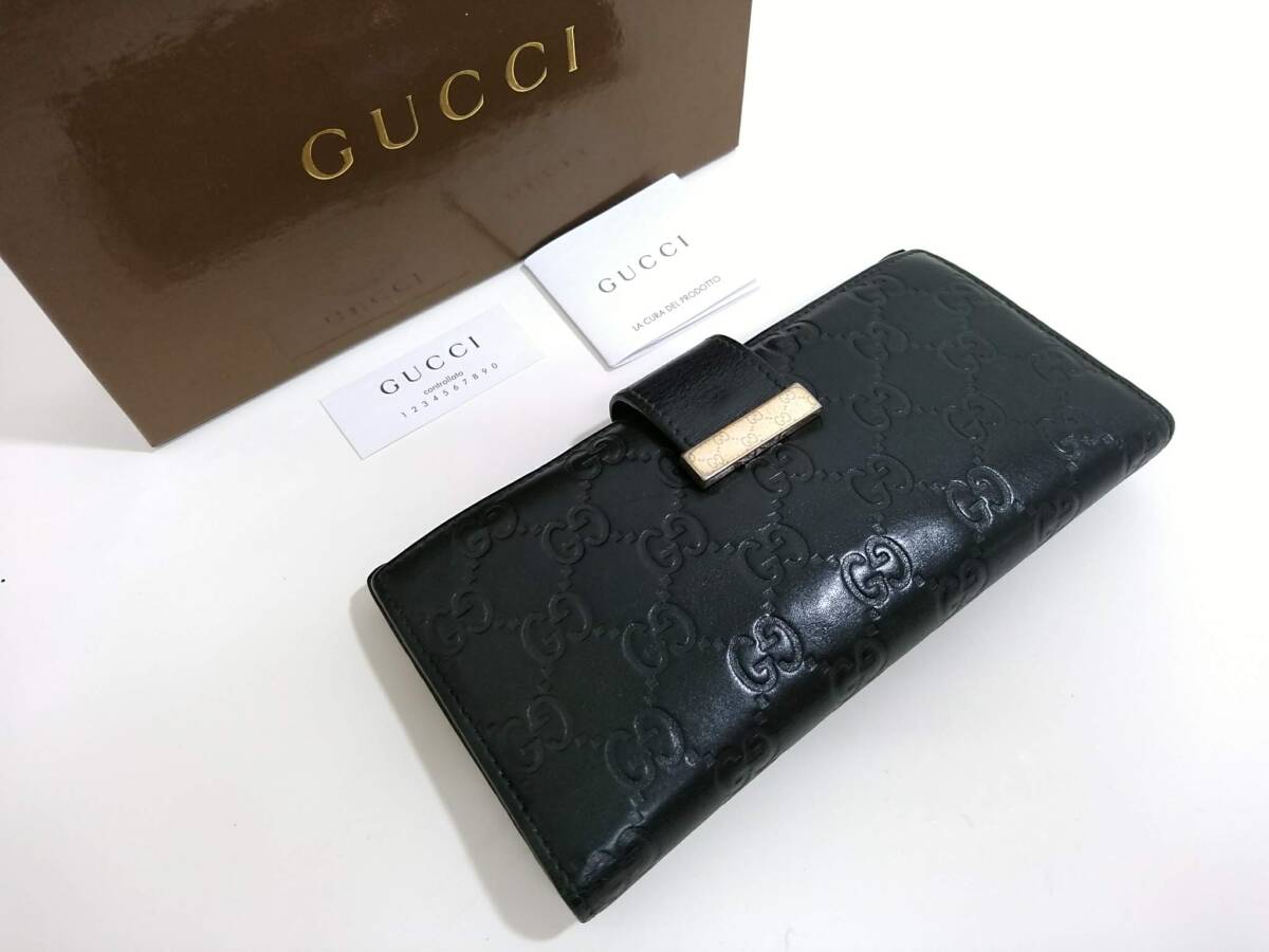 ※離島など別途中継手数料がかかる地域が御座います。 その場合はお振込みを追加でお願いする場合が御座います事、 事前にご了承の程、宜しくお願い致します。 ※送料には業者指定された運送用梱包資材代が含まれます。 専用BOX、段ボール梱包以外での補償は対象外となります。 [商品名] 1円スタート GUCCI グッチ グッチシマ 二つ折り長財布 212096 478442 [サイズ] 高さ約9.5cm, 横約19cm, 厚さ約2cm [素材] 本革レザー他 [カラー] ブラック系 [仕様] ドットボタン開閉仕様 お札入れ×2 ファスナーポケット×1 カード入れ×6 フリーポケット×3 箱付き [状態] 全体にキズ、汚れ、角にスレ、所々にスレ箇所、 金属部分にキズ、メッキハガレが御座いますが、 その他は良いと思います。