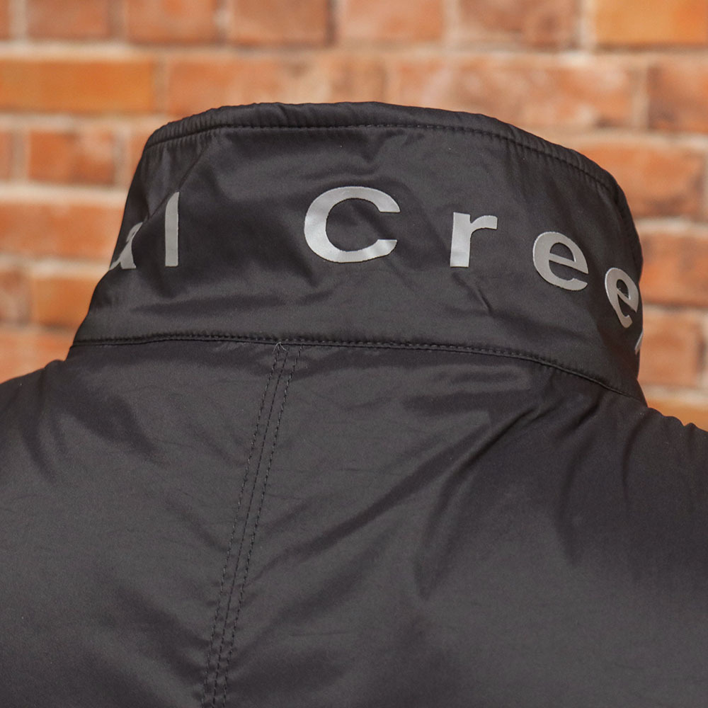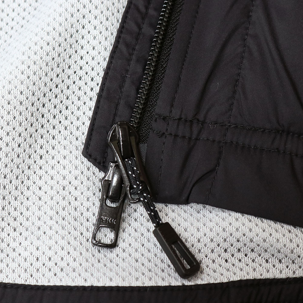 衿の内側には肌触りの良いフリース素材を施し、首元を暖かく包み込みます。衿にあしらわれたロゴと右胸のファスナーポケットが、スポーティさとデザイン性をさりげなく引き立てています。