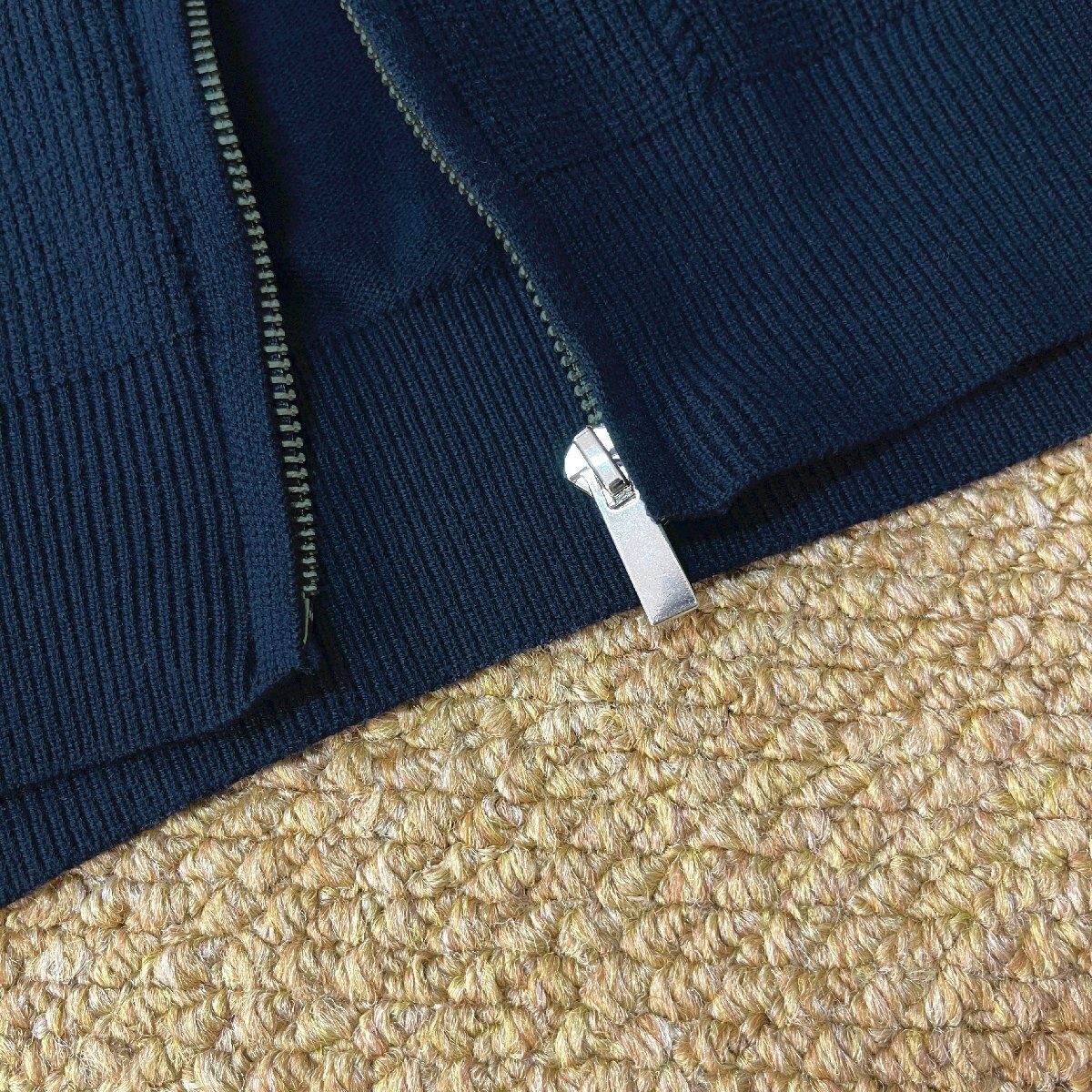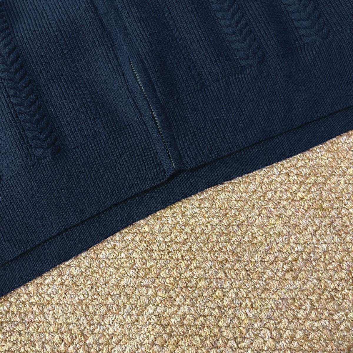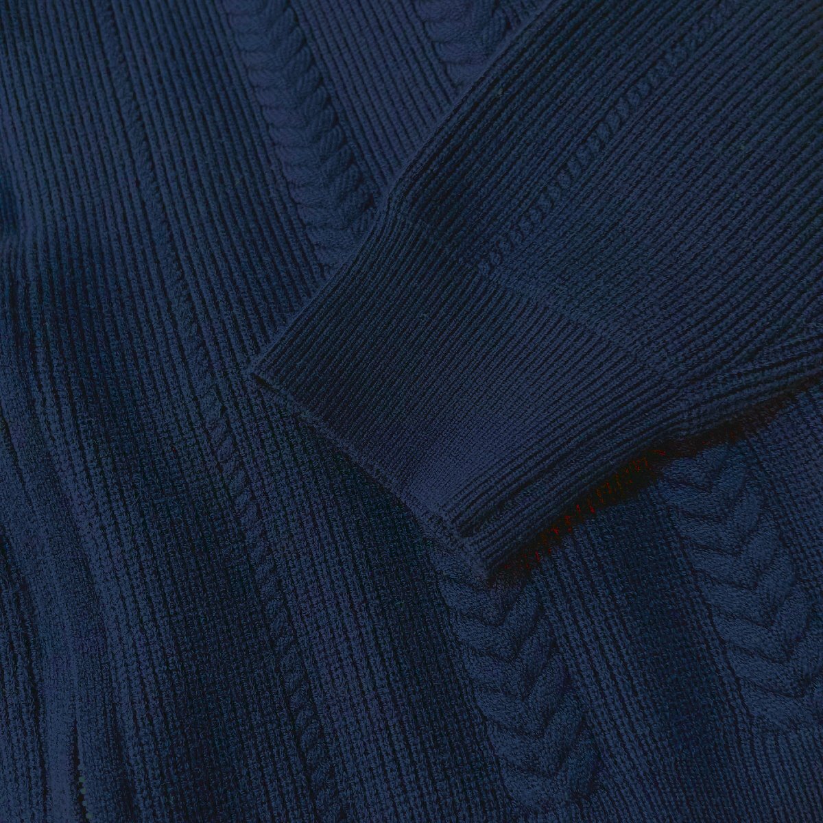 前開きのフルジップ仕様で、着脱が簡単かつ温度調節もしやすいデザイン。美しく施されたケーブル模様が、上品で洗練された印象を引き立てます。ほどよく身体に馴染むシルエットで、インナーにもアウターにも対応可能。