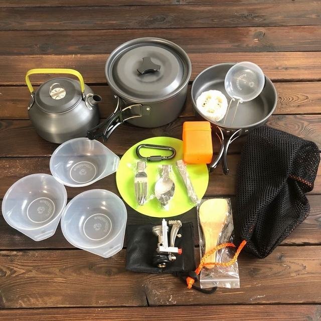 【仕様】材質:アルミニウム合金 重量:1050g 使用人数:2~3人(推薦) 鍋:17cm x 9cm フライパン:18cm x 4.5cm やかん:15cm x 8cm 付属品:PP材お碗お碗x3 竹しゃもじx1 スポンジx1 ナイフ×1 フォーク×1 スプーン×1 PPカッティングボード×1 ストーブ×1 Dリング×1 収納袋 ×1