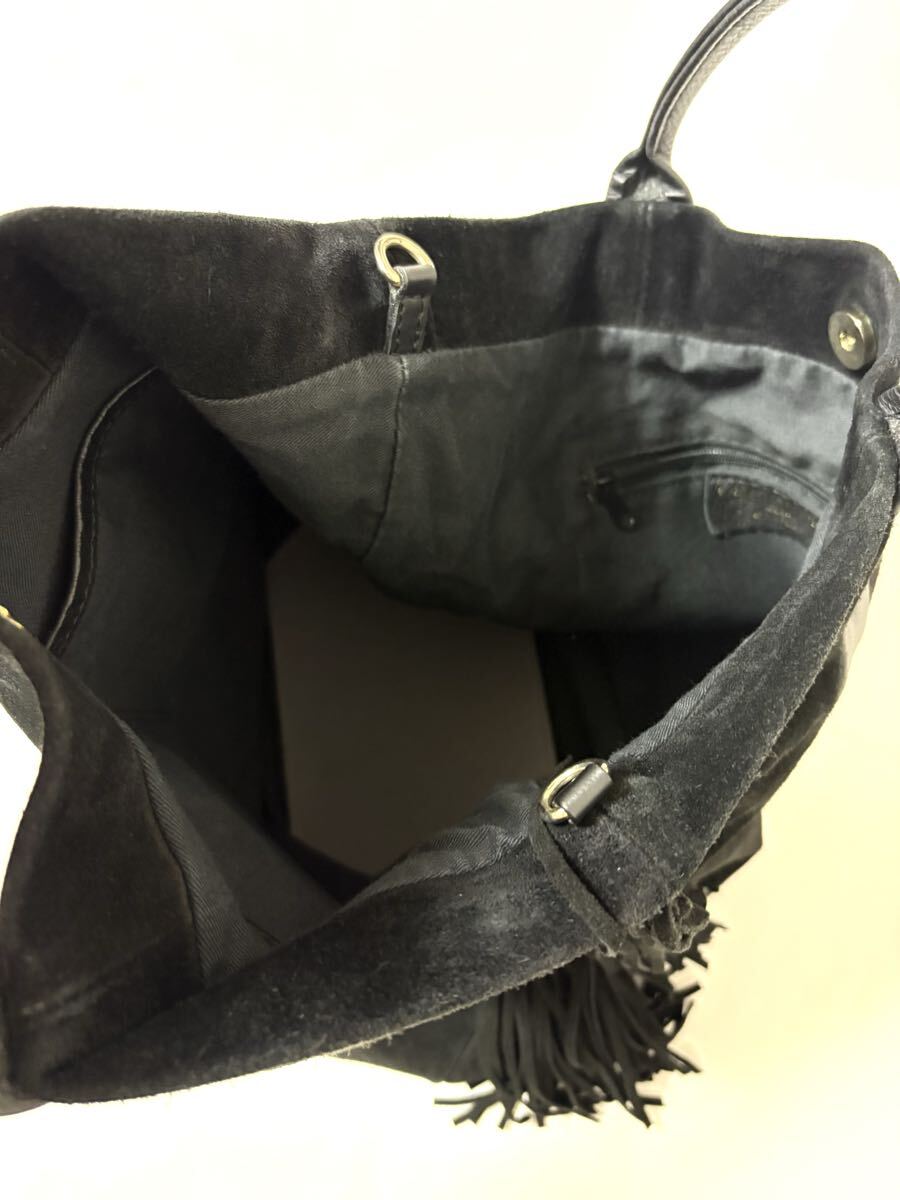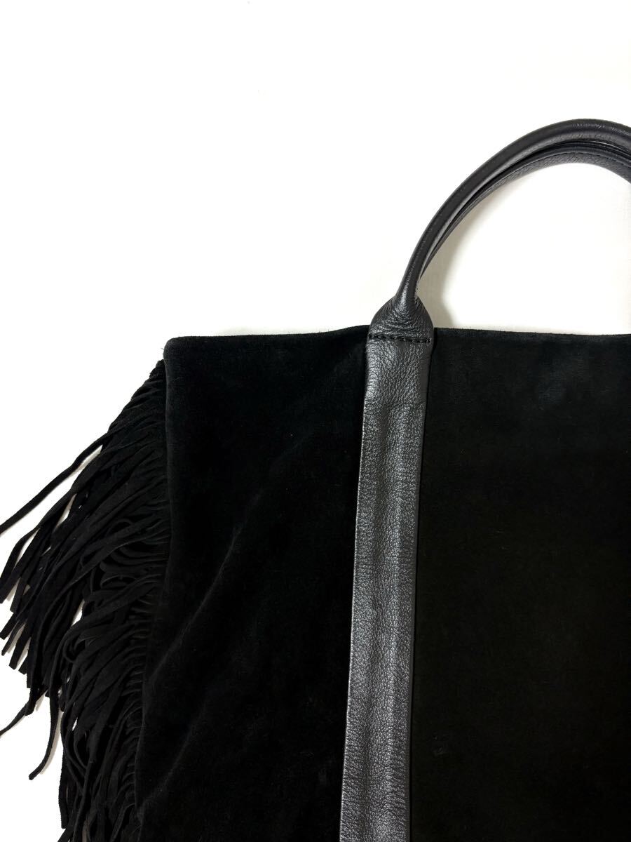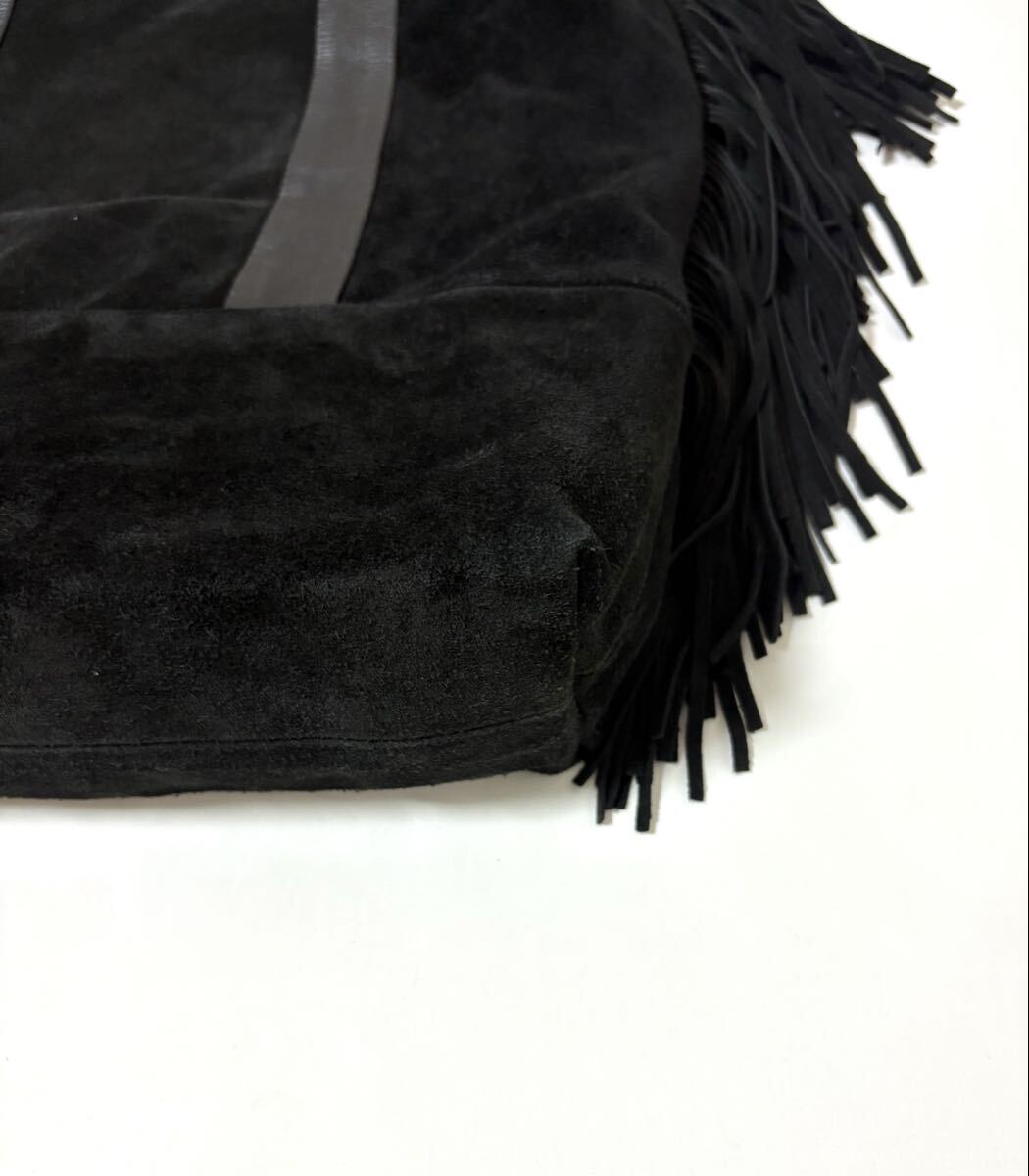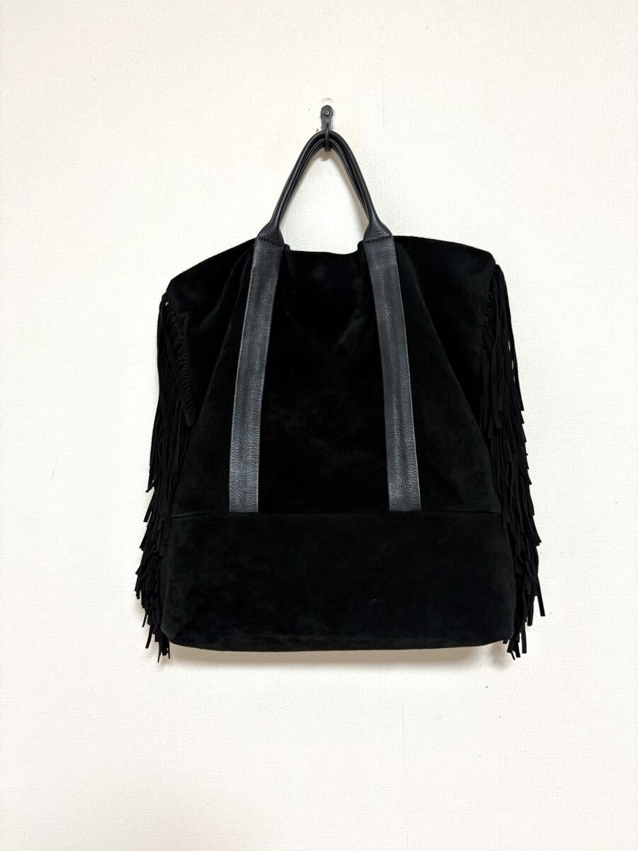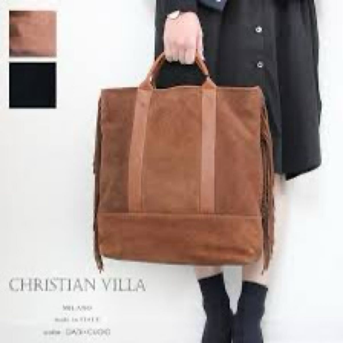 「クリスチャンヴィラ」のトートバッグです。サイズ・・・縦約39cm、横約38cm、マチ約10cm。素材・・・レザー(スエード)。カラー・・・黒。イタリア製。サイドについたフリンジがアクセントになったトートバッグです。本体はスエードでしっとりとした風合いで、大人っぽく使えるデザインです。底板付きでしっかりと収納出来ます。数年前に購入し、1,2シーズン使用しました。スエード素材ならではの擦れや毛羽たちなどがあります。また、本来はショルダー紐付きでしたが紛失しており、現状での出品となります。目立つダメージはないですが、あくまでユーズドですので、神経質な方はご遠慮ください。保存袋等はありません。よろしくお願いいたします。