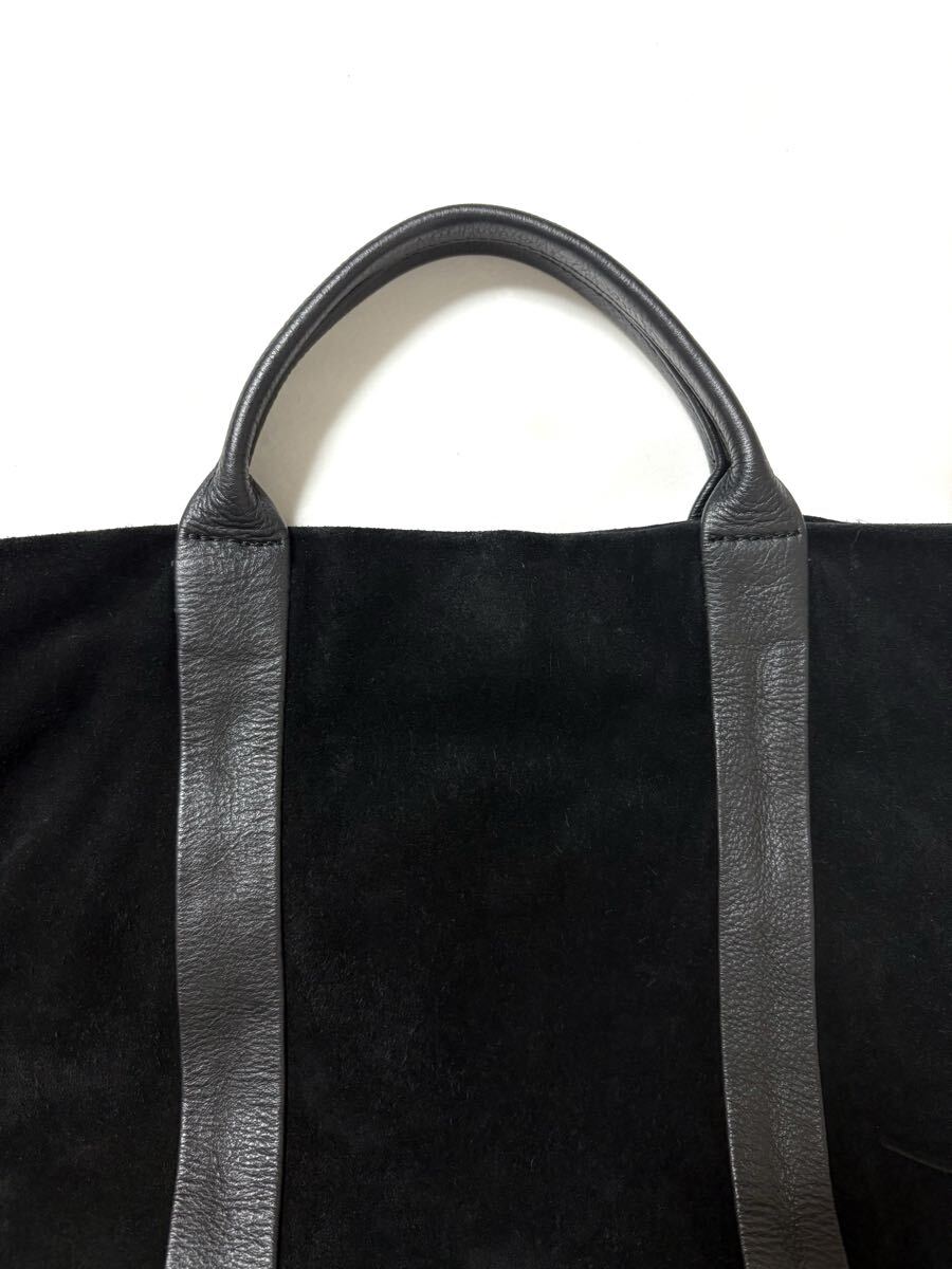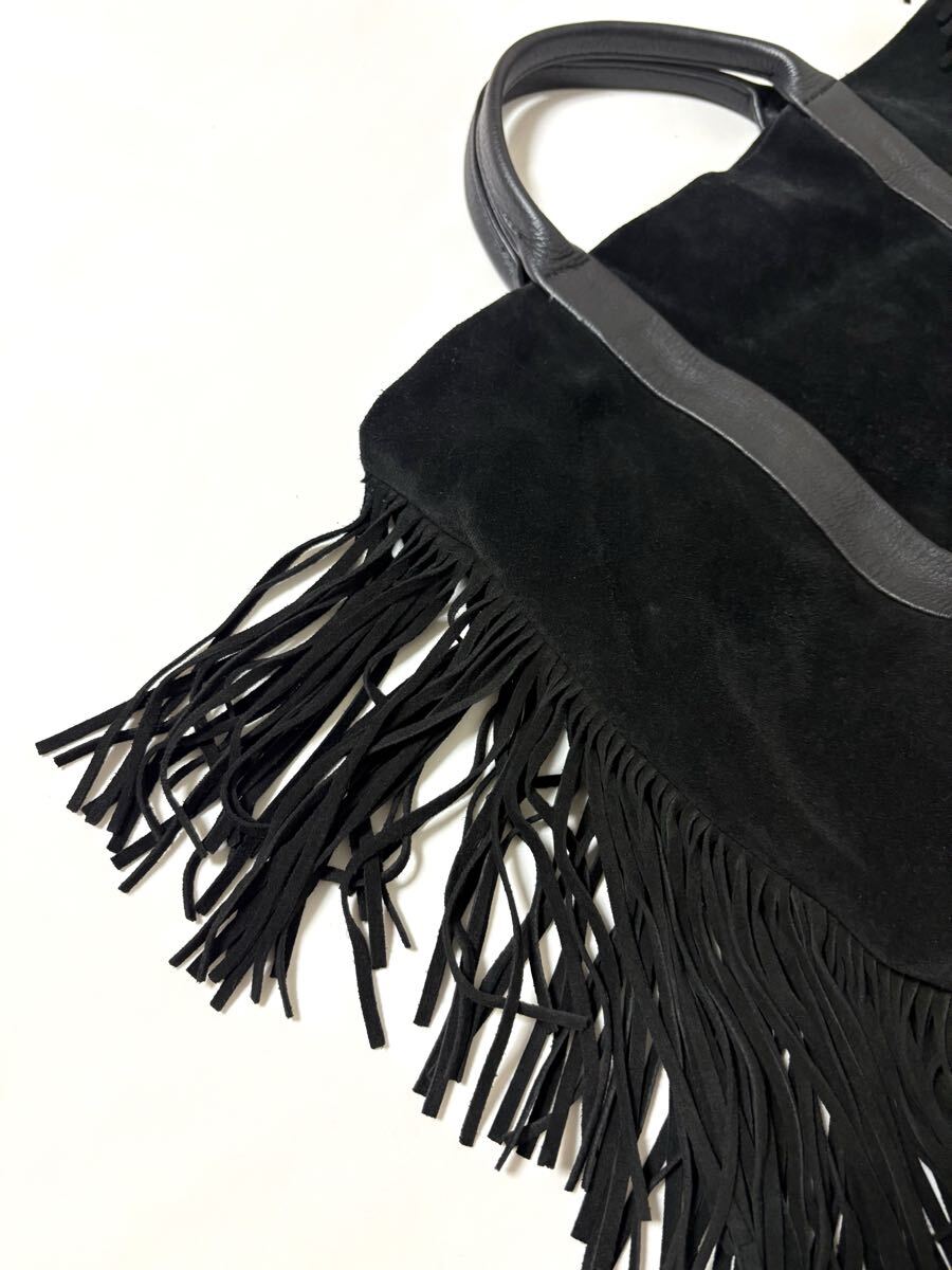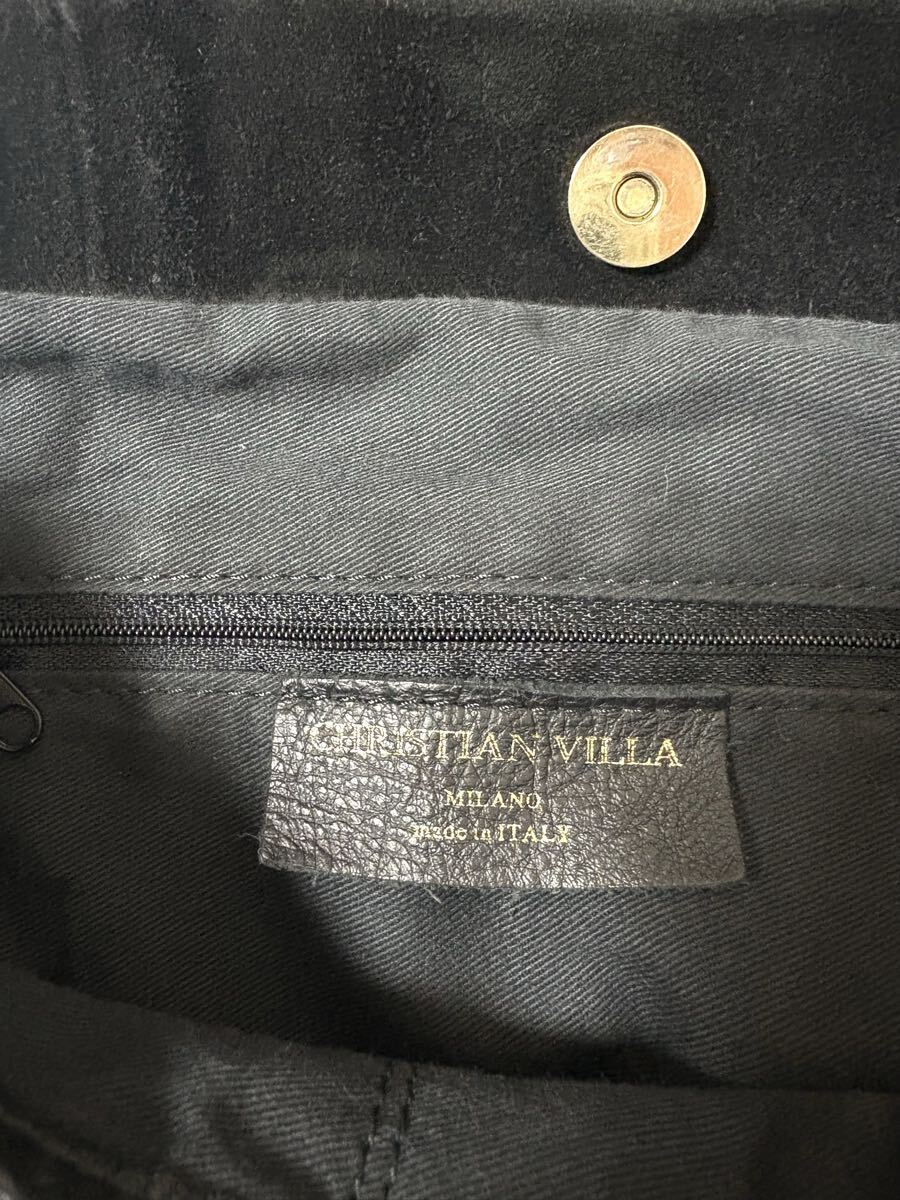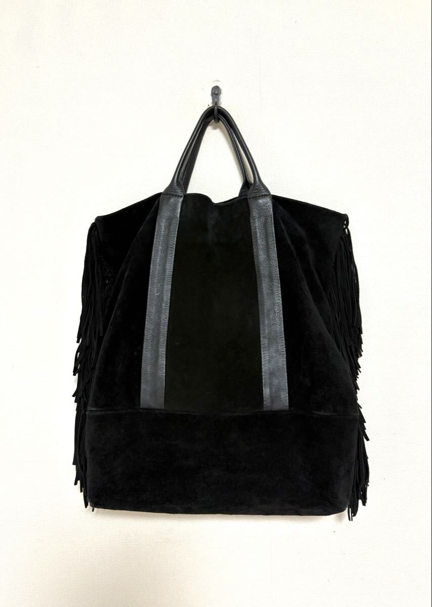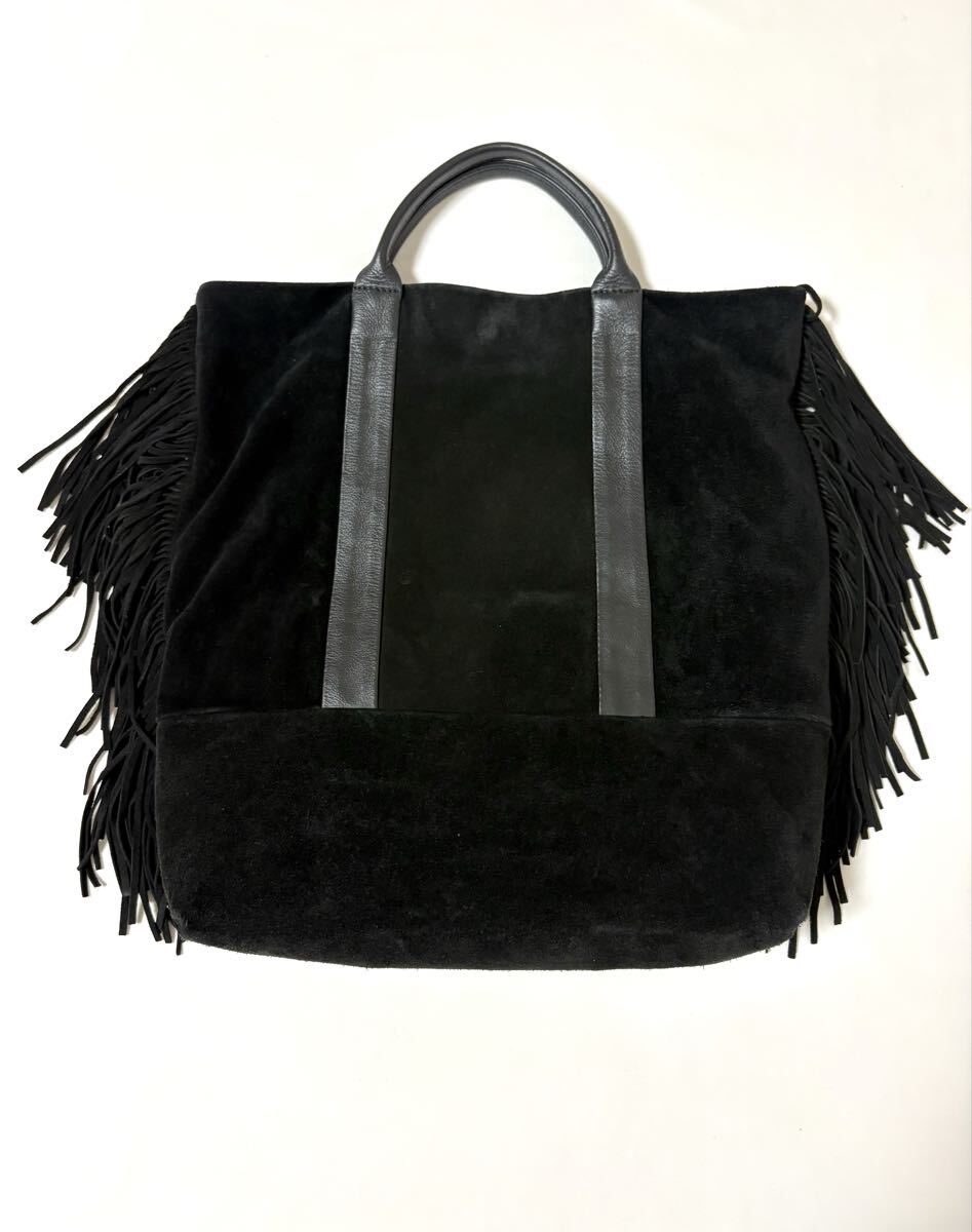 「クリスチャンヴィラ」のトートバッグです。サイズ・・・縦約39cm、横約38cm、マチ約10cm。素材・・・レザー(スエード)。カラー・・・黒。イタリア製。サイドについたフリンジがアクセントになったトートバッグです。本体はスエードでしっとりとした風合いで、大人っぽく使えるデザインです。底板付きでしっかりと収納出来ます。数年前に購入し、1,2シーズン使用しました。スエード素材ならではの擦れや毛羽たちなどがあります。また、本来はショルダー紐付きでしたが紛失しており、現状での出品となります。目立つダメージはないですが、あくまでユーズドですので、神経質な方はご遠慮ください。保存袋等はありません。よろしくお願いいたします。