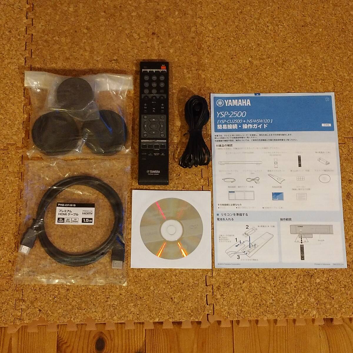 ・品物:センターユニット(YSP-CU2500)、ワイヤレスサブウーファー(NS-WSW120)、リモコン、インテリビームマイク(6m)、HDMIケーブル(プレミアム(Ver.2.0)・1.5m)、簡易接続・操作ガイド、サラウンド確認用DVD、