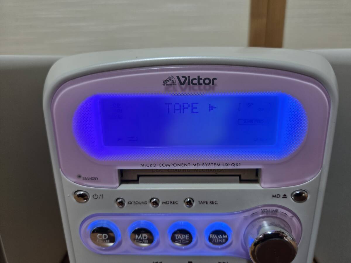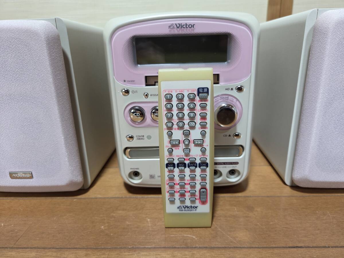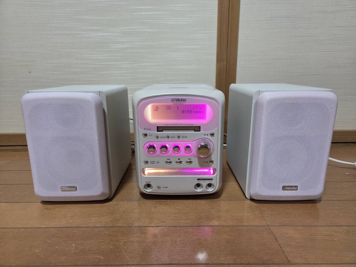 ビクターのマイクロコンポーネントmdシステム、ux-qx1、スピーカー、リモコン、am、fmアンテナです。画像の様にcd再、md、カセットテープ、音だし確認しました。画像にはありませんが、am、fm受信、音だし確認しました。リモコンは全てのボタンで発行する事を確認しました。他は一切確認していません。発送はヤマト運輸の着払いです。中身を入れ換えてクレームを言う方が居ます、ノークレーム、ノーリターン、ノーキャンセルです。