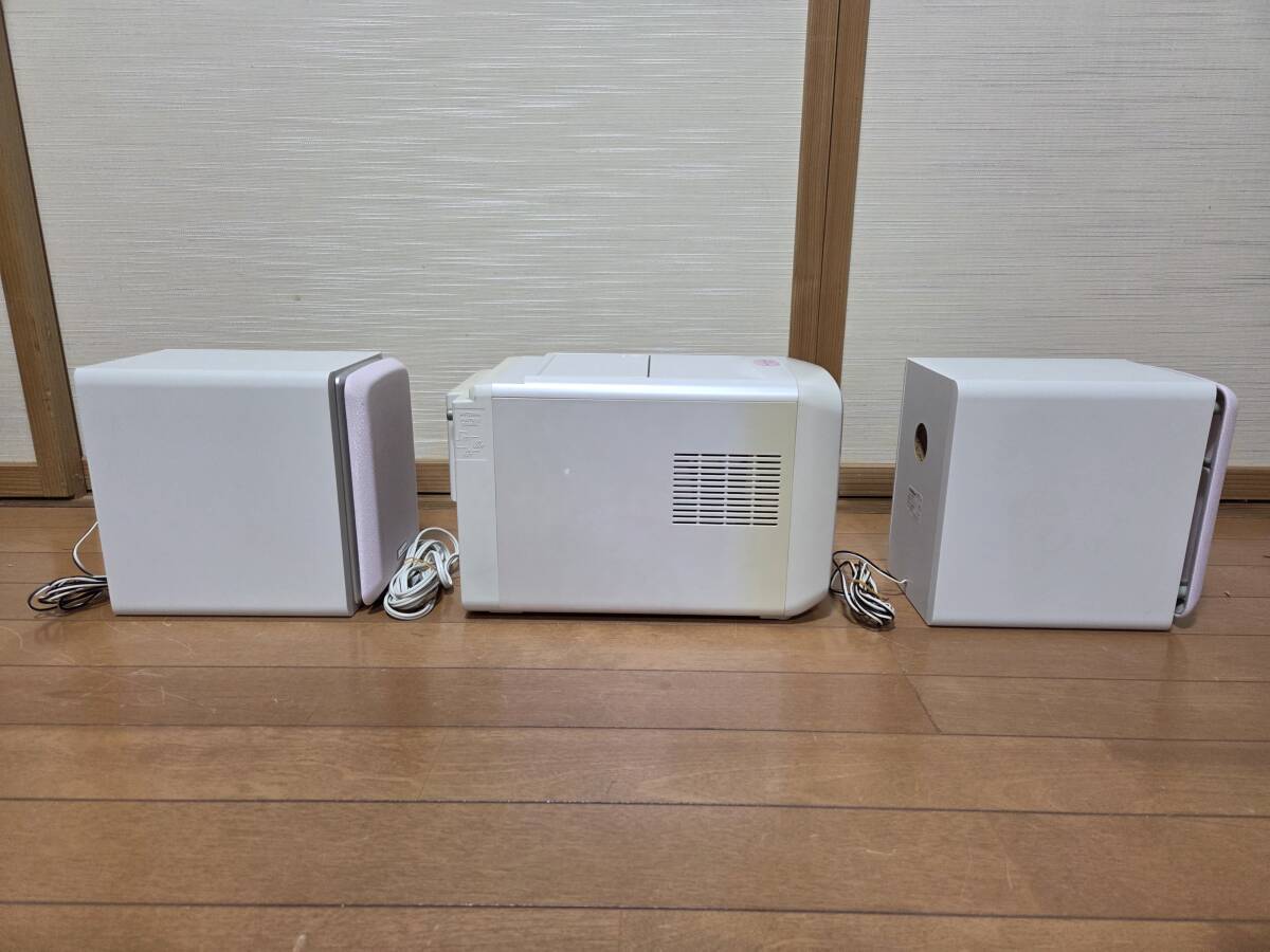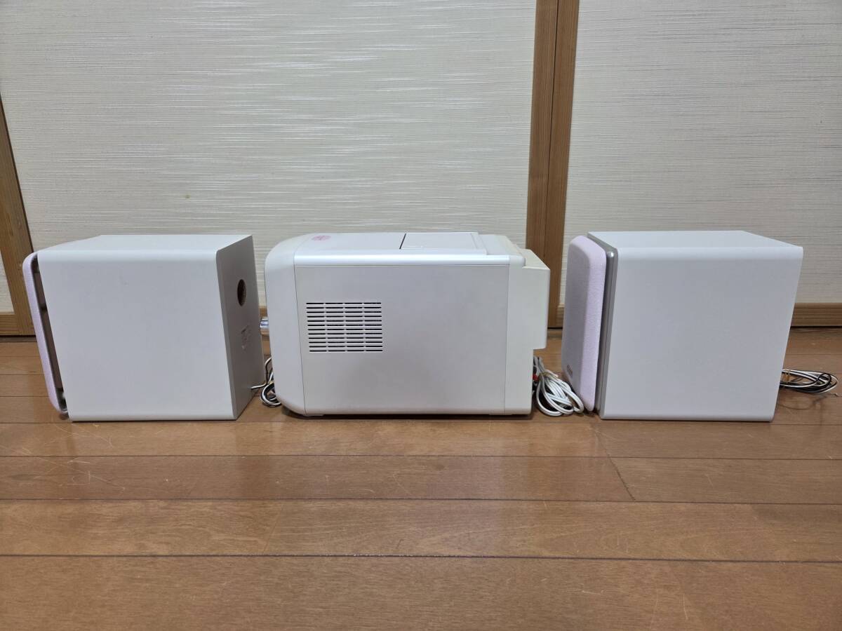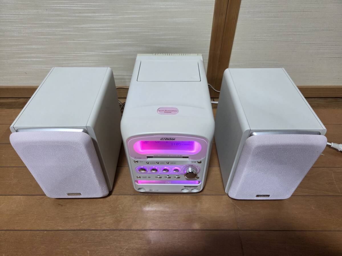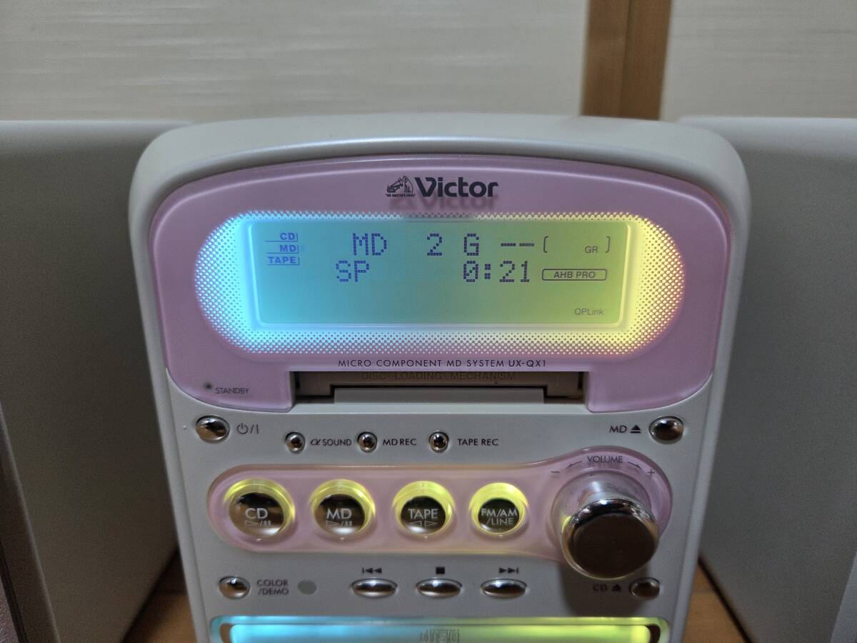 ビクターのマイクロコンポーネントmdシステム、ux-qx1、スピーカー、リモコン、am、fmアンテナです。画像の様にcd再、md、カセットテープ、音だし確認しました。画像にはありませんが、am、fm受信、音だし確認しました。リモコンは全てのボタンで発行する事を確認しました。他は一切確認していません。発送はヤマト運輸の着払いです。中身を入れ換えてクレームを言う方が居ます、ノークレーム、ノーリターン、ノーキャンセルです。