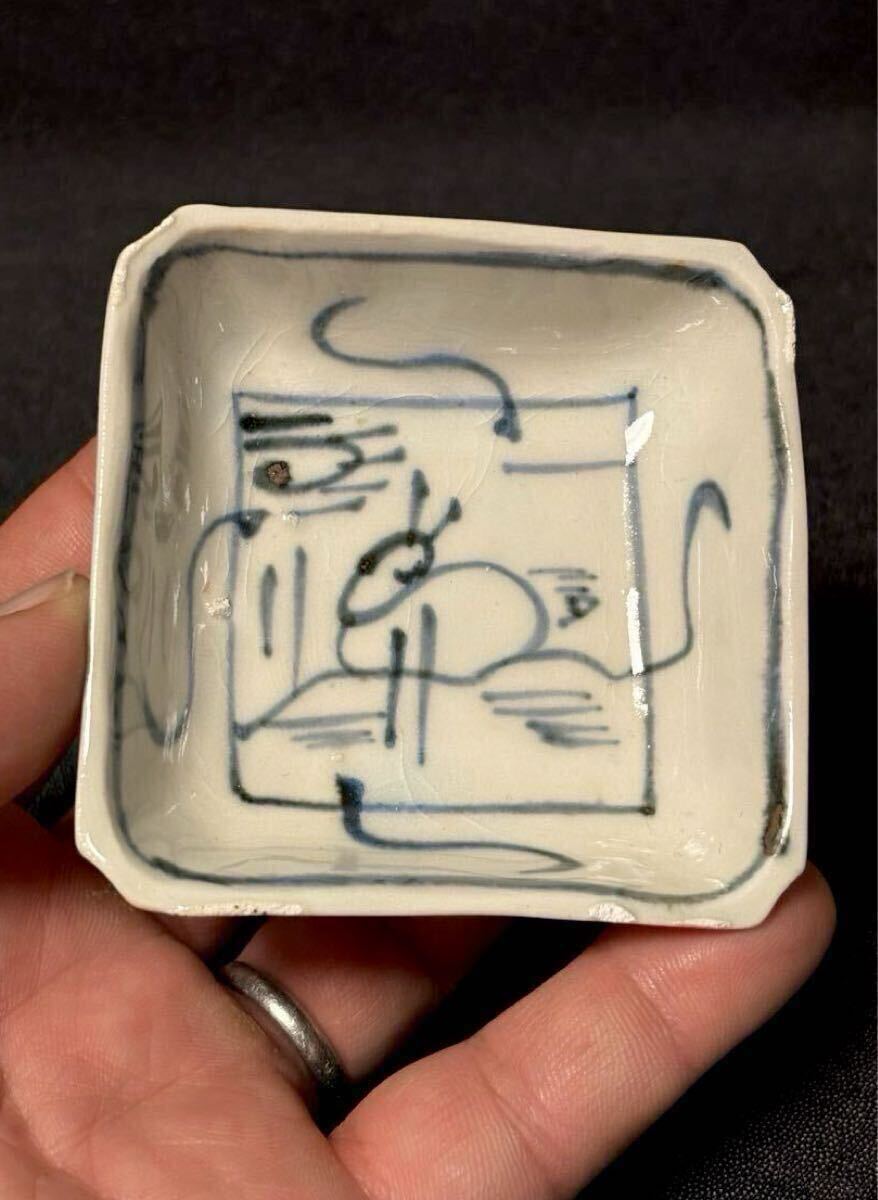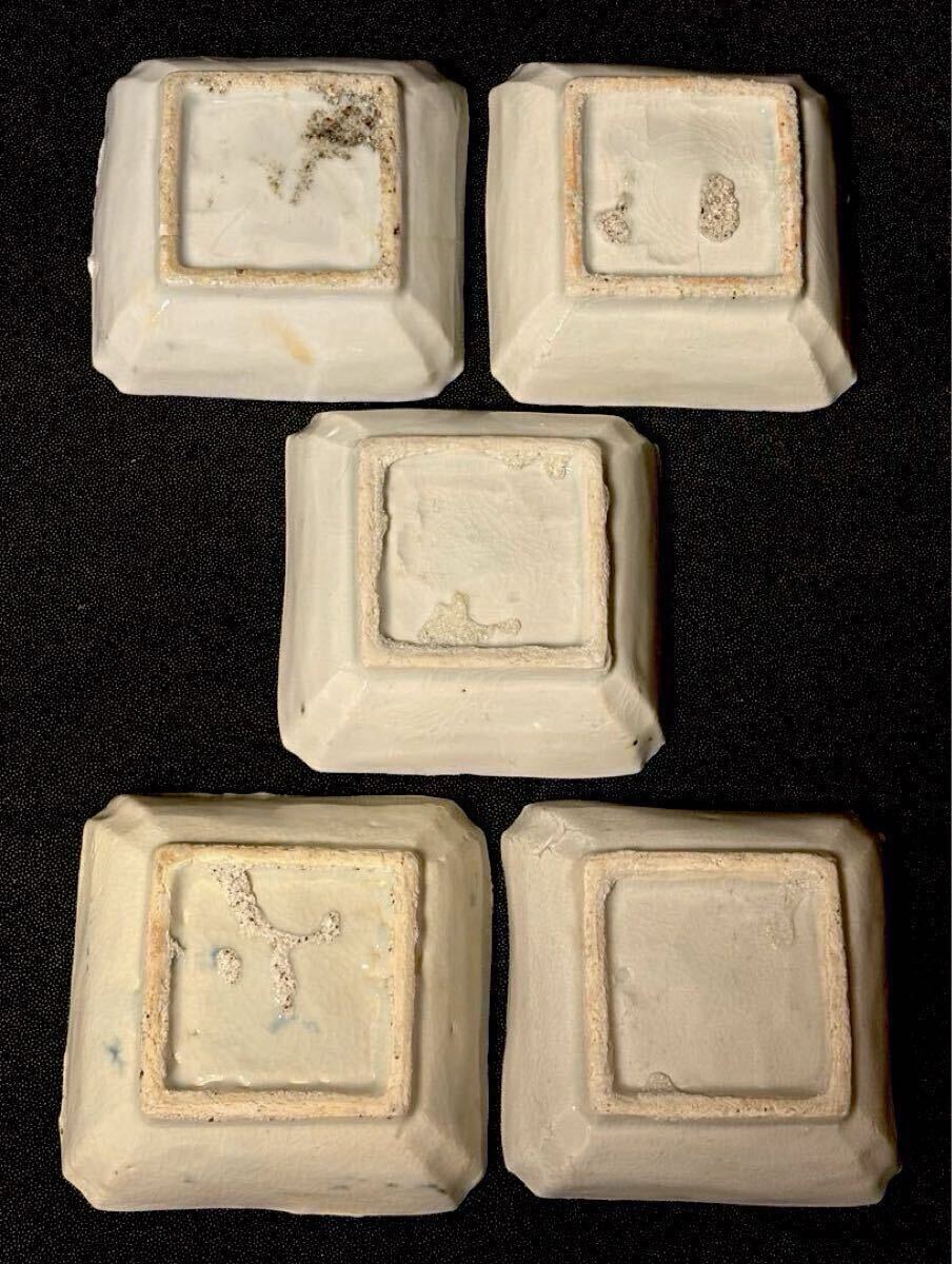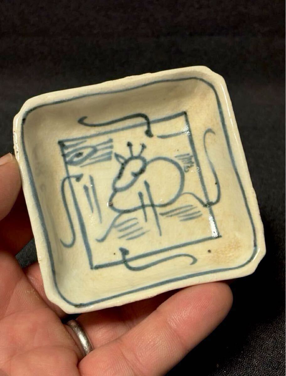 心踊るヘタウマで愉しい絵付けの古染付四方隅入りの小皿5客組です。この小皿なんと鹿が描かれているのです。何百回、何千回と描き到達したこのケレン味ない絵付け、なんとも日本人好みです。ちょっとした肴や醤油皿として酒宴で重宝されると思います。1枚はガラス継ぎ、1枚は甘手ですが、あとはうれしい無疵完品。サイズは高さ2.5、口径7.6四方センチくらいです。食卓を明るくしてくれる古染付だと思います。この機会にいかがでしょうか。当方酒器を中心に出品しております。よろしければ出品者の他の出品もご覧ください。発送はヤマト便で行わせていただきます。送料は一律800円(沖縄1500円、北海道は1200円、離島は1800円)です。ご不明な点はご質問欄よりお気軽にお問い合わせください。