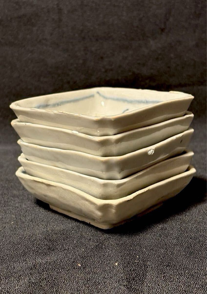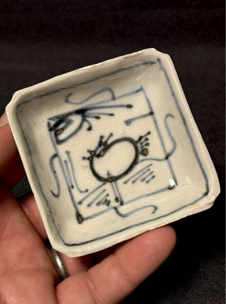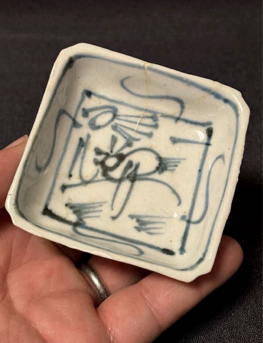心踊るヘタウマで愉しい絵付けの古染付四方隅入りの小皿5客組です。この小皿なんと鹿が描かれているのです。何百回、何千回と描き到達したこのケレン味ない絵付け、なんとも日本人好みです。ちょっとした肴や醤油皿として酒宴で重宝されると思います。1枚はガラス継ぎ、1枚は甘手ですが、あとはうれしい無疵完品。サイズは高さ2.5、口径7.6四方センチくらいです。食卓を明るくしてくれる古染付だと思います。この機会にいかがでしょうか。当方酒器を中心に出品しております。よろしければ出品者の他の出品もご覧ください。発送はヤマト便で行わせていただきます。送料は一律800円(沖縄1500円、北海道は1200円、離島は1800円)です。ご不明な点はご質問欄よりお気軽にお問い合わせください。