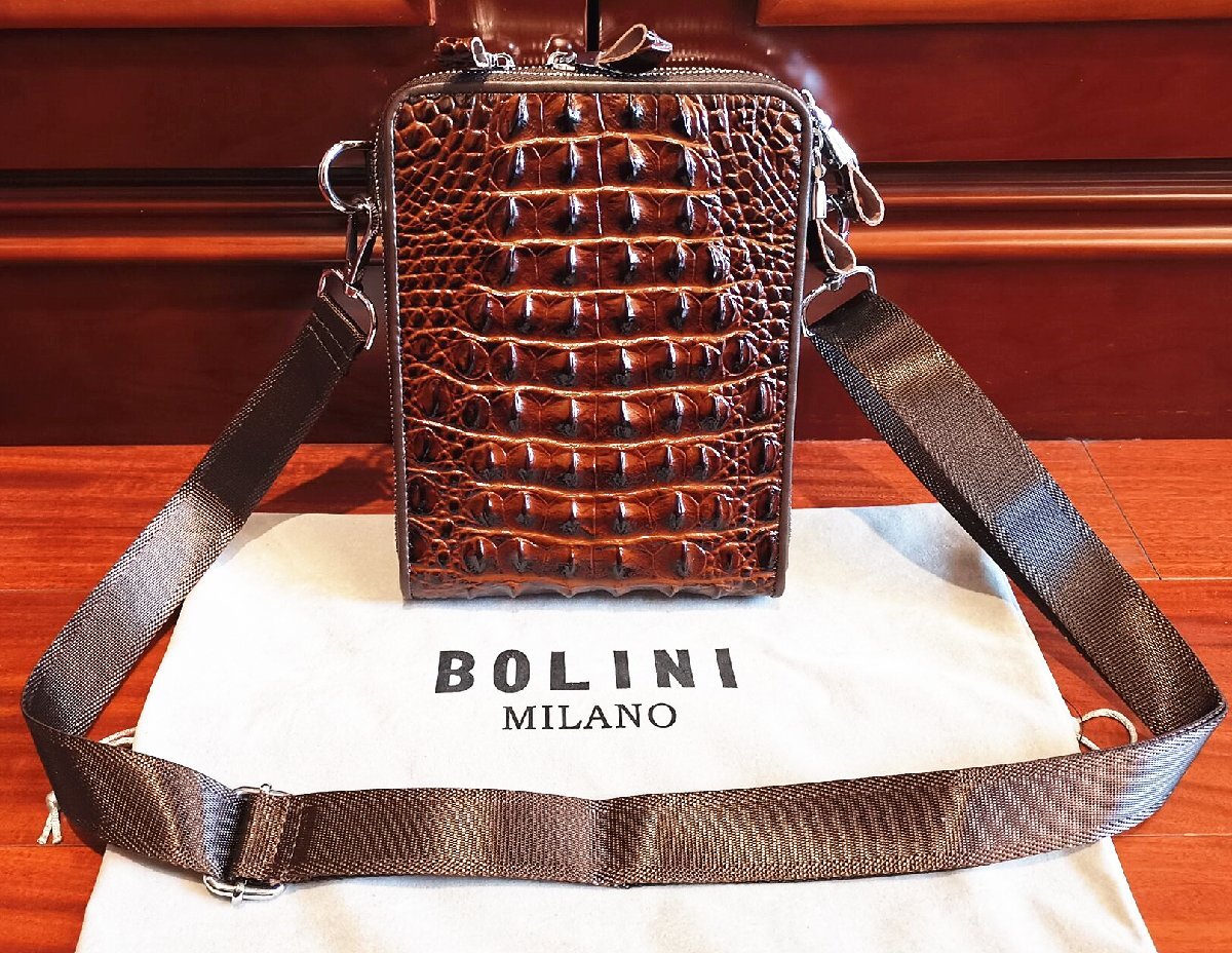 最高級イタリアミラノ発・ボリニのデザインショルダーバッグ。 当店でもなかなか出てこない超希少で素晴らしい1品。本体には最上級牛革を使用し上品なクロコダイル型押し仕上げしております。革ライクな表情を持ちながら、長く愛用できる一品。多くのファンから支持されている傑作です。