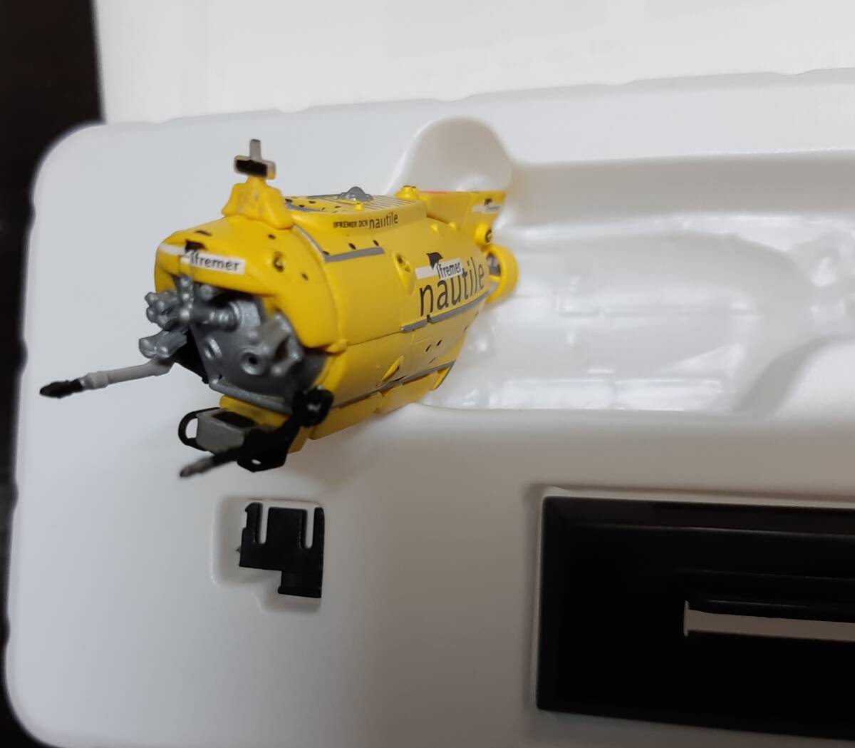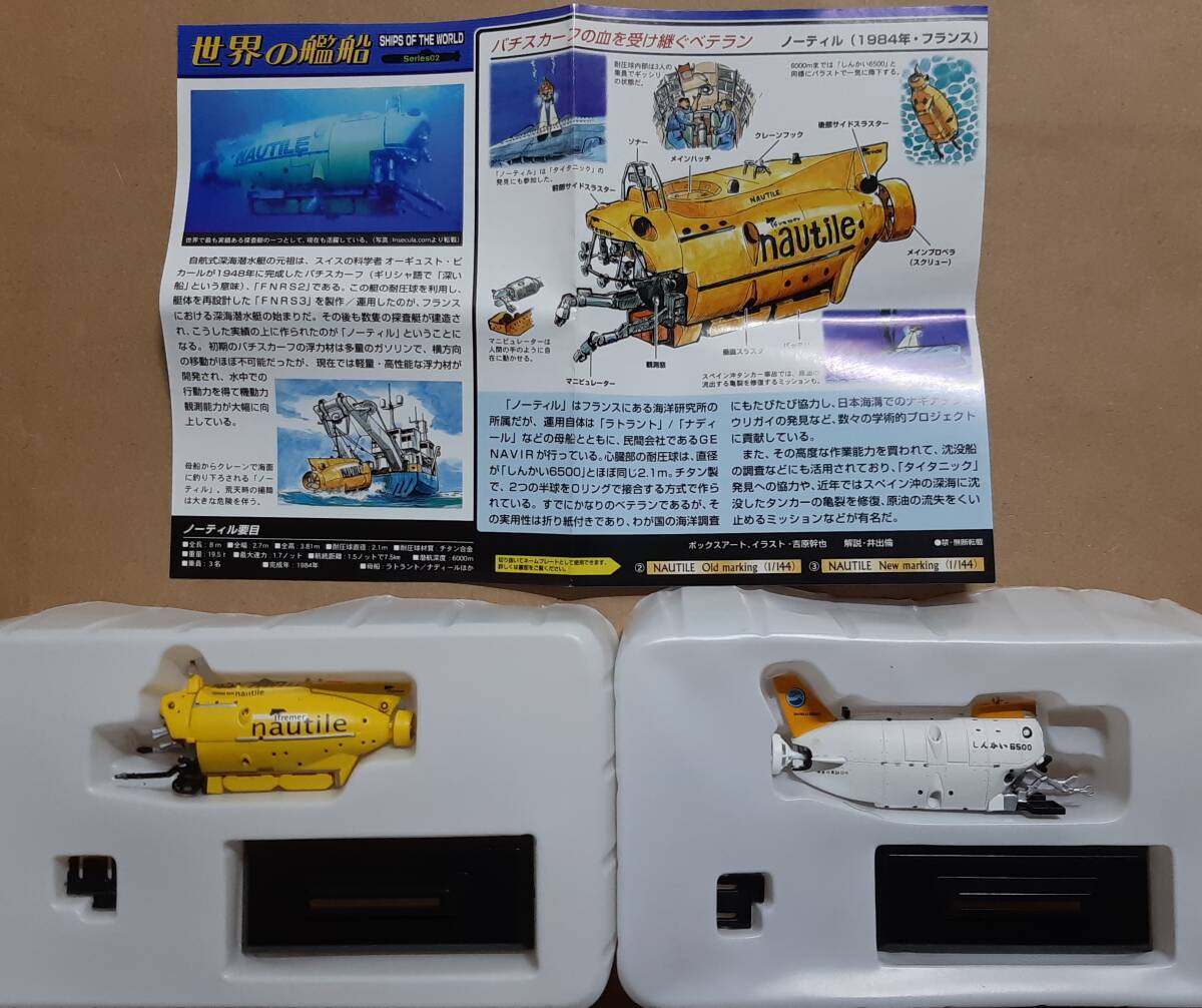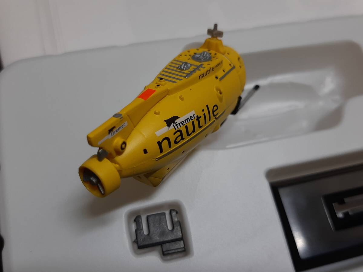 ノーティルの方はフタはありますが、外箱はありません。未展示の新品です。しんかい6500の方はフタも外箱も解説書もありませんが、未展示の新品です。どちらも1/144スケールです。しんかい6500の方は尾部のスクリューが左右に動かせます。