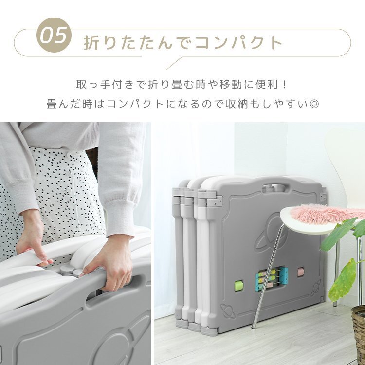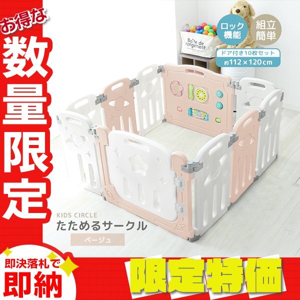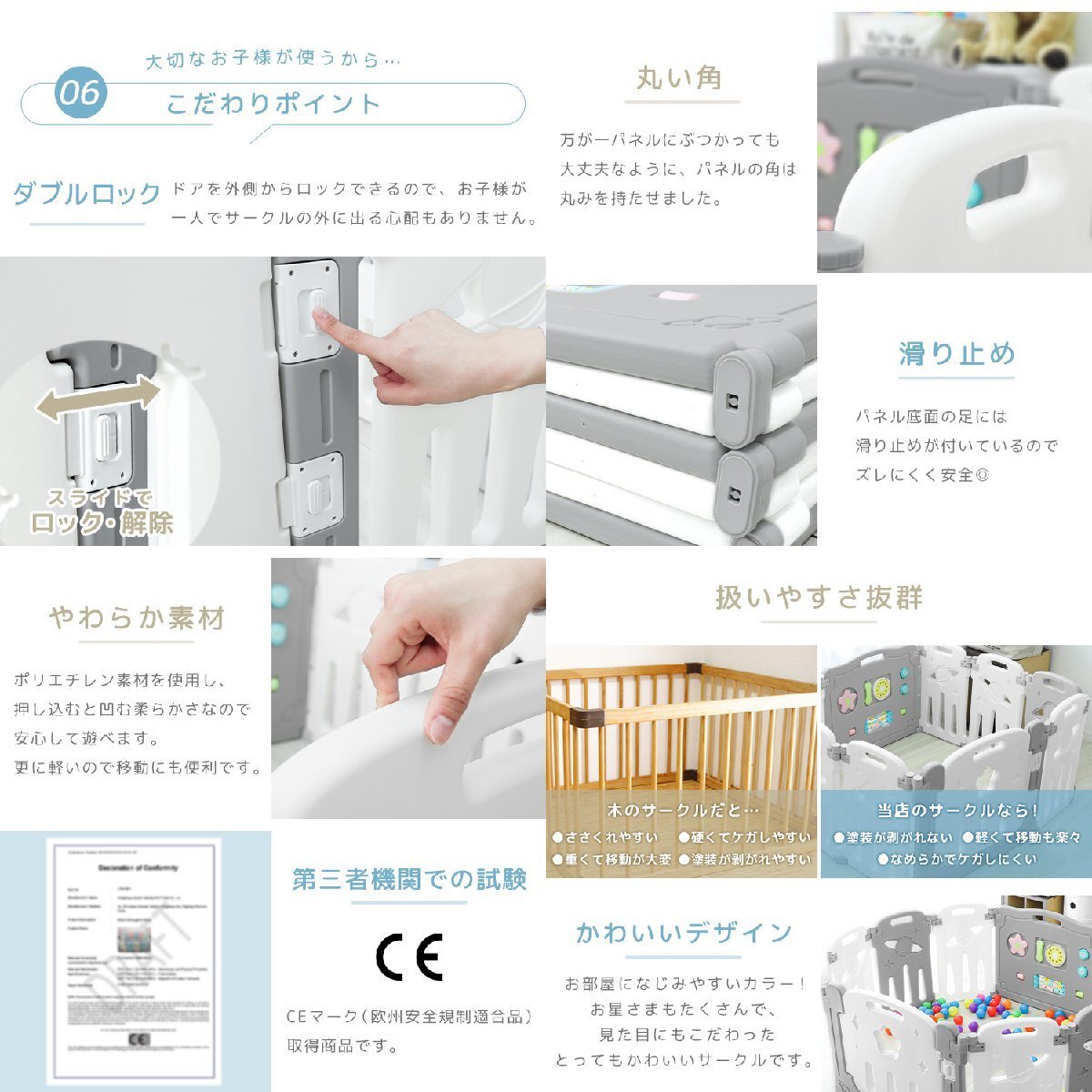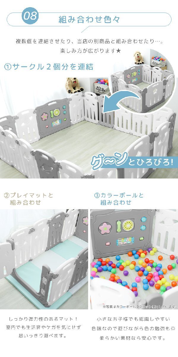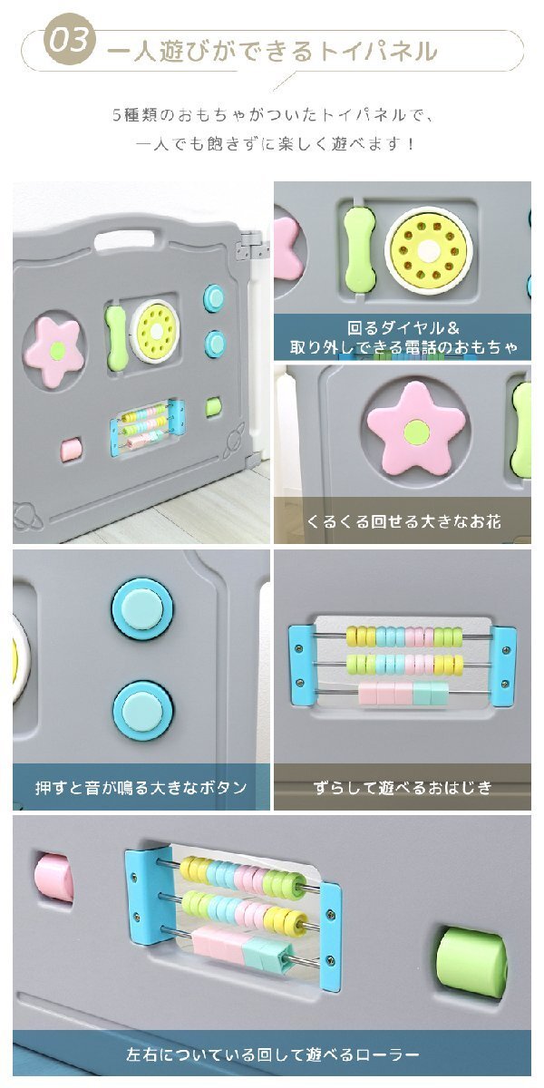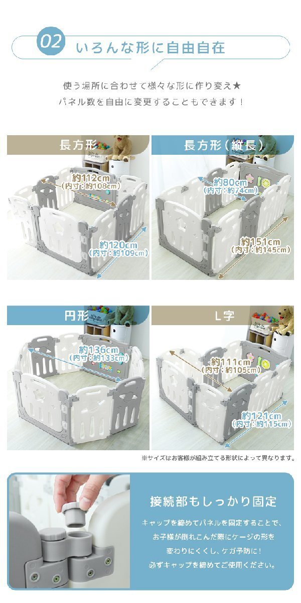 ママにも簡単に組み立てられるベビーサークルです。 赤ちゃんの脳の発達を助けるトイパネルも付いています。 工具不要で組み立て簡単! お好みの形に広げて接続部分のキャップを締めて固定するだけ! 外側から扉をロックすることができるので お子様が勝手に外へ出てしまう危険性がありません。 お手入れはサッと拭くだけ! 組み立てたまま拭けるのでお手入れも簡単! いつでも清潔を保てます。 簡単に取付けできる拡張パネル2枚セット付きも販売中! 【商品内容】 パネル ×10枚(おもちゃパネル ×1、扉パネル ×1、パネル ×8) 【商品詳細】 カラー:ベージュ×ホワイト 対象年齢:6ヶ月から8歳頃まで 素材:ポリエチレン 【サイズ(約)】 長方形:112×120cm(内寸:108×109cm) 長方形(縦長):151×80cm(内寸:145×74cm) 円形(直径):136cm(内寸:133cm) L字:111×121cm(内寸:105×115cm) 折りたたみ時:73×60×厚さ21cm ※誤差±2~3cm ■専用拡張パーツは こちら |