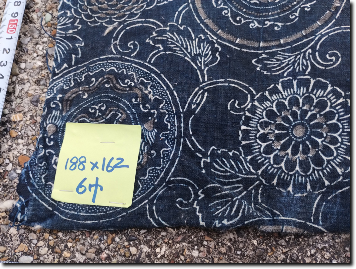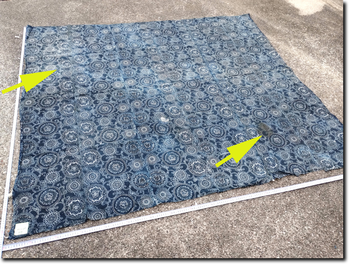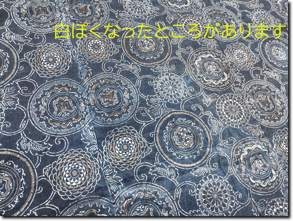 昔の藍染木綿型染めとなります。188cm(横) x 162cm(生地の長さ) 6幅です。約700ぐらむあり生地はしっかりしています。昔の生地幅30㎝+が6列繋がっています。長さ162㎝が6本です。程度は、画像のように大きな繕いが1つあります。ところどころ色がかすれて白くなっています。その他目立つシミが1つあります。その他多少のよごれわずかな難はあります。裏に綿がたくさんついています。詳しい状態は画像を参考にしてください。 藍は防虫、抗菌効果があり昔から寝具や野良着に使われています。シーツ、布団カバーではダニ除け効果が期待できます。入荷後未洗濯で、埃、糸くず、綿などついています。