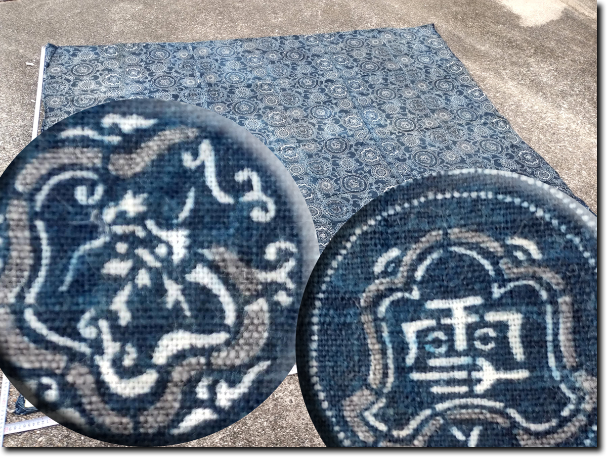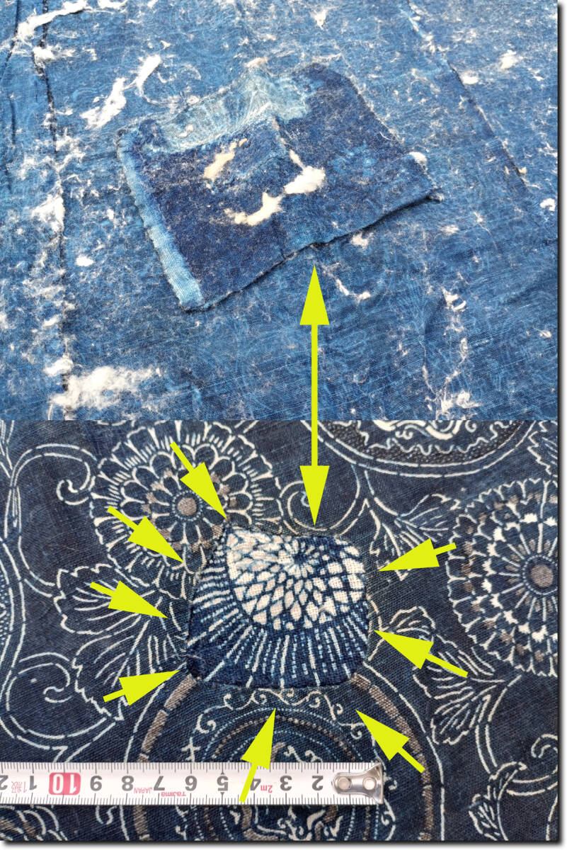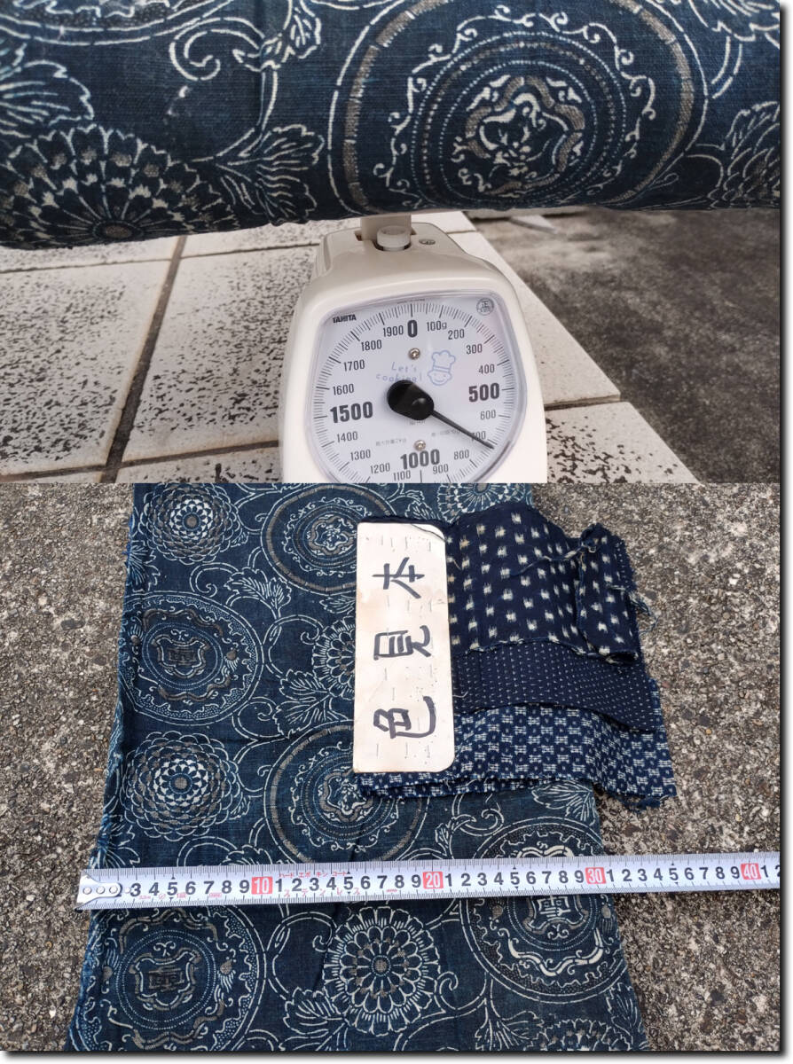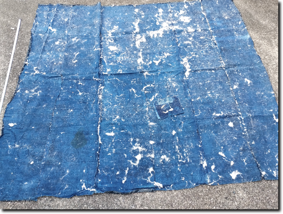 昔の藍染木綿型染めとなります。188cm(横) x 162cm(生地の長さ) 6幅です。約700ぐらむあり生地はしっかりしています。昔の生地幅30㎝+が6列繋がっています。長さ162㎝が6本です。程度は、画像のように大きな繕いが1つあります。ところどころ色がかすれて白くなっています。その他目立つシミが1つあります。その他多少のよごれわずかな難はあります。裏に綿がたくさんついています。詳しい状態は画像を参考にしてください。 藍は防虫、抗菌効果があり昔から寝具や野良着に使われています。シーツ、布団カバーではダニ除け効果が期待できます。入荷後未洗濯で、埃、糸くず、綿などついています。