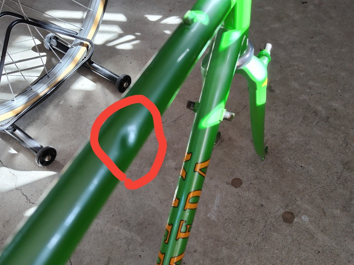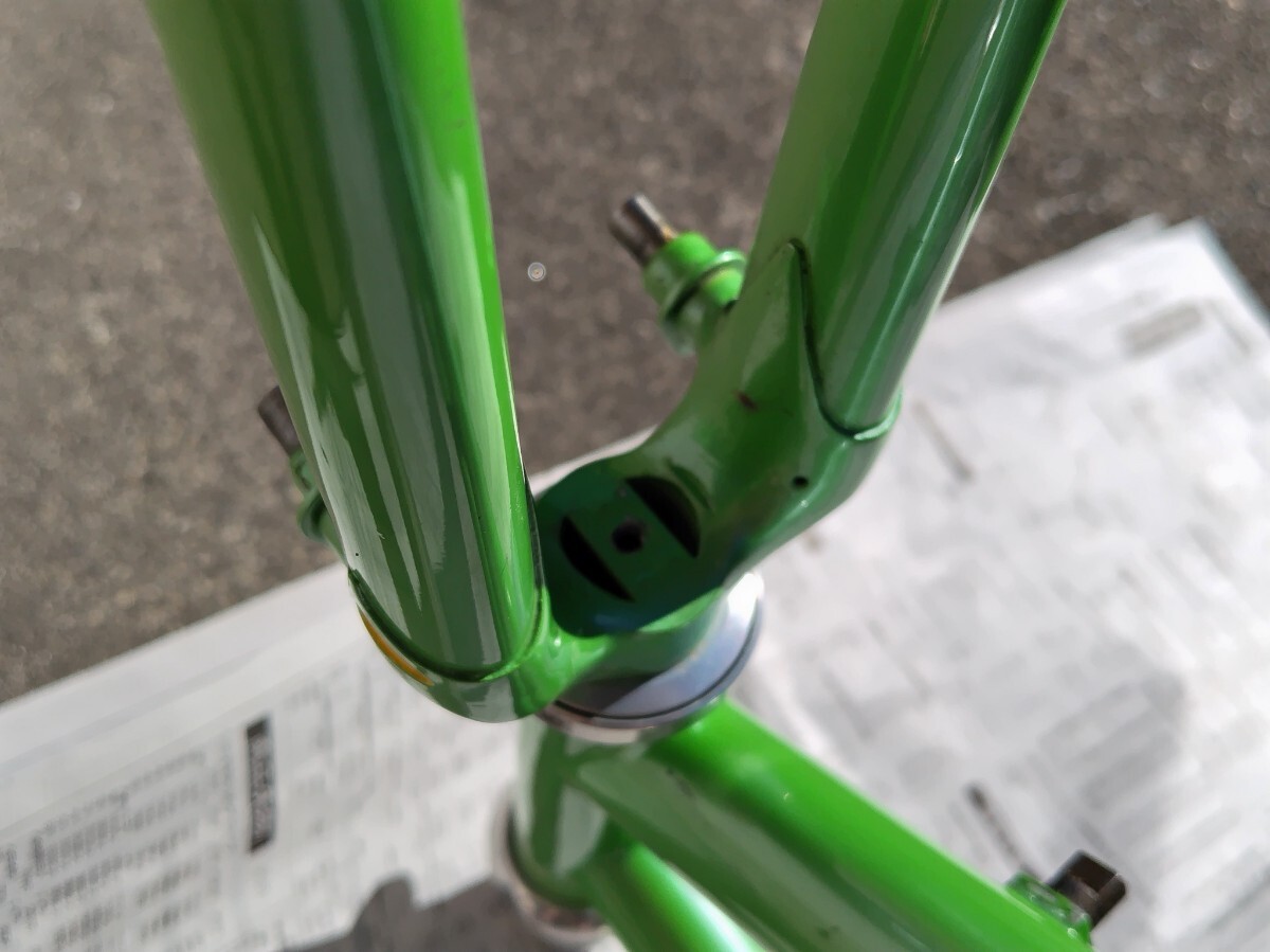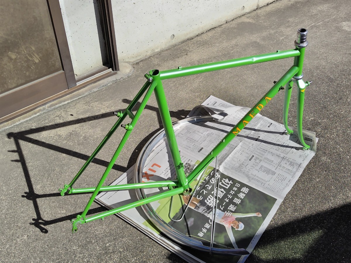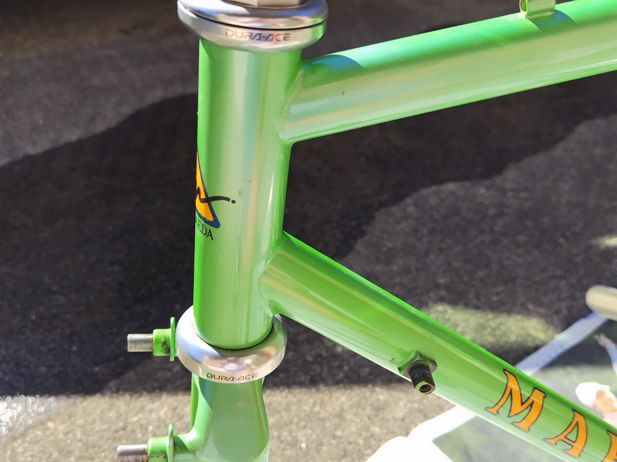 サイクルテクニカマエダさんのスポルティーフフレーム。サイズは素人計測で540ct 540ccミリくらい。エンド幅は126.5ミリくらいの6速仕様。ブレーキはMAFACレーサーかCompetitionが合います。2010年ころの作と思われます。滑らかなラグレス処理に美しいマエダ曲げのフォーク。よごれやきずはあるものの塗装も鮮やかです。超薄パイプの軽量フレームで、坂道も驚くほど良く進みます。素人計測で2.345キロ。惜しむらくはトップチューブに大きな凹みがあります。また、トークリップがガードに当たります。ワタクシ的には全く支障なく乗っていましたが、気になる方、完品を求められる方は入札なさらないでください。クレームをお受けすることはできませんので、納得の上でお願いします。最後に、ヘッドパーツはデュラエースで、必要であれば装着していた本所ガードをお付けしますが、ダルマのナットが一つありません。発送は西濃の自転車輸送便になると思います。