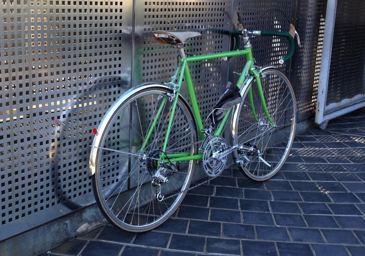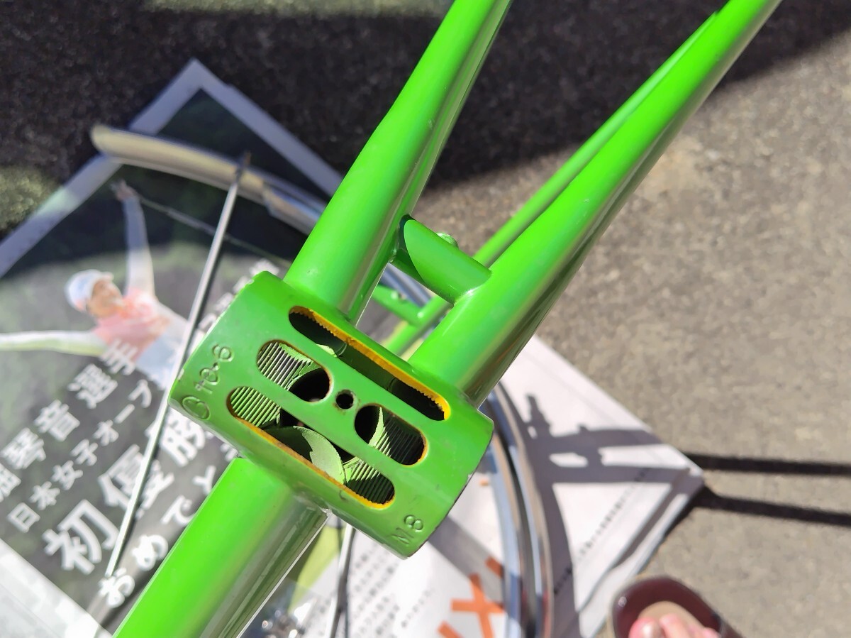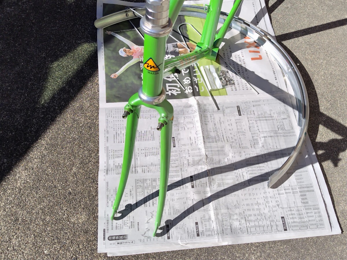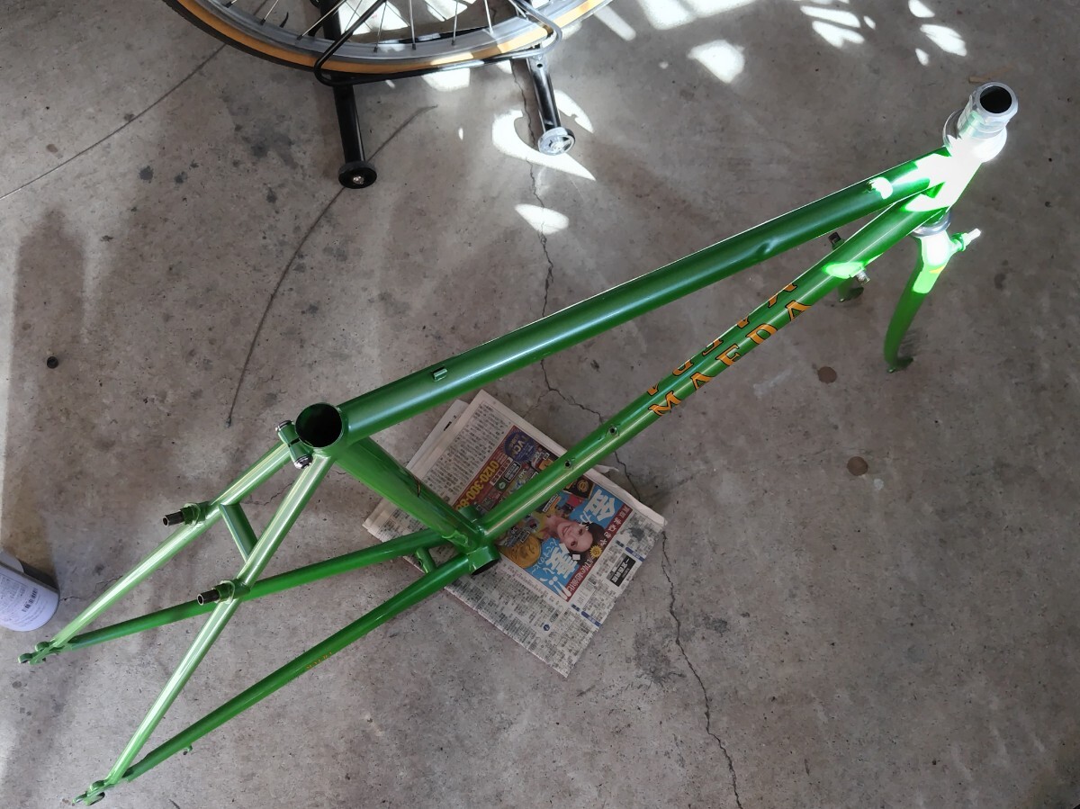 サイクルテクニカマエダさんのスポルティーフフレーム。サイズは素人計測で540ct 540ccミリくらい。エンド幅は126.5ミリくらいの6速仕様。ブレーキはMAFACレーサーかCompetitionが合います。2010年ころの作と思われます。滑らかなラグレス処理に美しいマエダ曲げのフォーク。よごれやきずはあるものの塗装も鮮やかです。超薄パイプの軽量フレームで、坂道も驚くほど良く進みます。素人計測で2.345キロ。惜しむらくはトップチューブに大きな凹みがあります。また、トークリップがガードに当たります。ワタクシ的には全く支障なく乗っていましたが、気になる方、完品を求められる方は入札なさらないでください。クレームをお受けすることはできませんので、納得の上でお願いします。最後に、ヘッドパーツはデュラエースで、必要であれば装着していた本所ガードをお付けしますが、ダルマのナットが一つありません。発送は西濃の自転車輸送便になると思います。