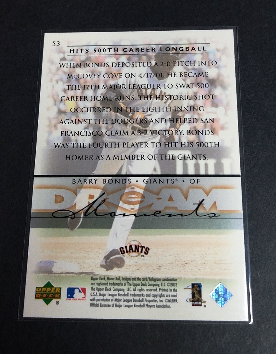 MLB 2002年upper deck バリー・ボンズ(ジャイアンツ) HITS 500TH CAREER HOMER No,53。Giants BARRY BONDS