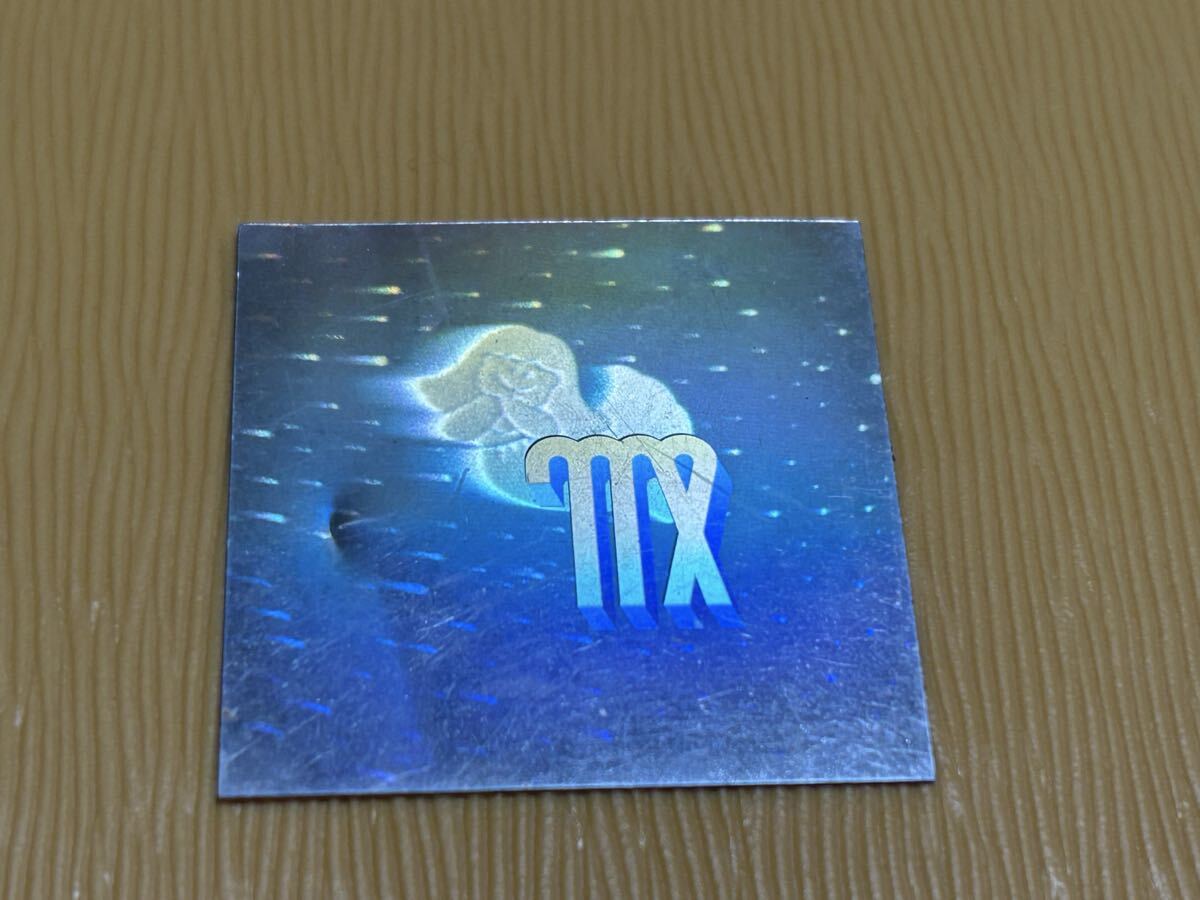 ドキドキ学園チョコではなく、アーミー星人チョコに封入されていたと推定されている星座シールです。ドキドキ学園版以上にアーミー星人版の12星座コンプリートは高難易度です。表面は1ヶ所凹み痕があります。目立つ折れやホロ欠けはないので妥協できるレベルだと思います。裏面はアーミー星人特有のチョコ汚れがあります。ファイリングはシール表面側でしている方であれば、さほど気にならないと思います。ファイル穴埋め優先の方向けです。
