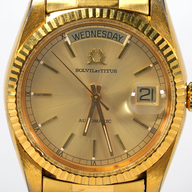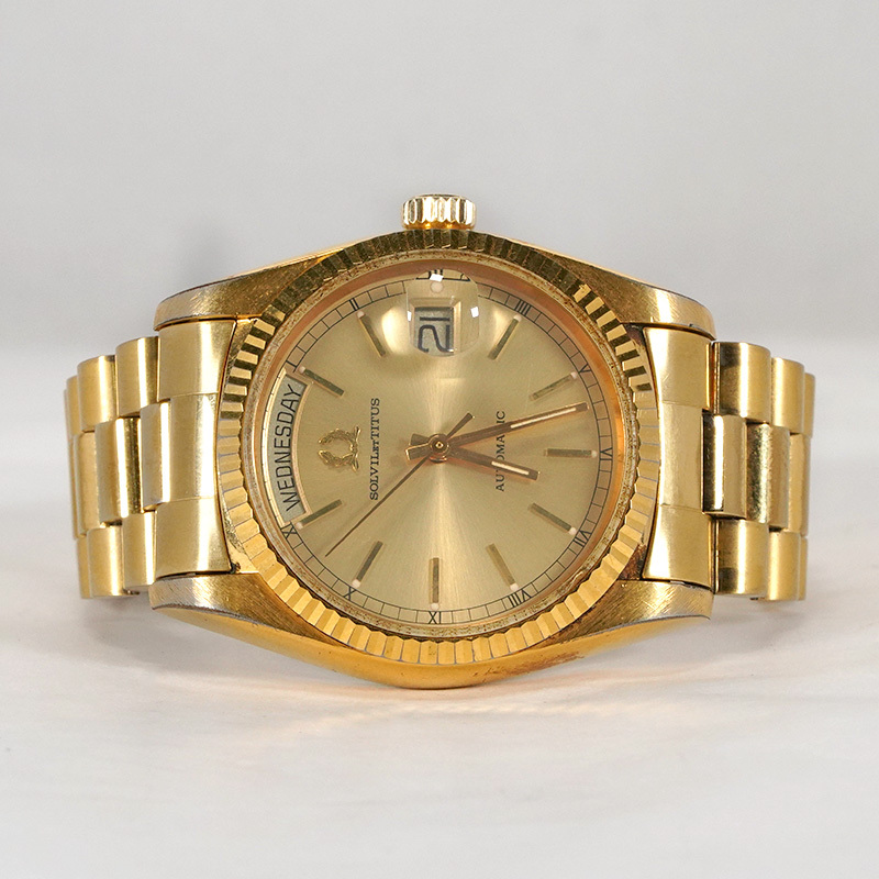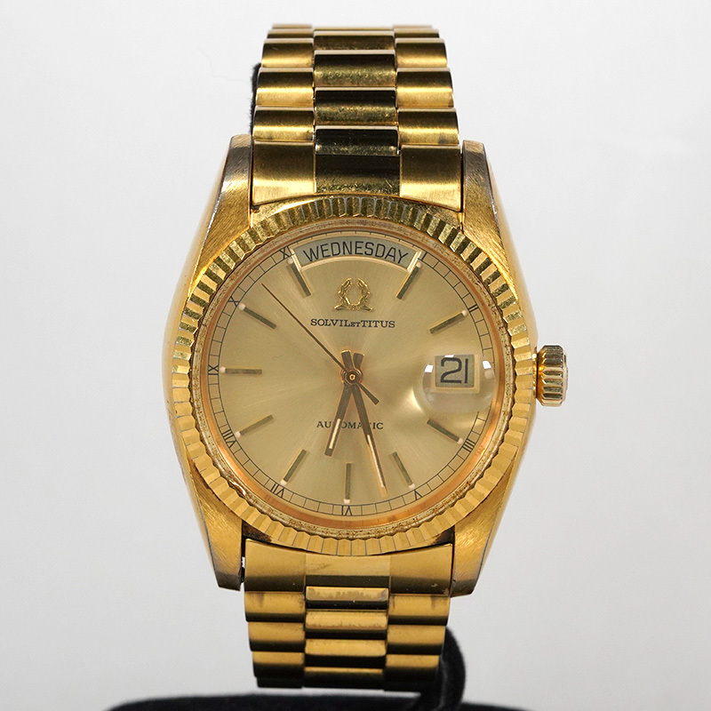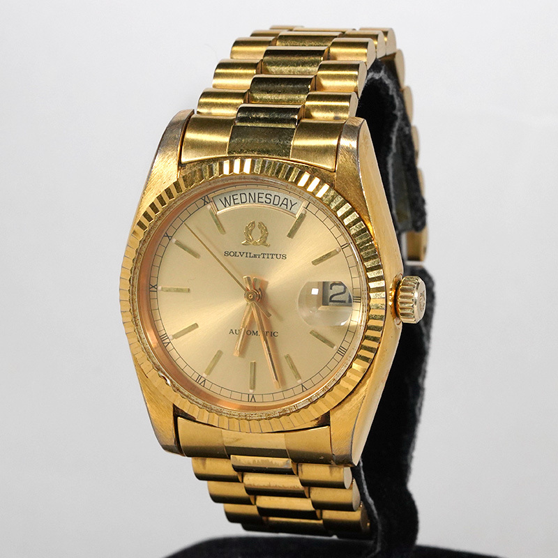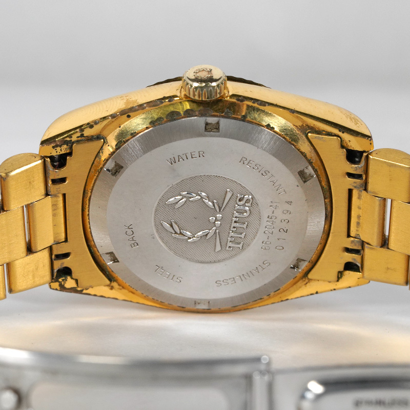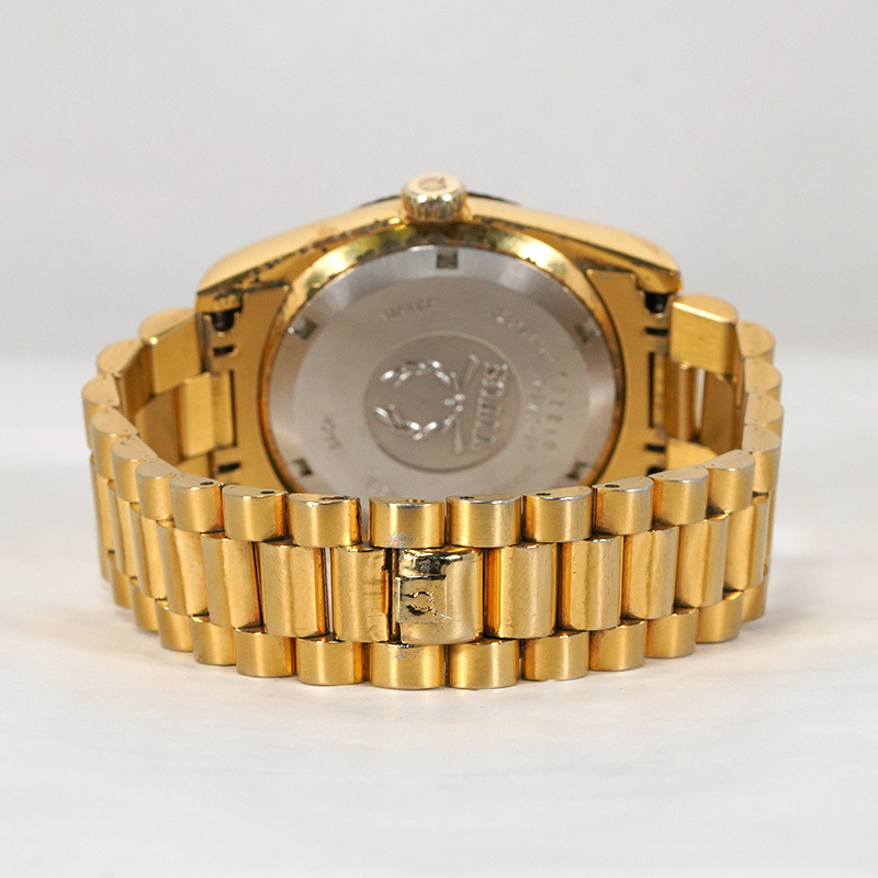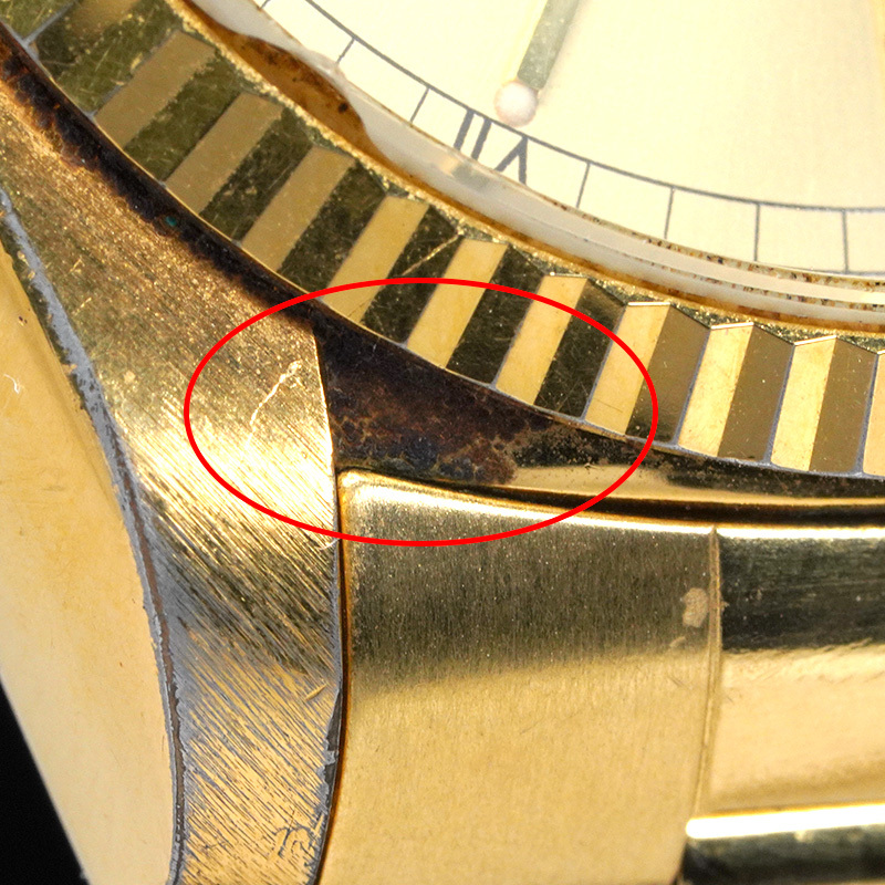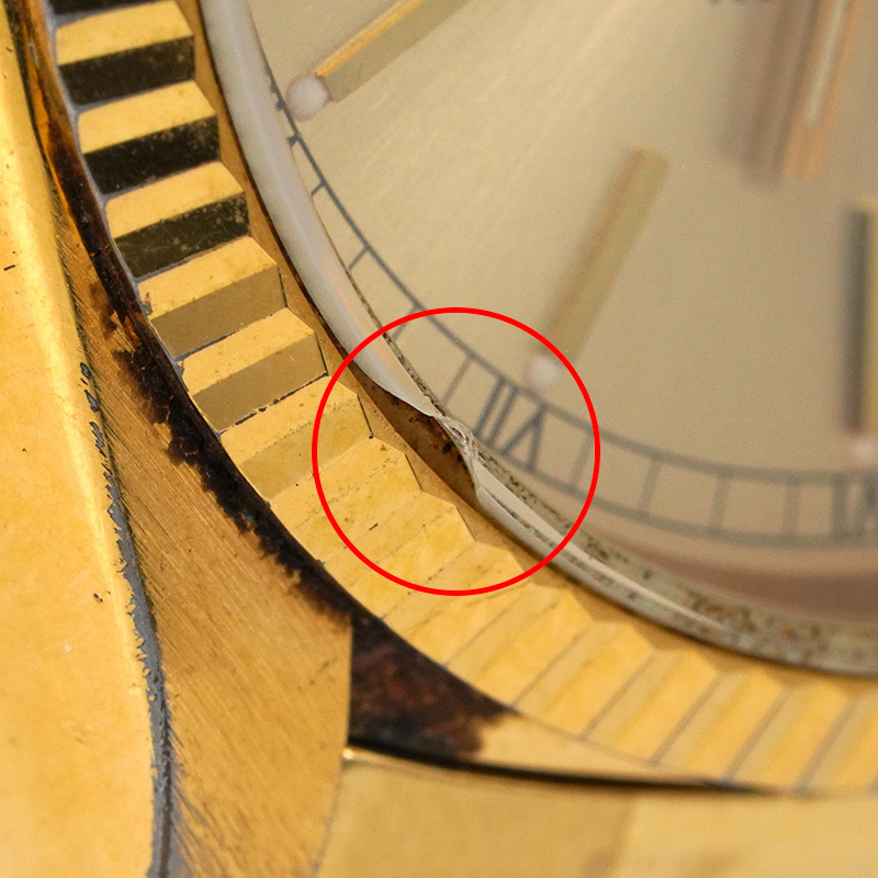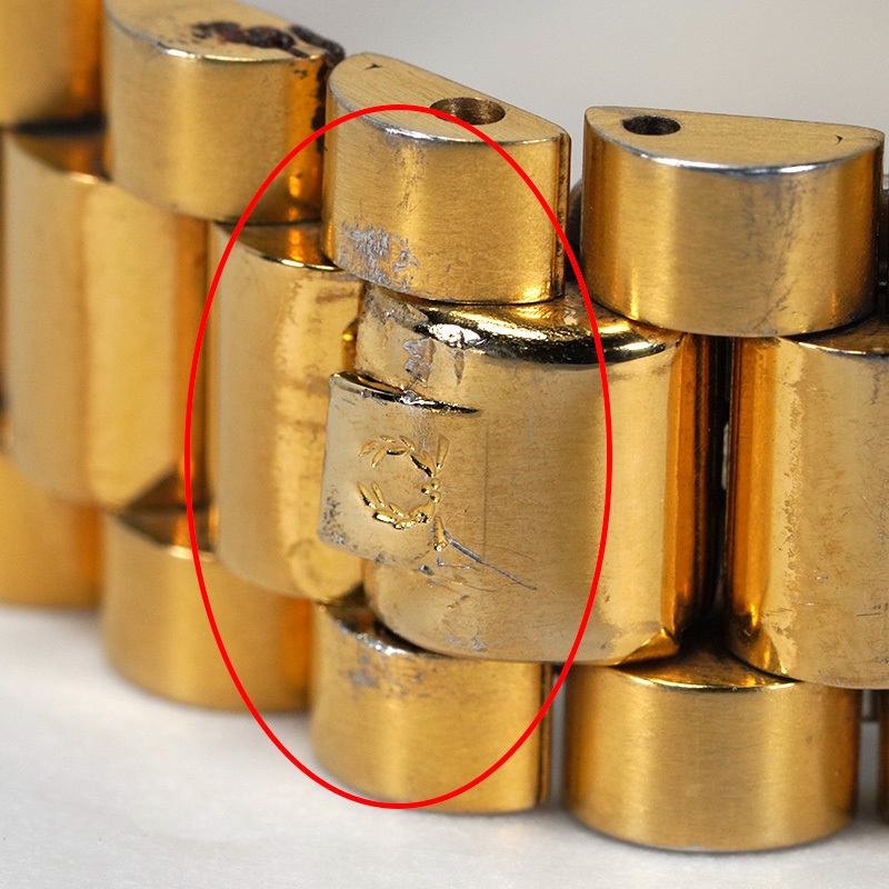 全体的に傷・メッキ剥げ・サビがございます。 風防に7時あたりに欠けが見られ、また曇っているように見えます。 ケースにも欠けがあります。 針とインデックスに腐食がございます。 バックルを閉めることはできますが、ゆるいくすぐに開いてしまう状態です。 リューズ操作にて日付と曜日の早送りは可能ですが、時間調整ができない稼働品でございます。 ジャンク品としてお考えください。 | |||