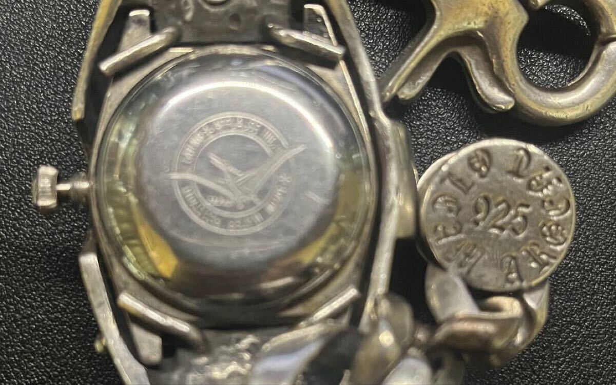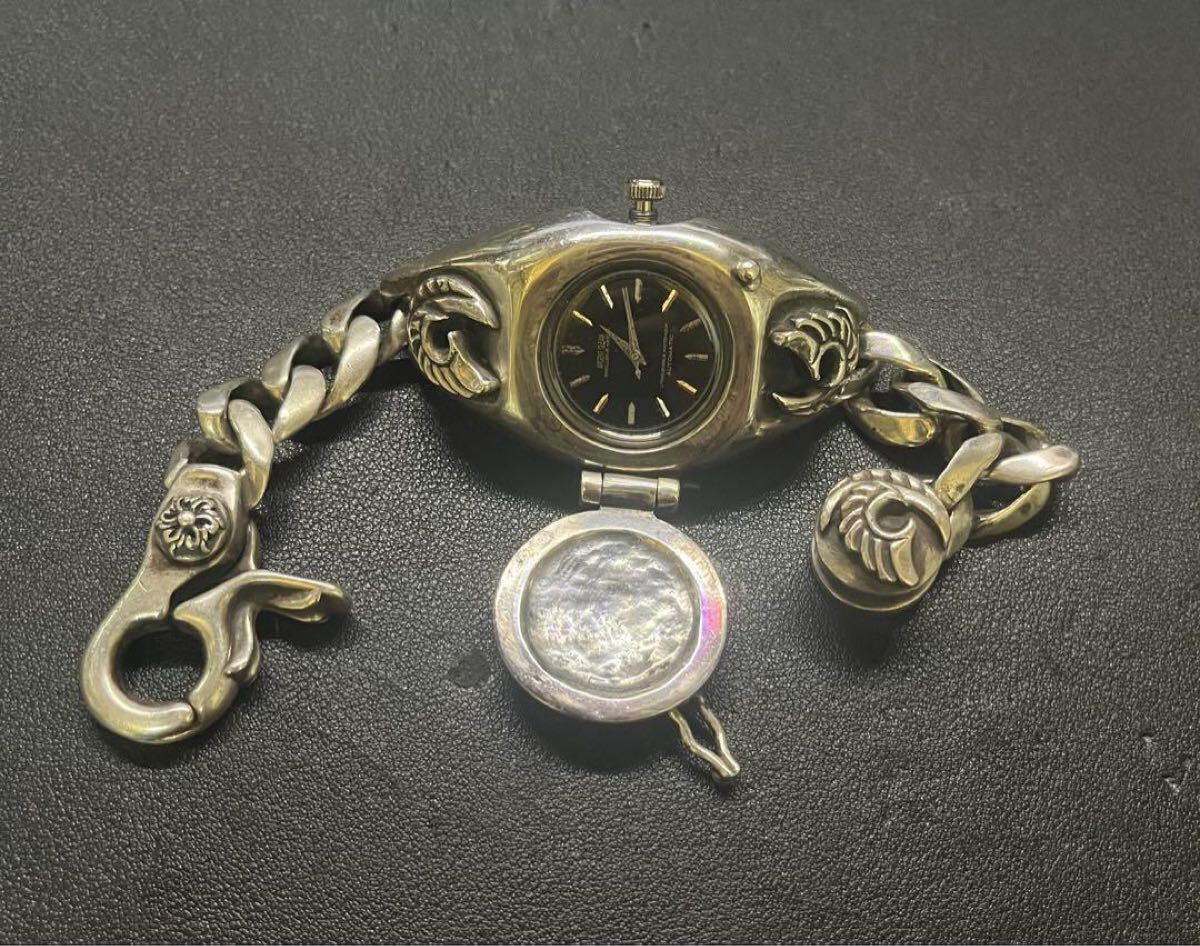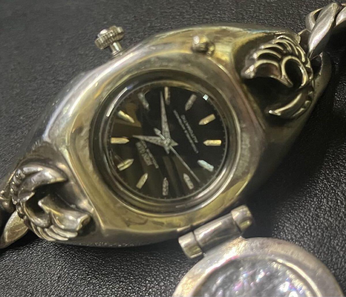 シルバー925 のリストウォッチケース 25年ほど前に購入しました。 蓋付きの時計は大変珍しいです。 紋様も大変珍しい紋様です。 ブレスレットはクリップ式になります。 クリップバネも問題はありません。 シルバー磨きにて手入れしましたり 時計は自動巻きにて問題なく動きます。 ただ時計の内側に細かいサビみたいなのがあります。 気になる方はメーカーでも交換できると思います。 経年劣化で細かいキズがありますが目立ったキズはございません。 写真にて判断してください。 付属品はございません。 神経質な方のご購入はご遠慮ください。 ノークレーム、ノーリターンで宜しくお願いします。 文字盤 カラー ブラック 文字針 シルバー色 秒針あり 全長16.2cm 文字盤カラーブラック ベルトカラーシルバー ムーブメント自動巻き式