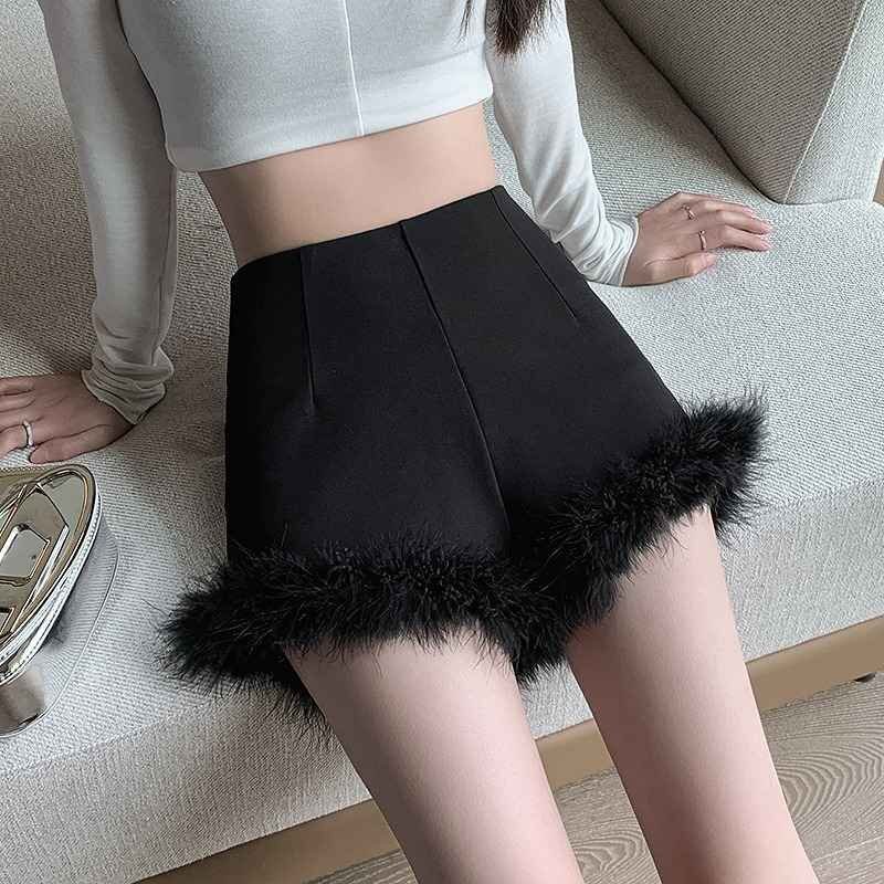 ショートパンツ ショーパン ファー付き シンプル カジュアル 無地 かわいい ボトムス ホットパンツ ハーフパンツ もこもこ 秋冬 M ブラック