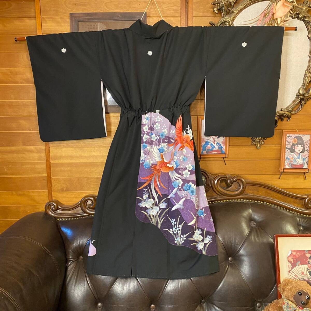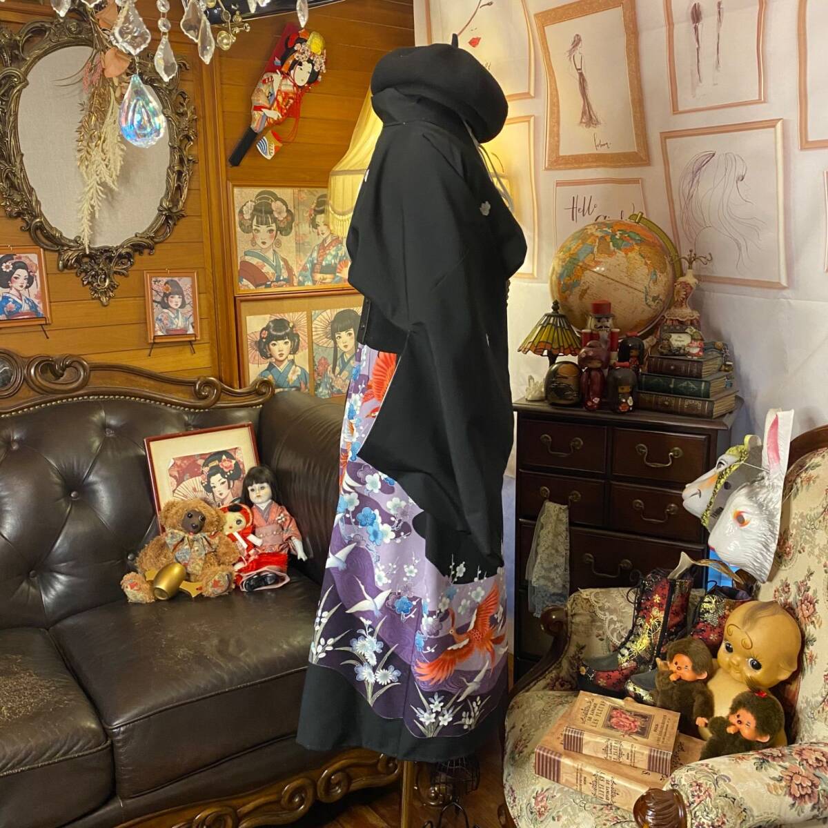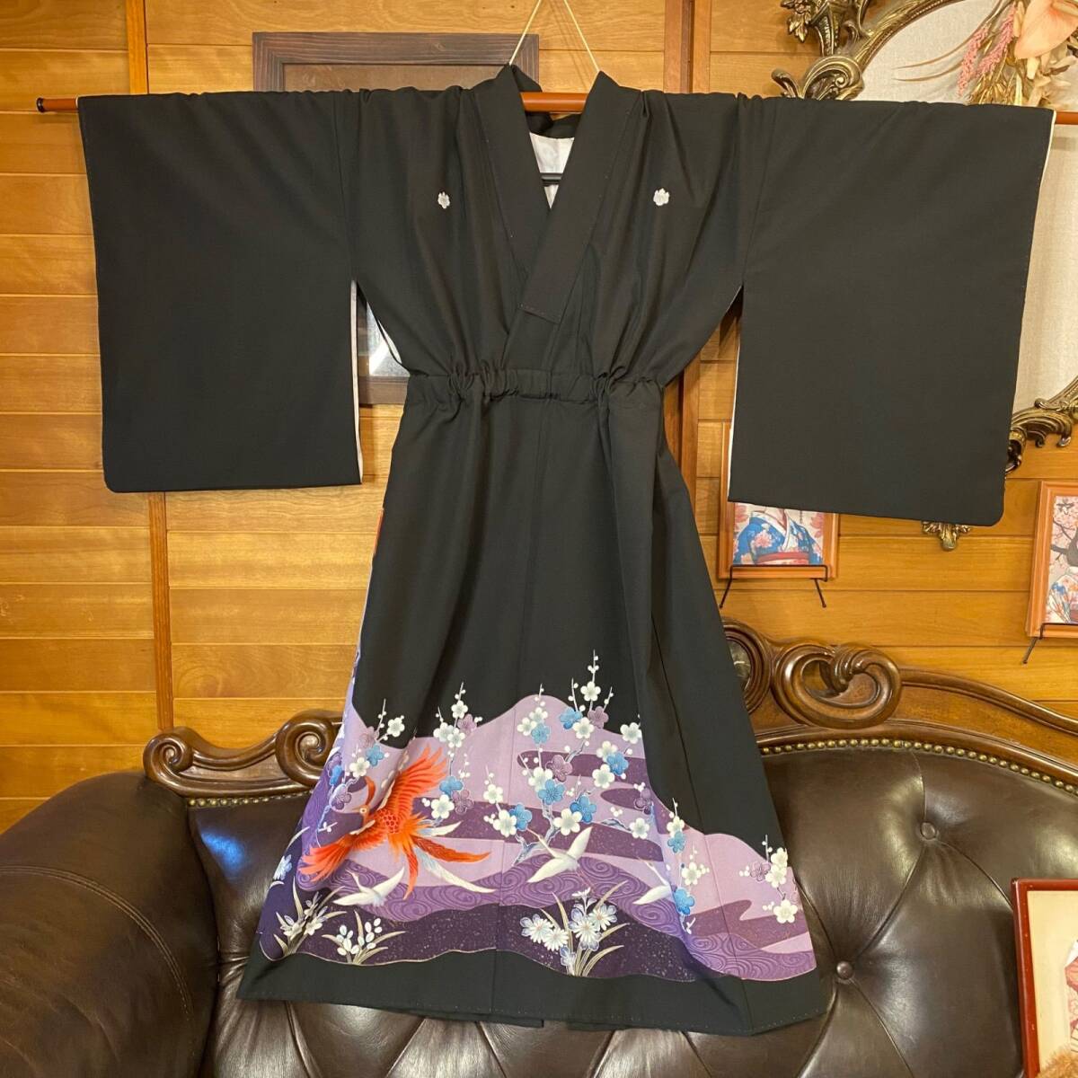 【 黒留袖 着物 リメイク ワンピース ドレス 和洋折衷 洗える 化繊 ハンドメイド レトロ 古着 漆黒に紫霞、鳳凰と白梅、凛と艶。 TKW-84】
