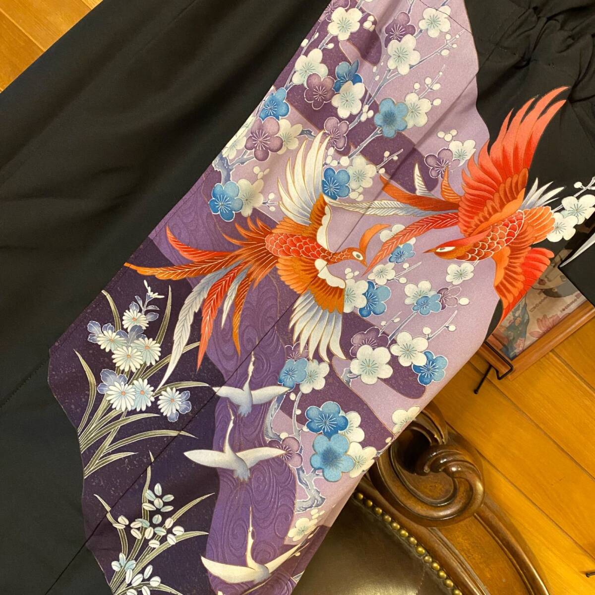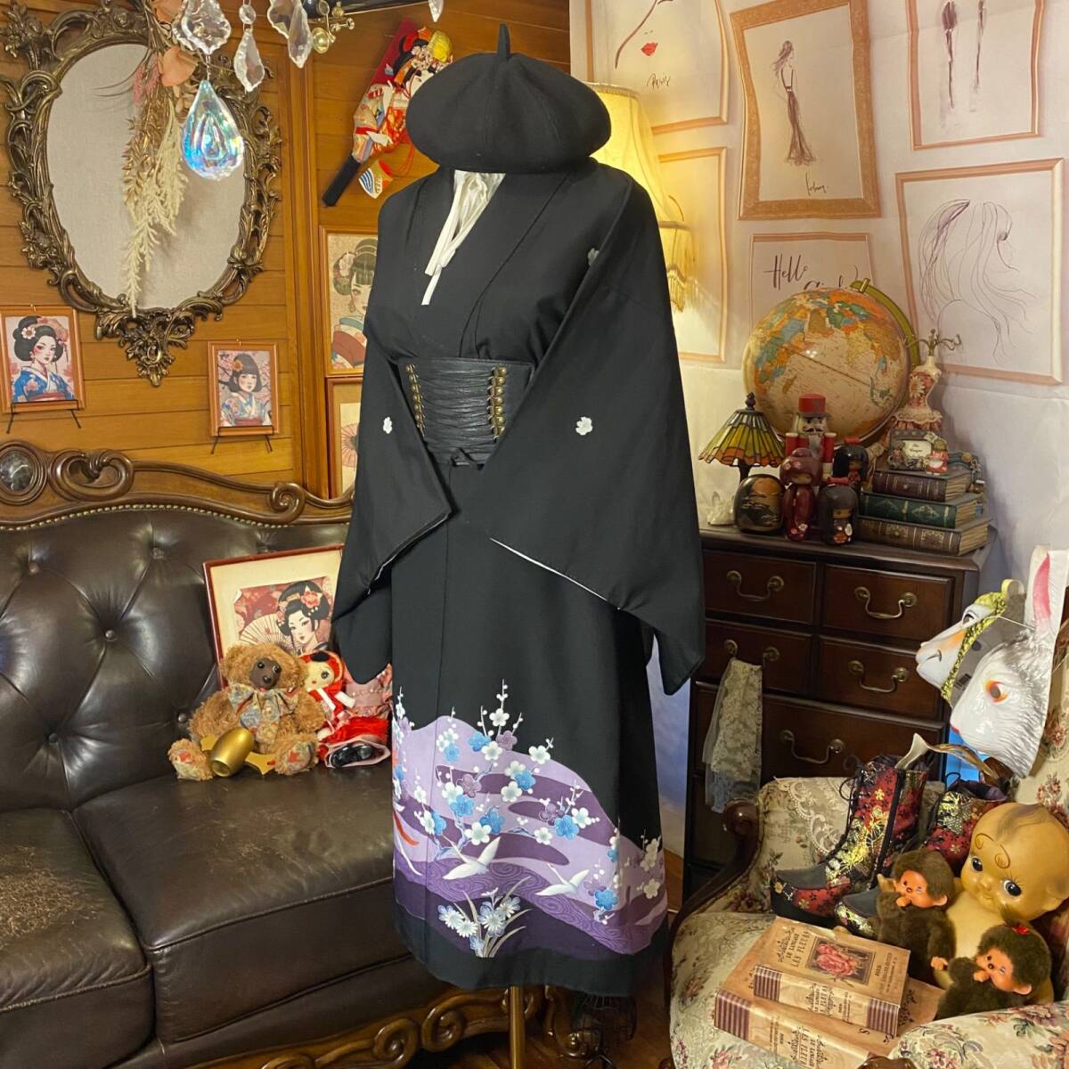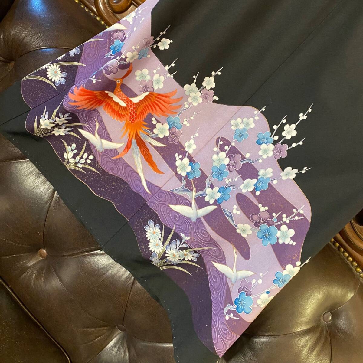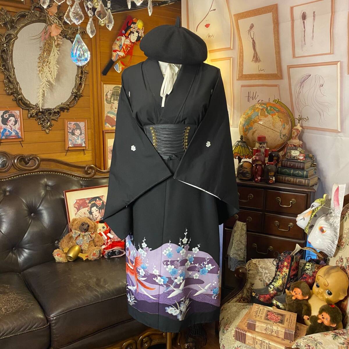 【 黒留袖 着物 リメイク ワンピース ドレス 和洋折衷 洗える 化繊 ハンドメイド レトロ 古着 漆黒に紫霞、鳳凰と白梅、凛と艶。 TKW-84】