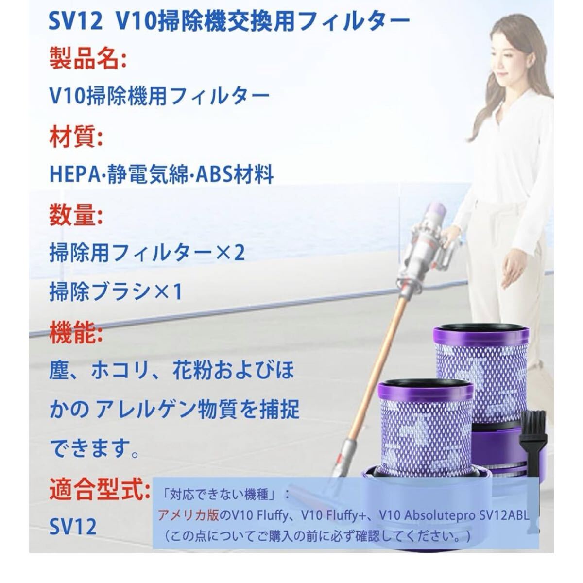 「対応できない機種」:アメリカ版(側面の外観が異なるので、チェックしてください。)のV10 Fluffy、V10 Fluffy+、V10 Absolutepro SV12ABL(この点についてご購入の前に必ず確認してください。)